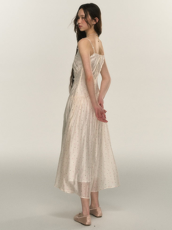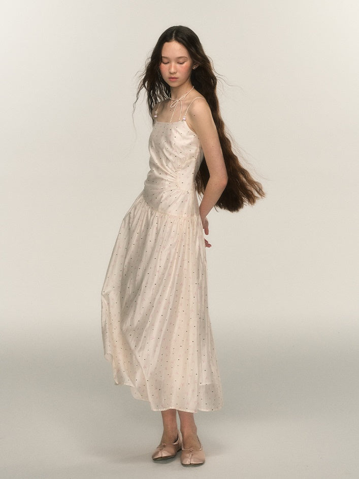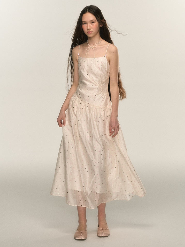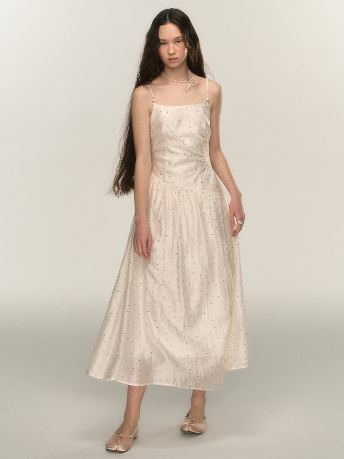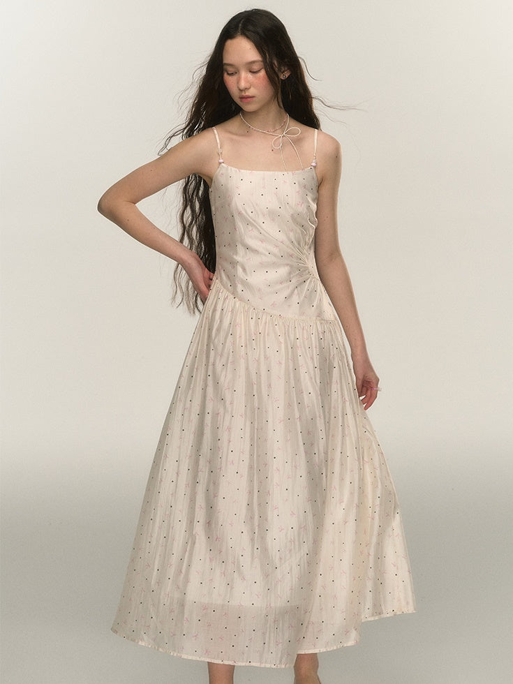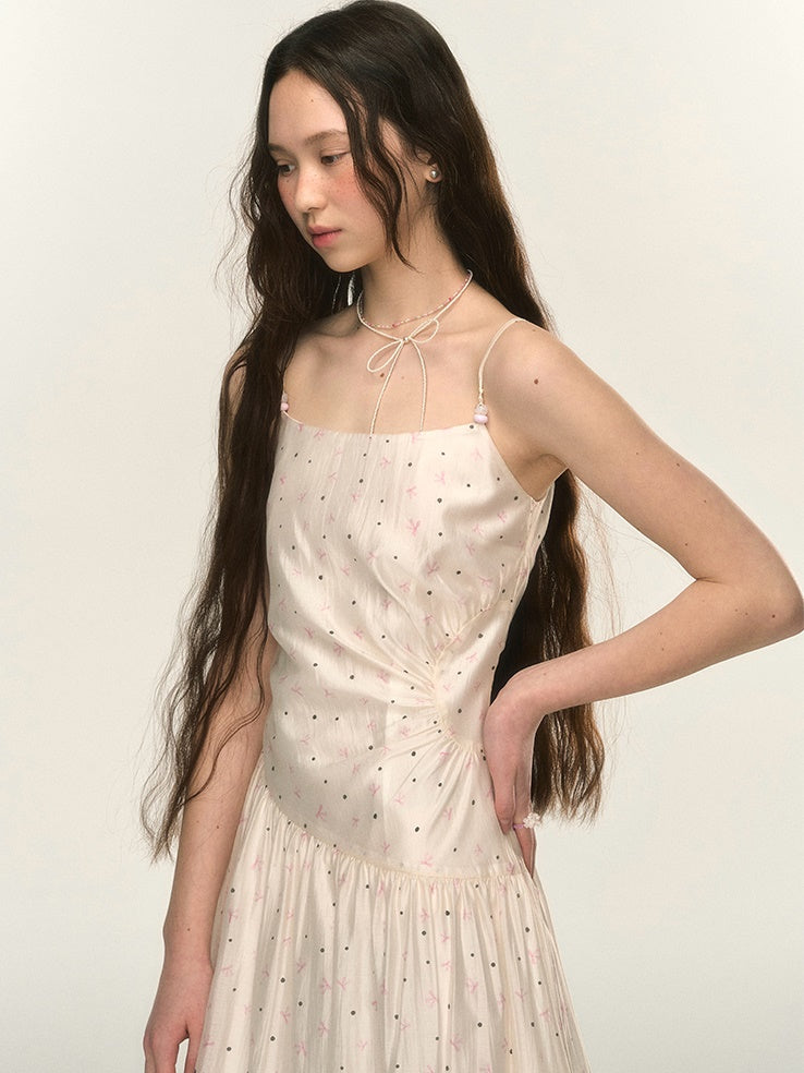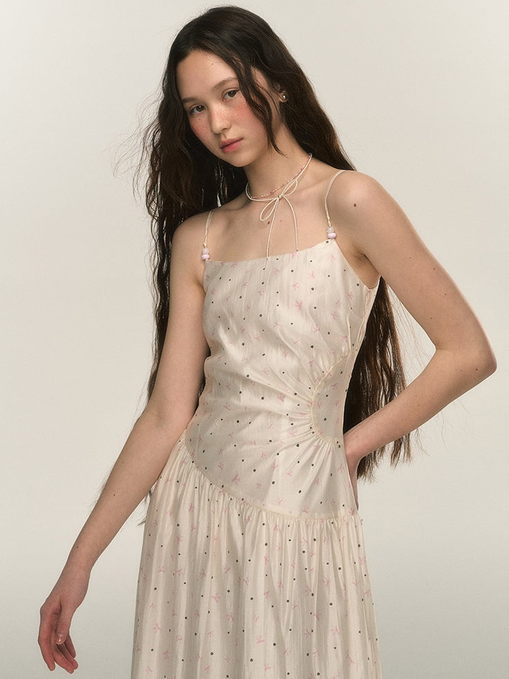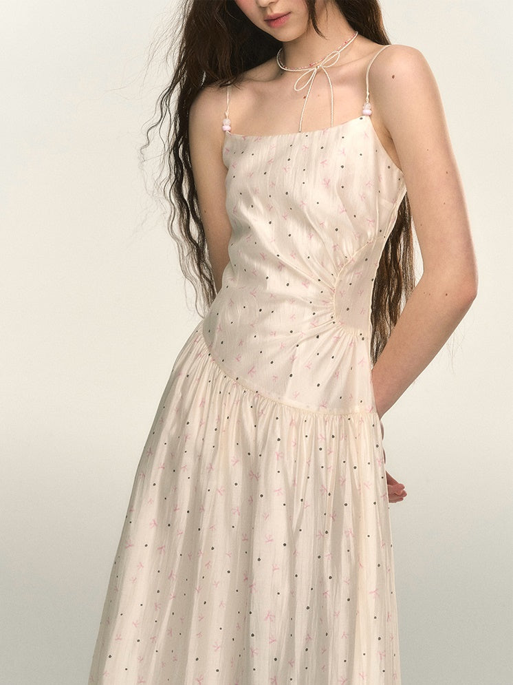 Polka Dot Bow Print Irregular Waist Suspender Long Dress
