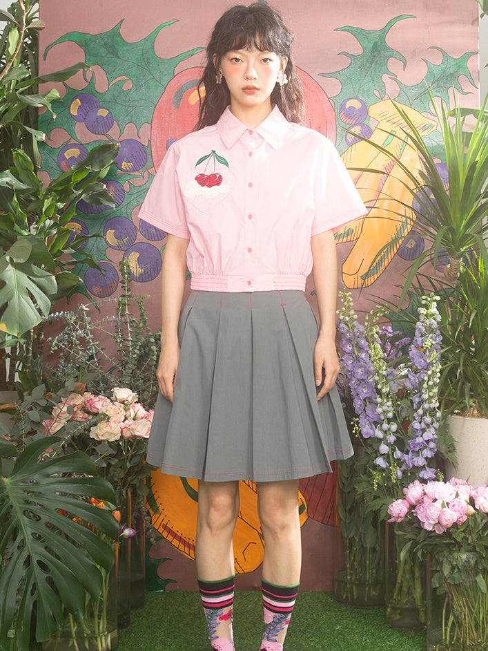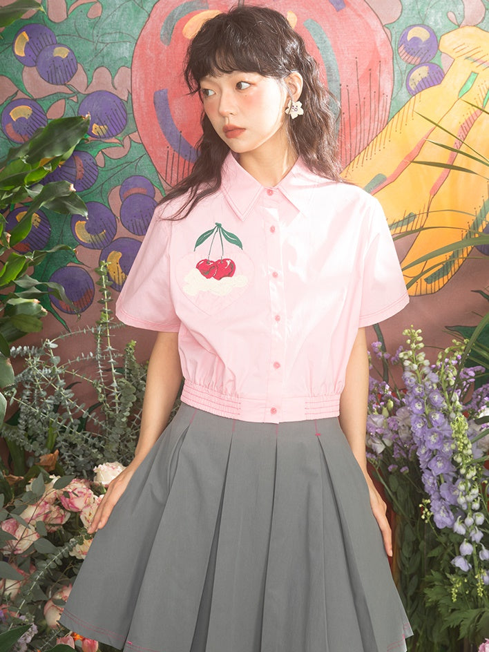 Retro Cream Cherry Embroidered Short-sleeved Shirt