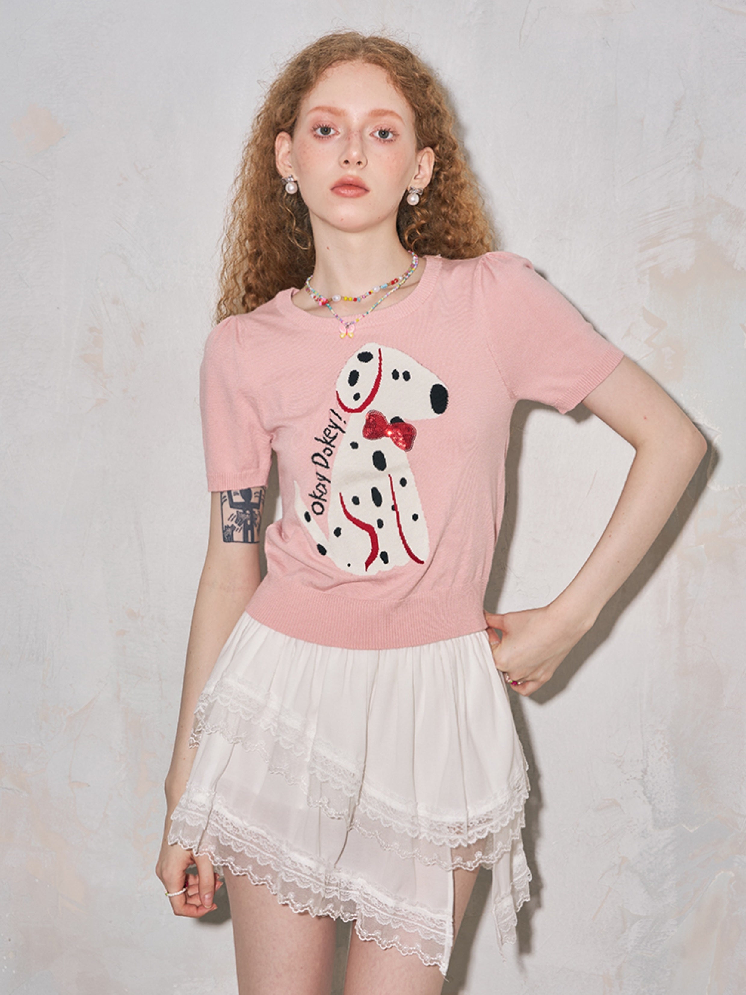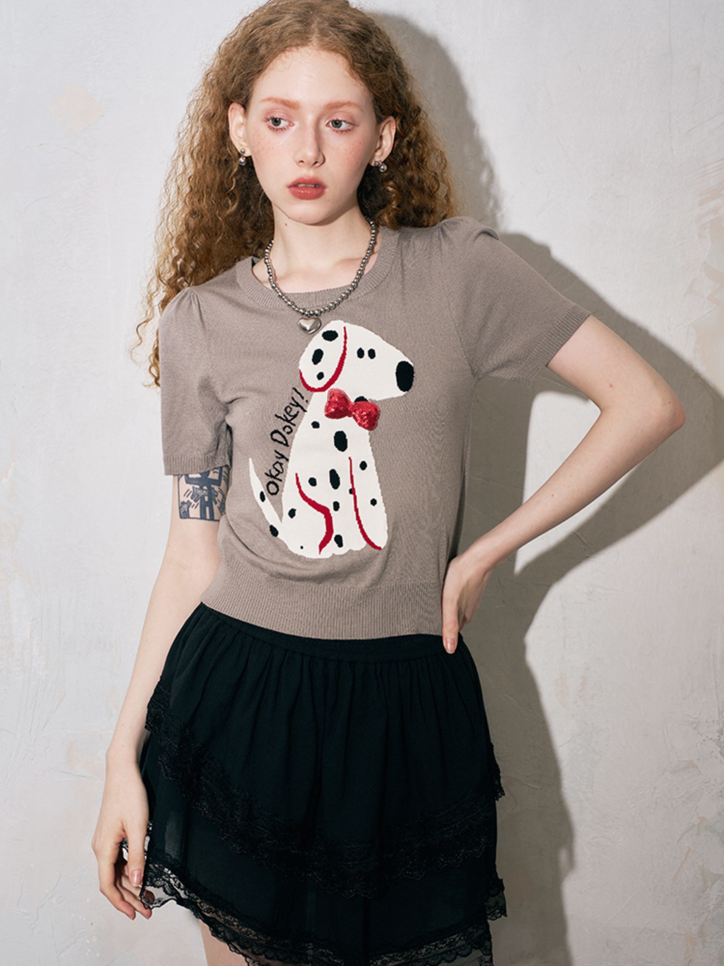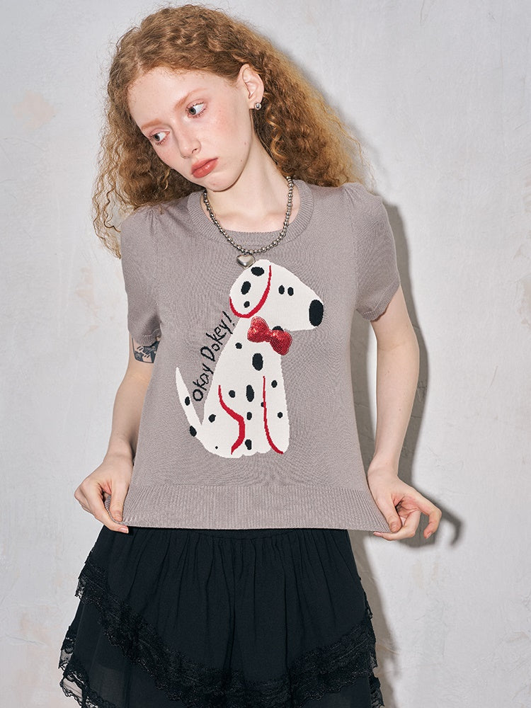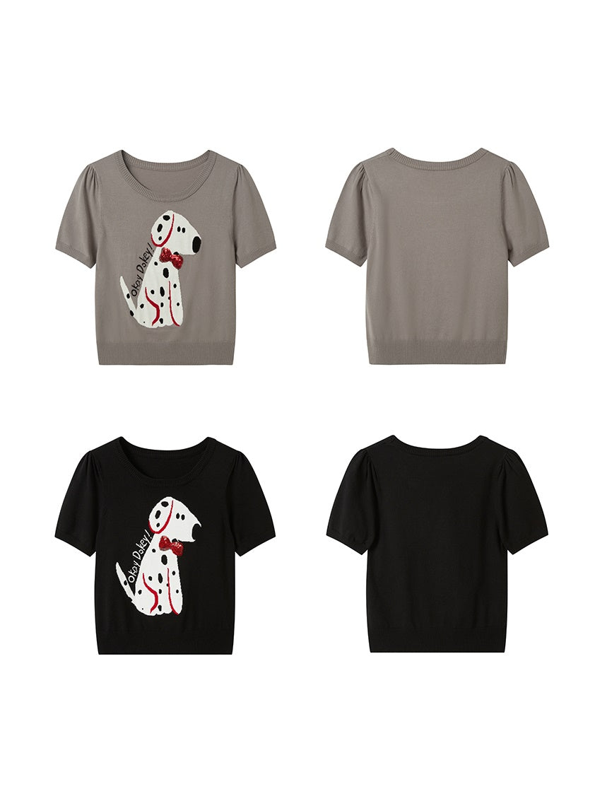 Round Neck Short-sleeved Spotted Dog Knitted Top