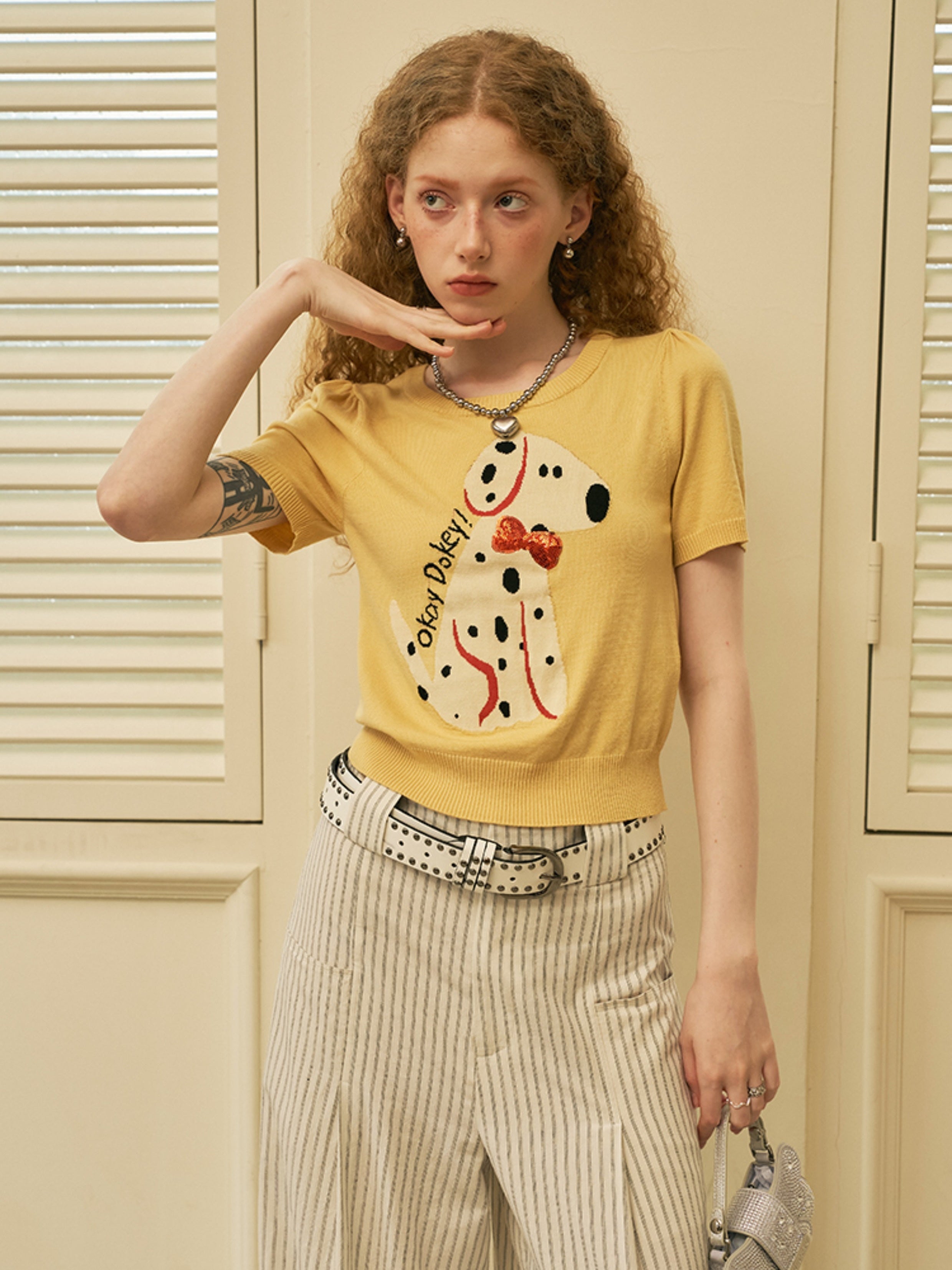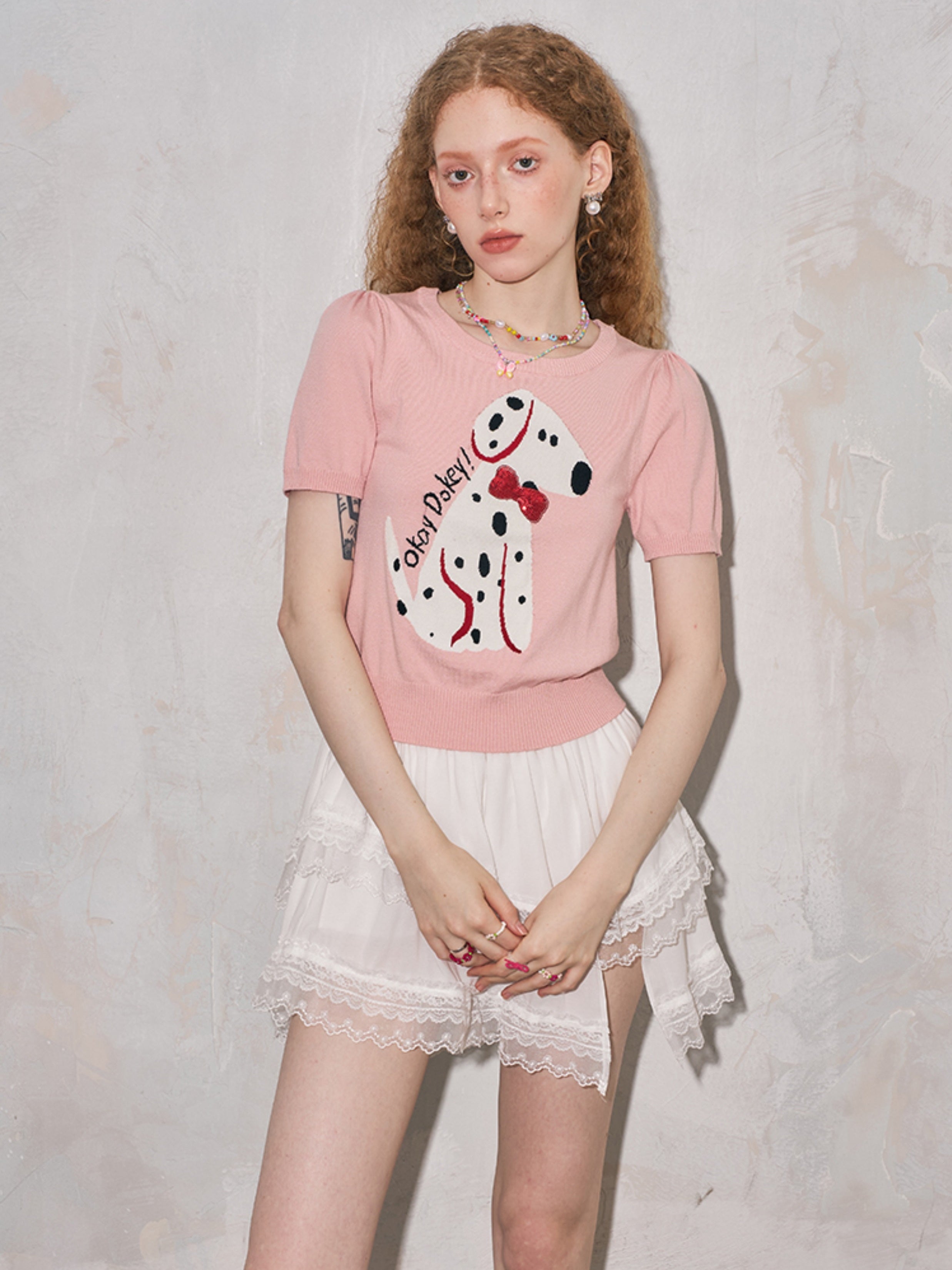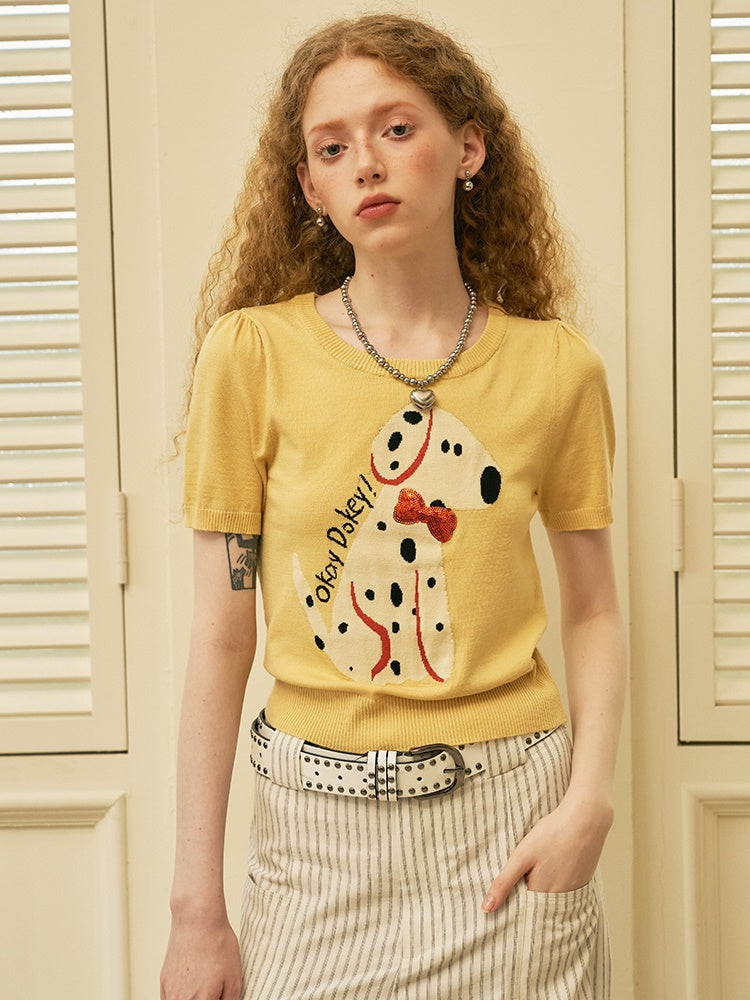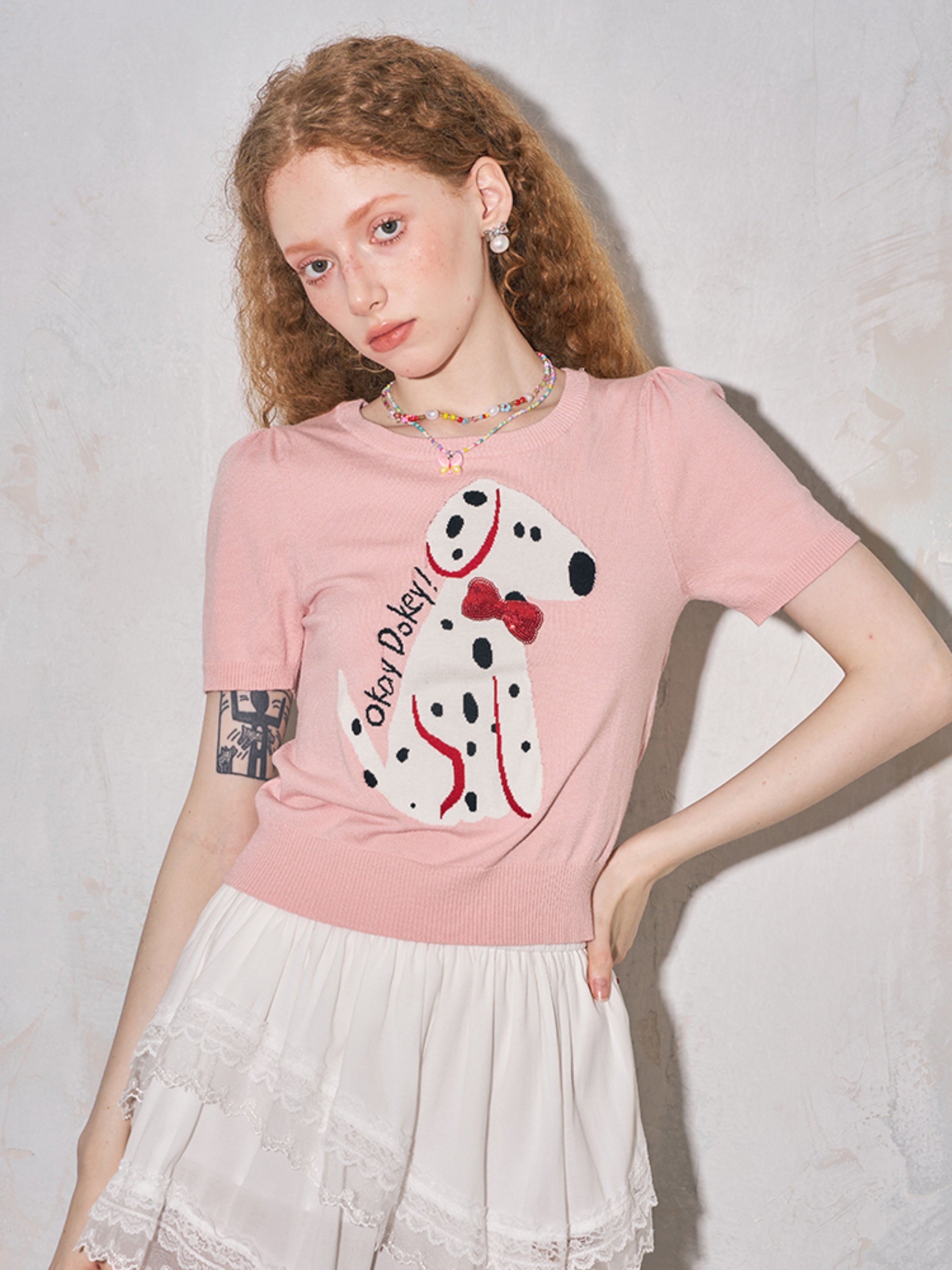 Round Neck Short-sleeved Spotted Dog Knitted Top