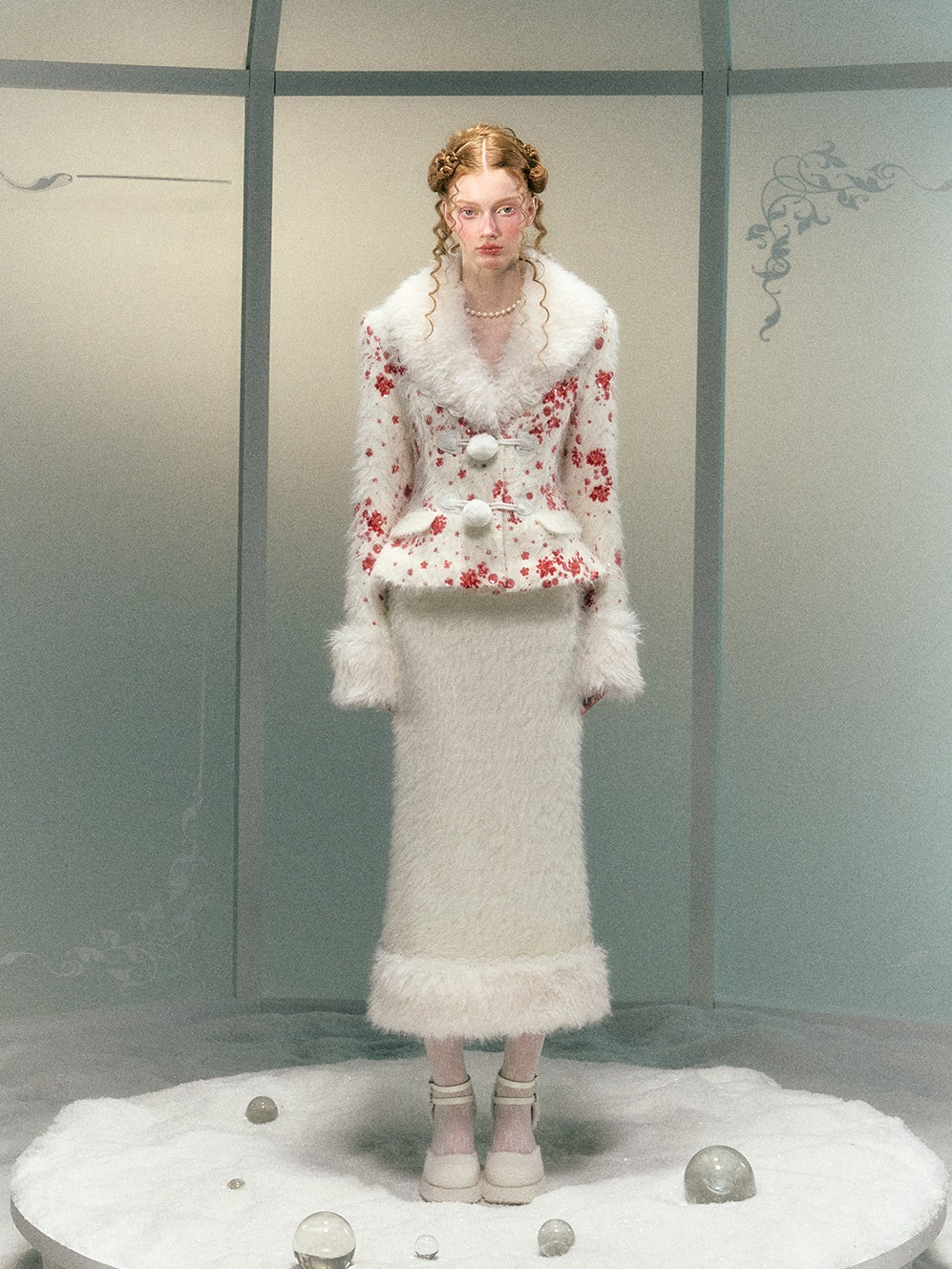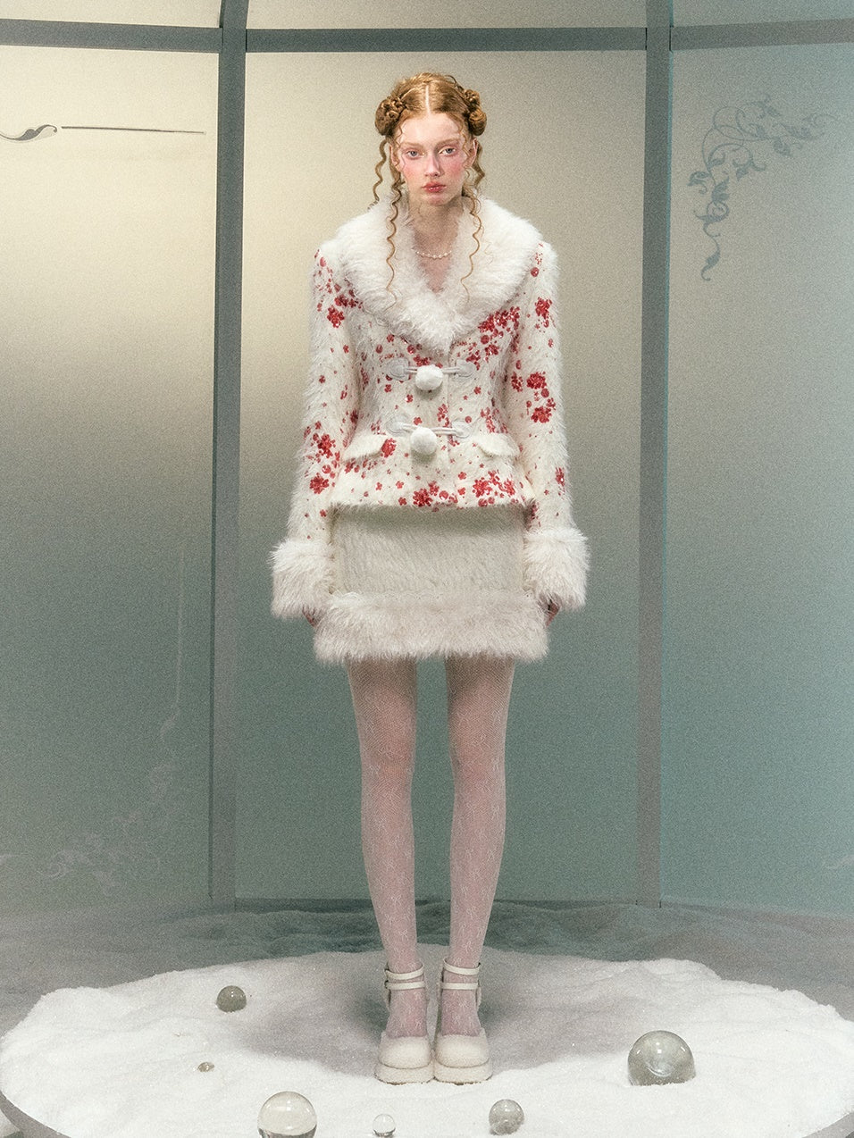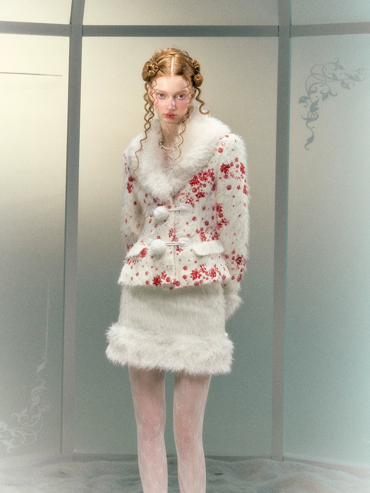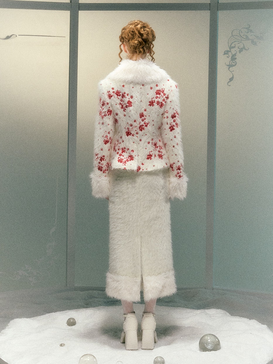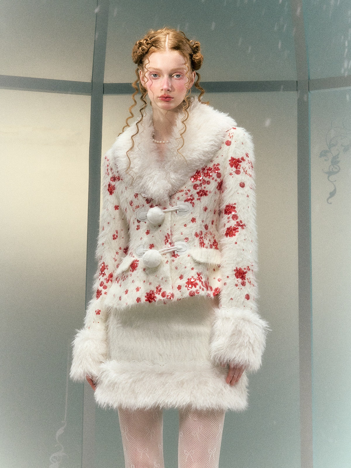 Sequined Embroidery Fur Collar Waisted Jacket & Skirt