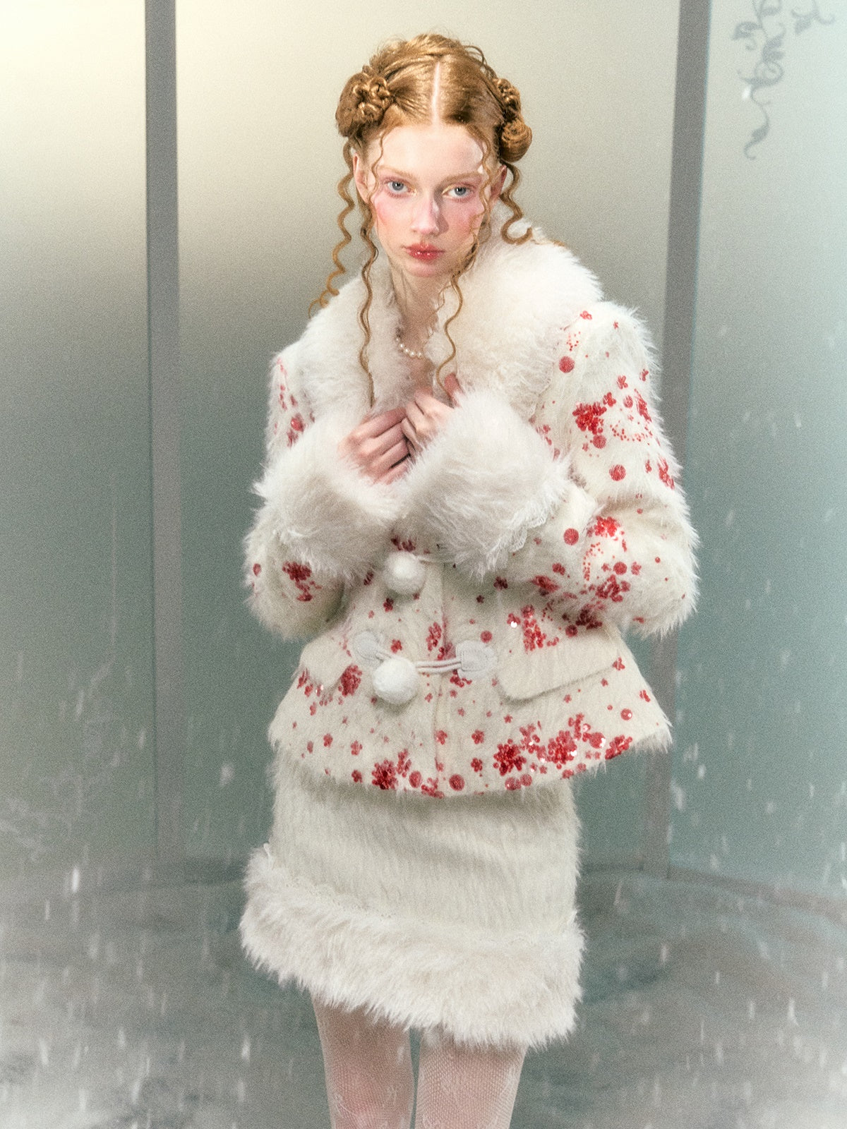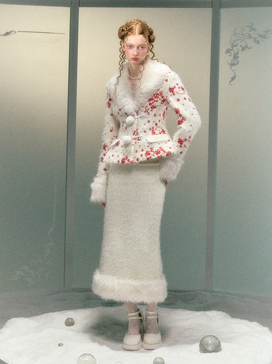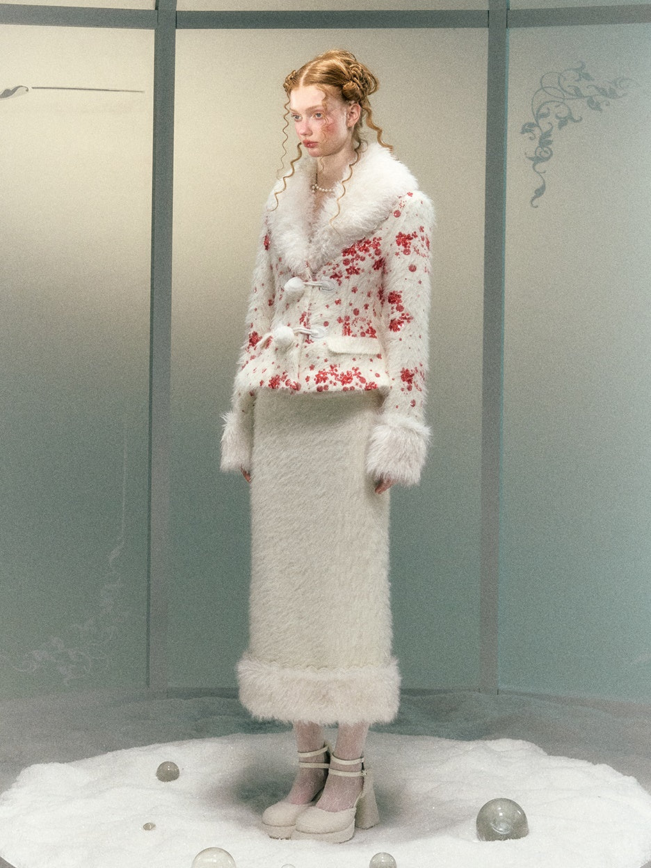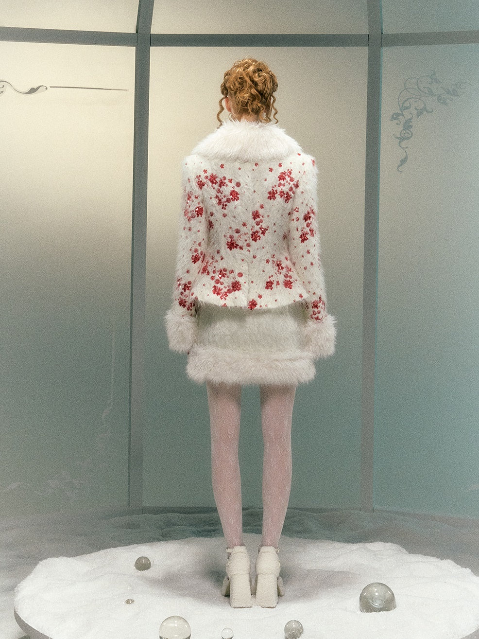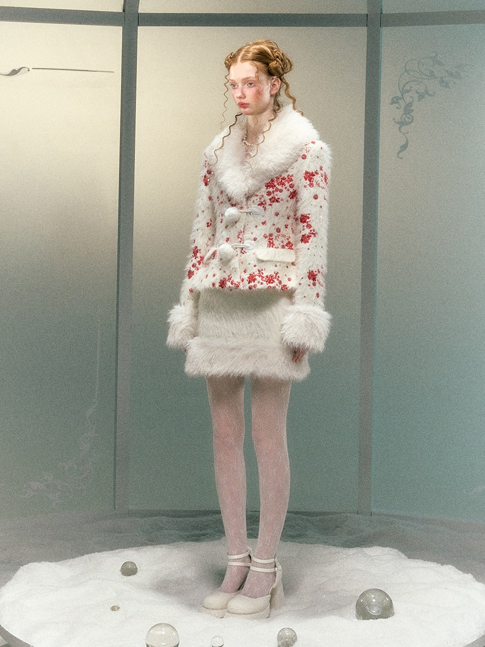 Sequined Embroidery Fur Collar Waisted Jacket & Skirt