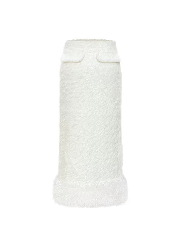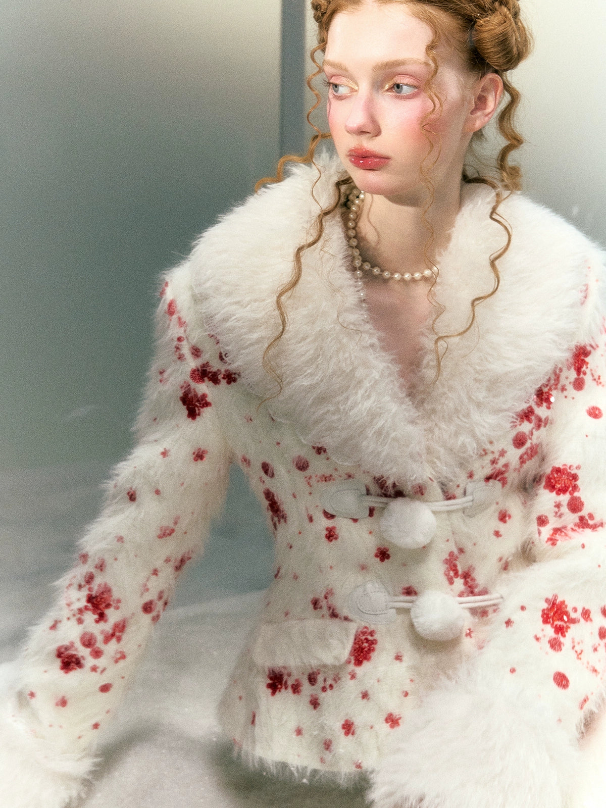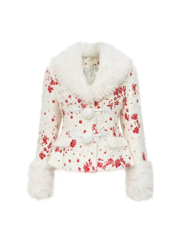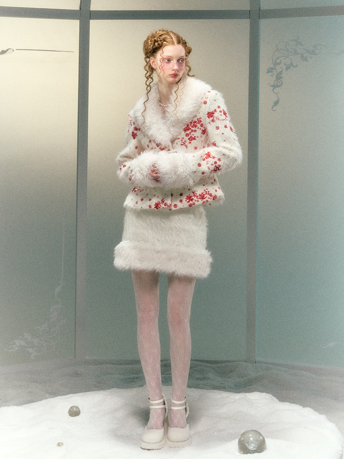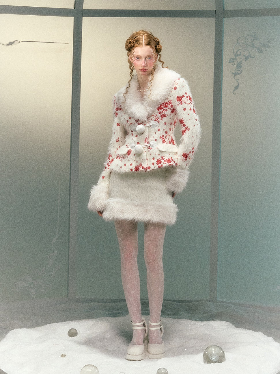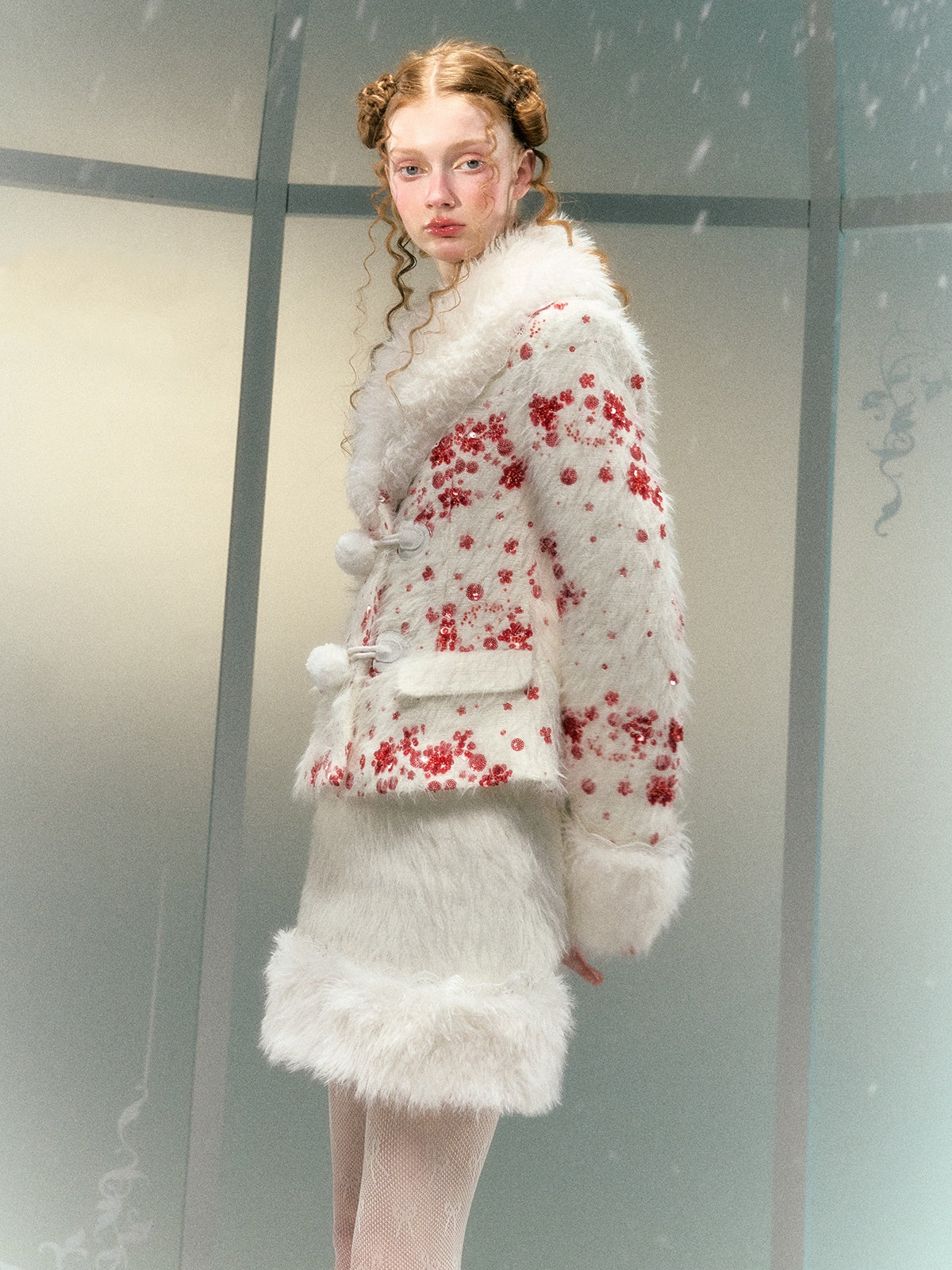 Sequined Embroidery Fur Collar Waisted Jacket & Skirt