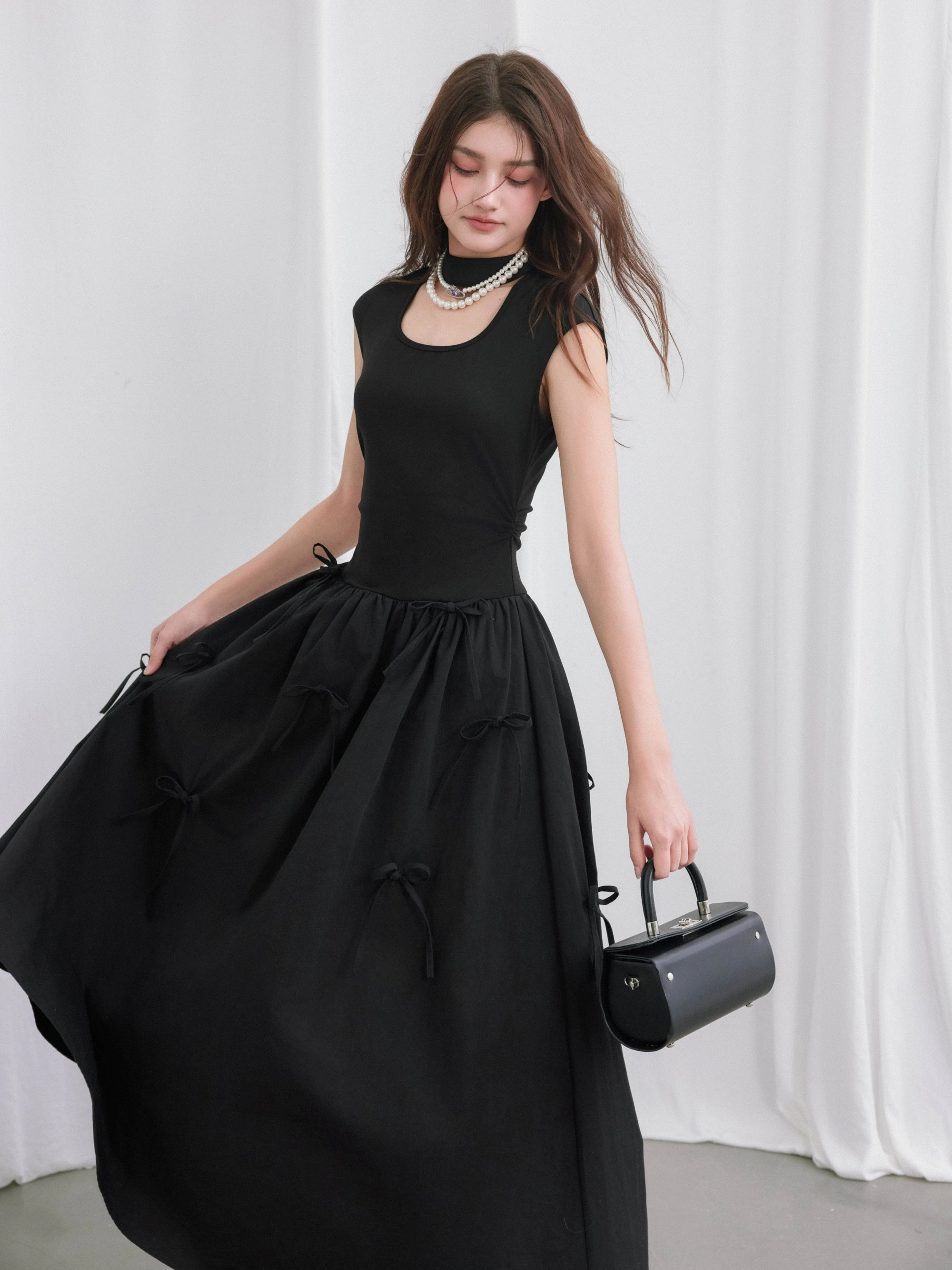 Square Cutout Stand Collar Bow Long Dress