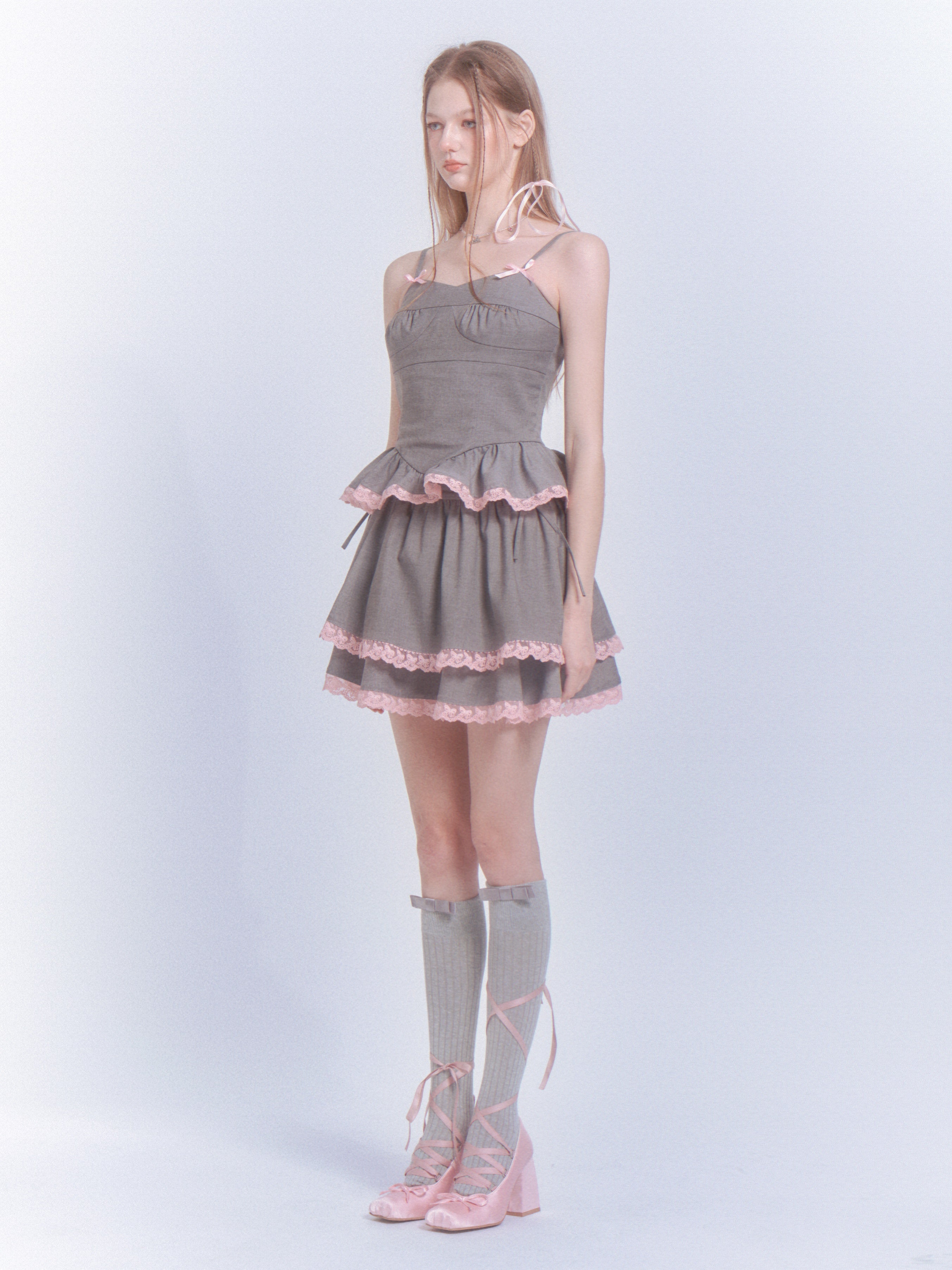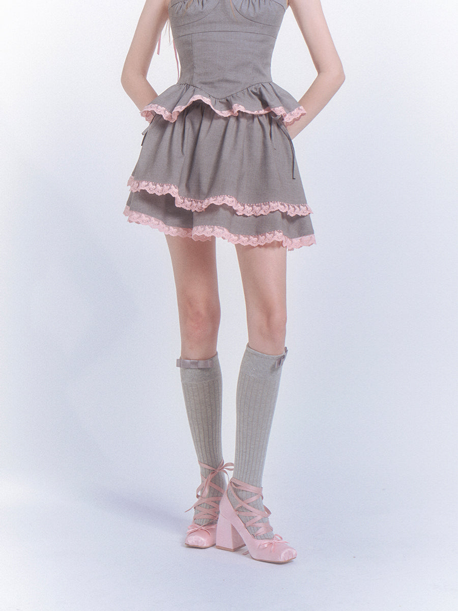 Stitching Lace Pleated Suspenders Top & Cake Skirt