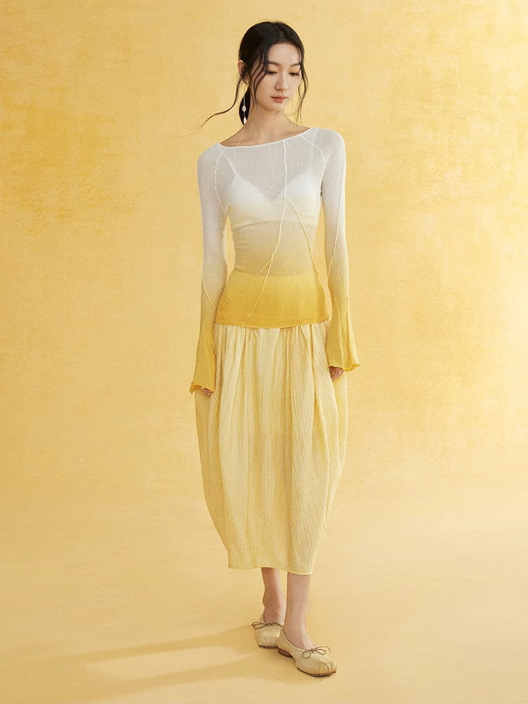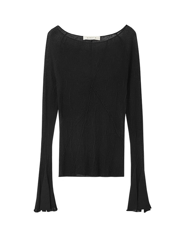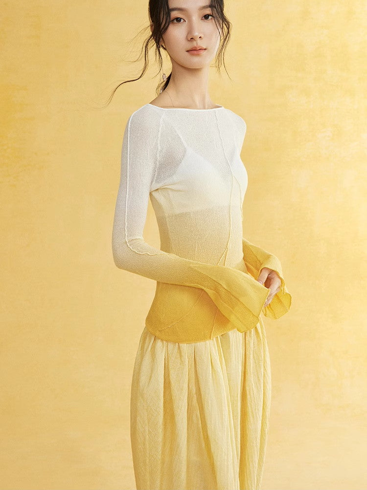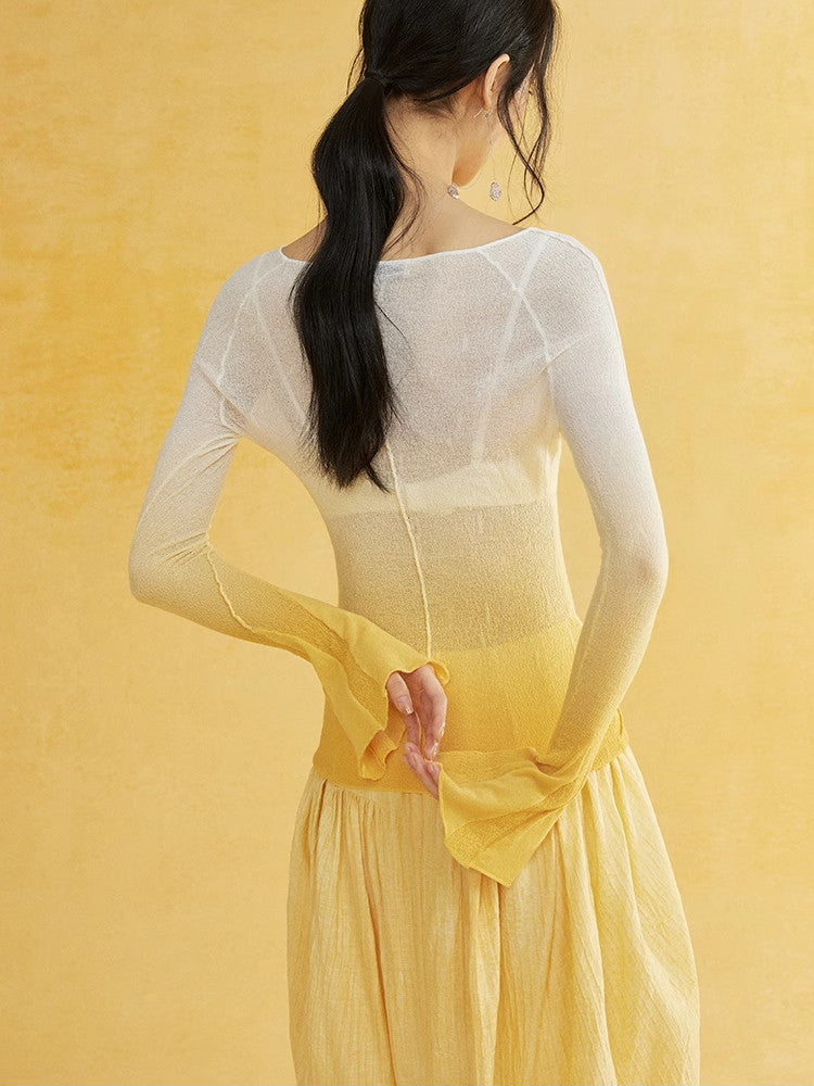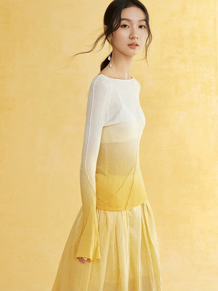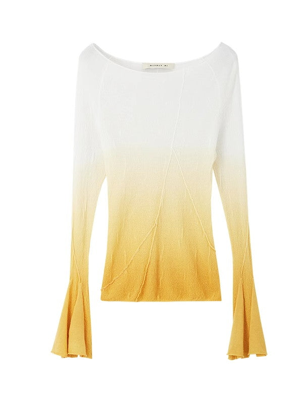Thin Flare-Sleeve Gradation Chic Nichi Boat-Neck Tight Knit