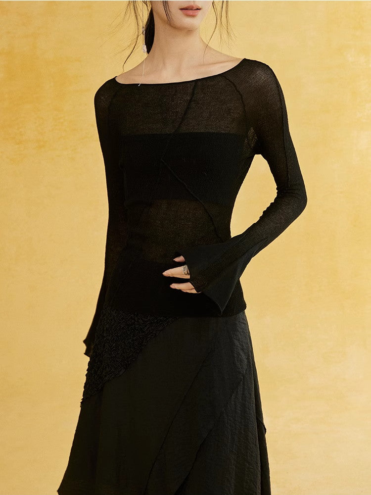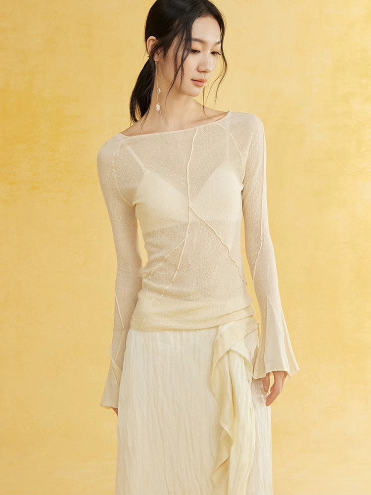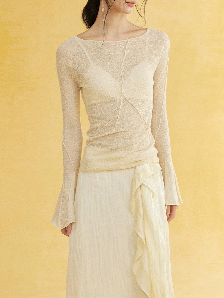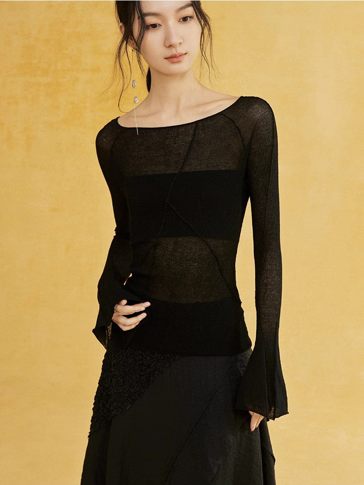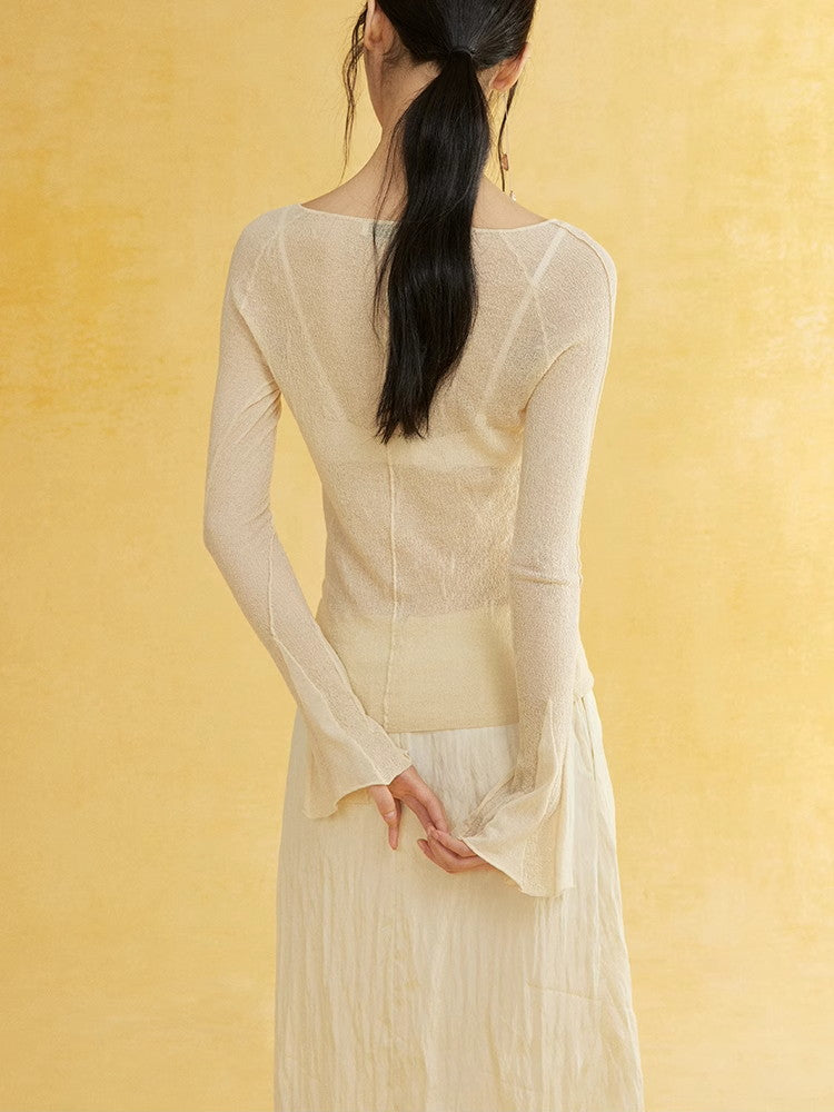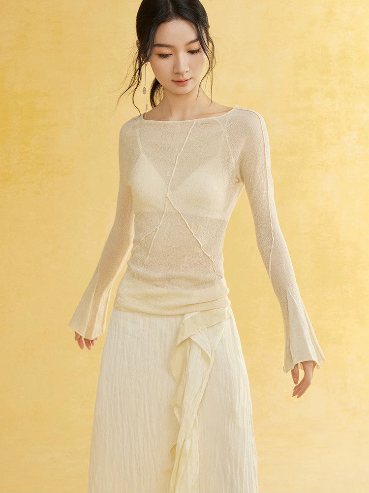 Thin Flare-Sleeve Gradation Chic Nichi Boat-Neck Tight Knit
