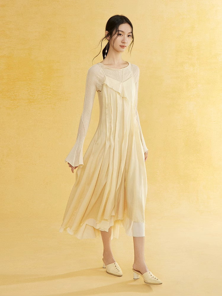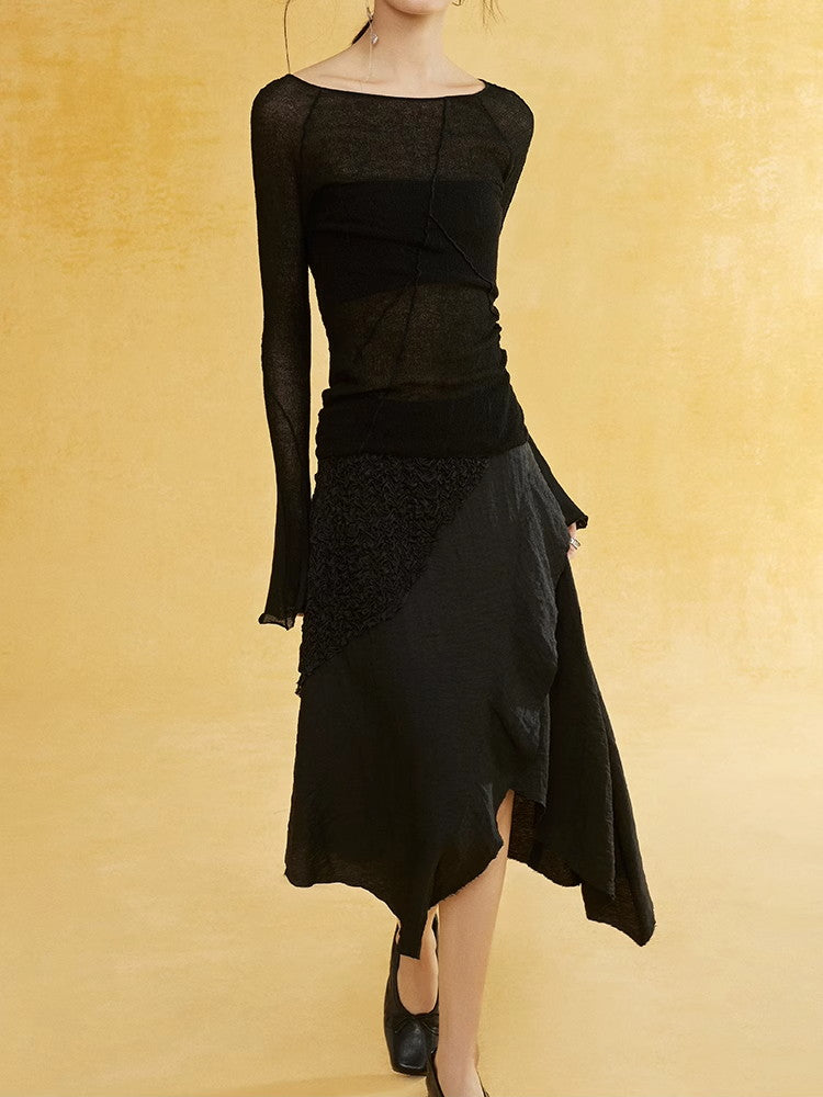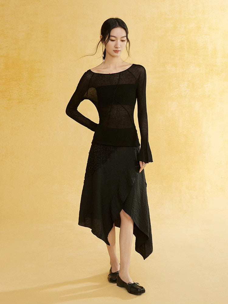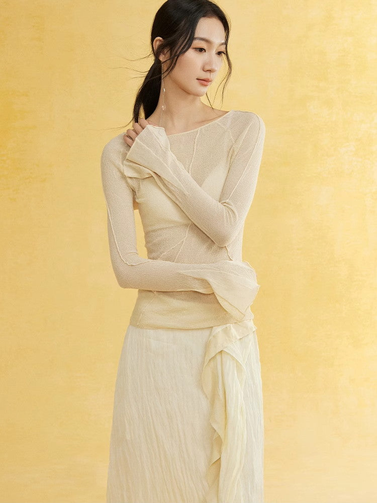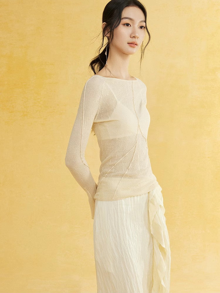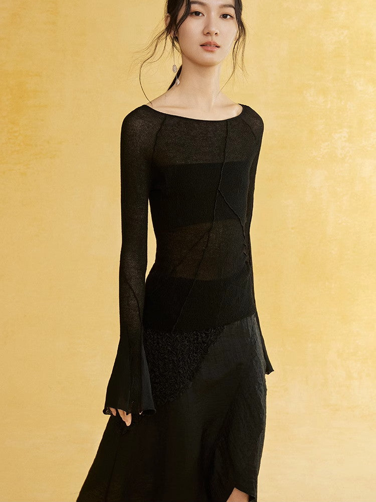 Thin Flare-Sleeve Gradation Chic Nichi Boat-Neck Tight Knit