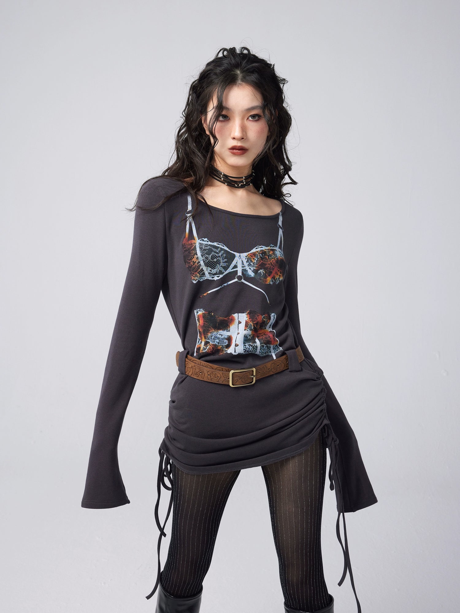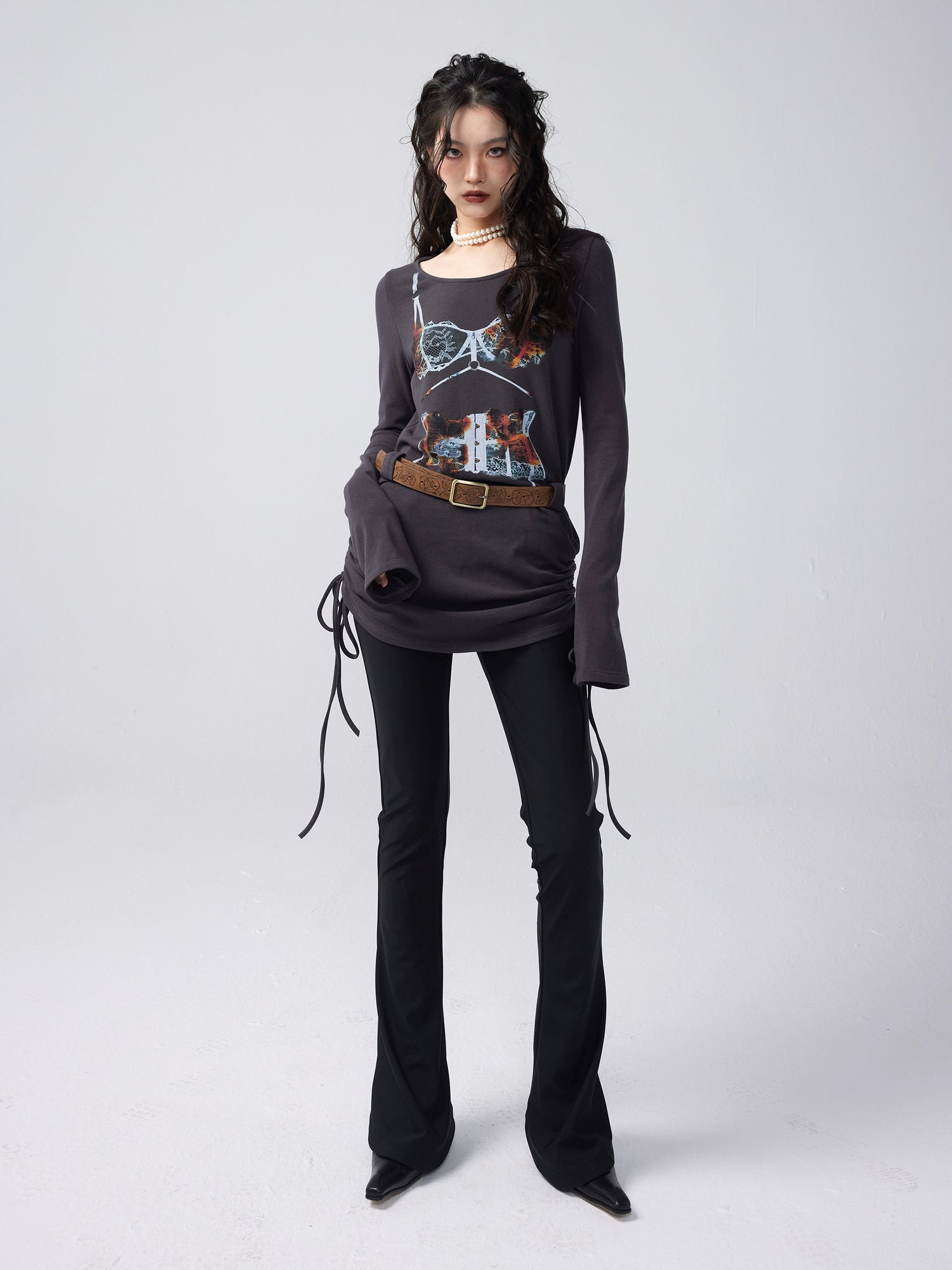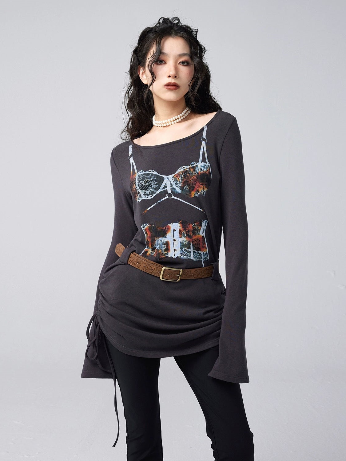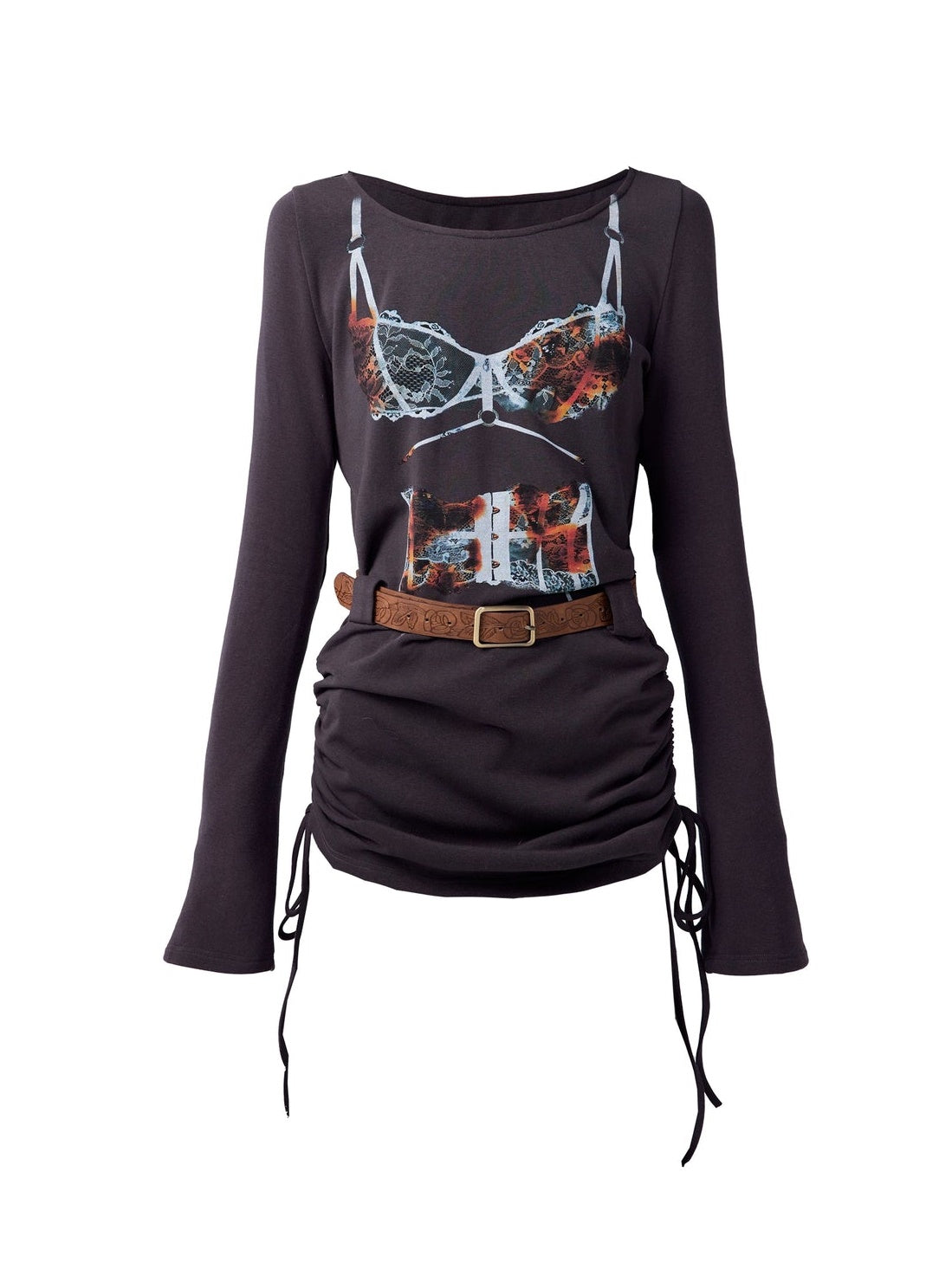 Trompe L'oeil Print One-Line Collar Long Sleeve T-shirt