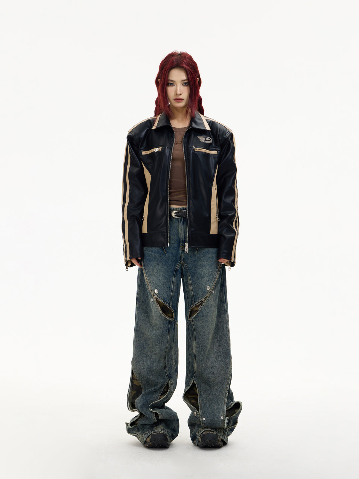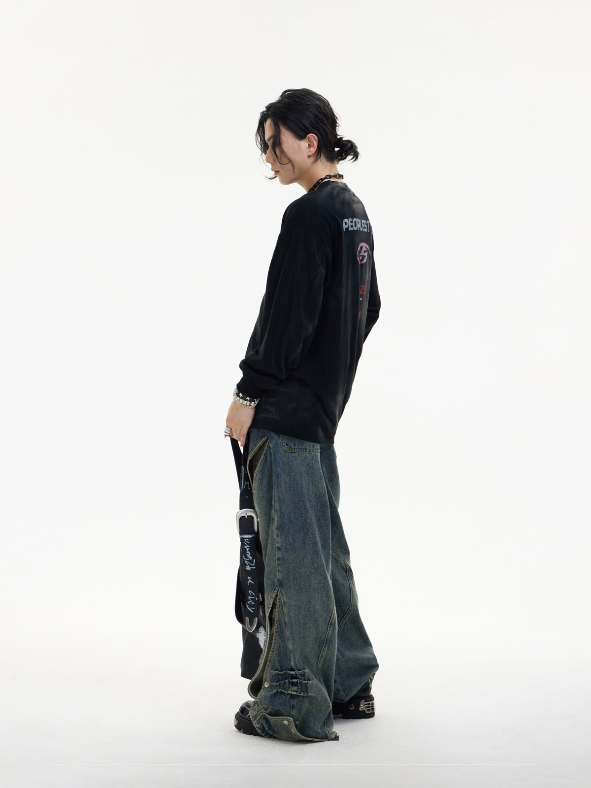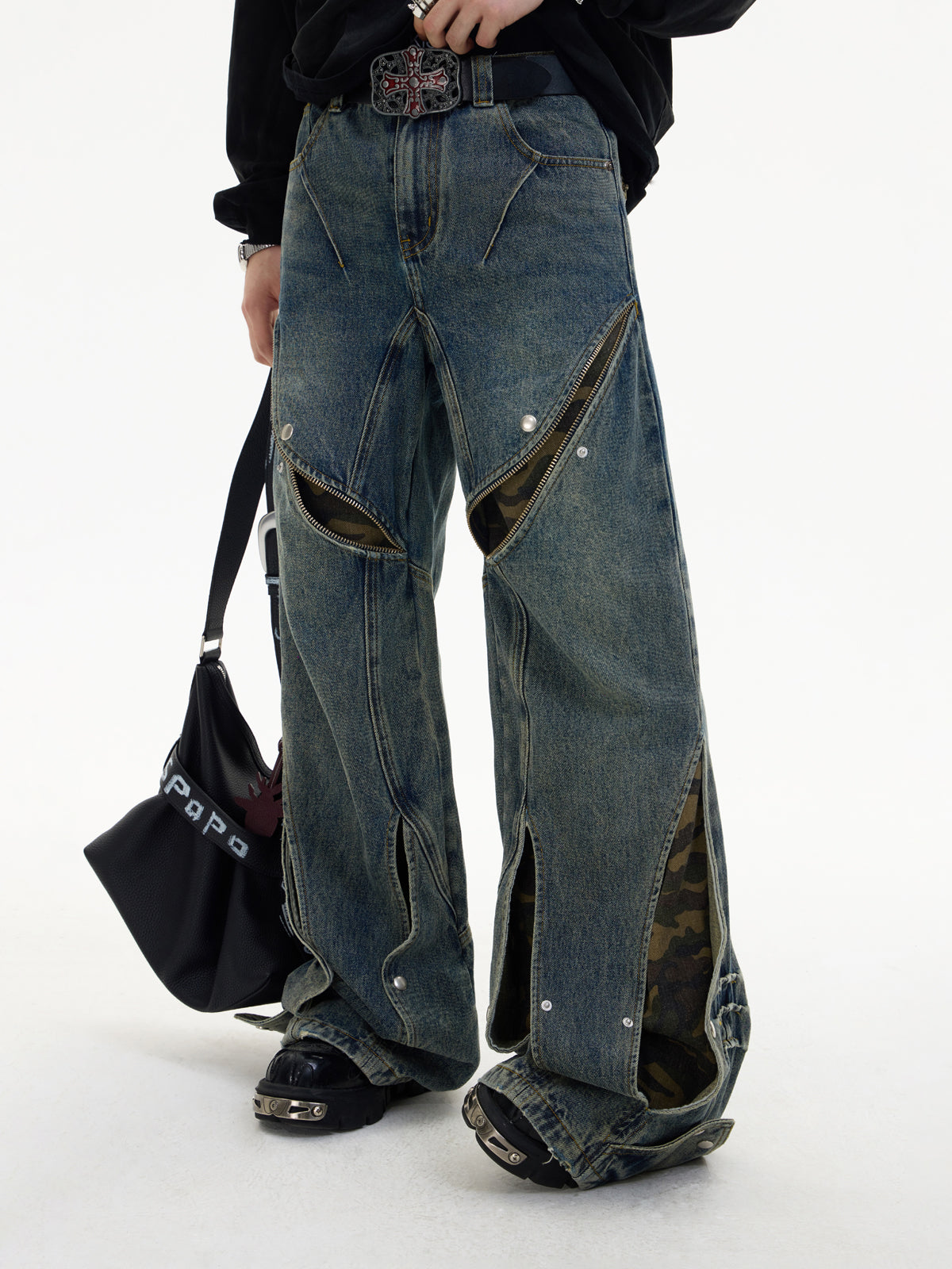 Zipper Hollow Camouflage Splicing Loose Wide-leg Jeans