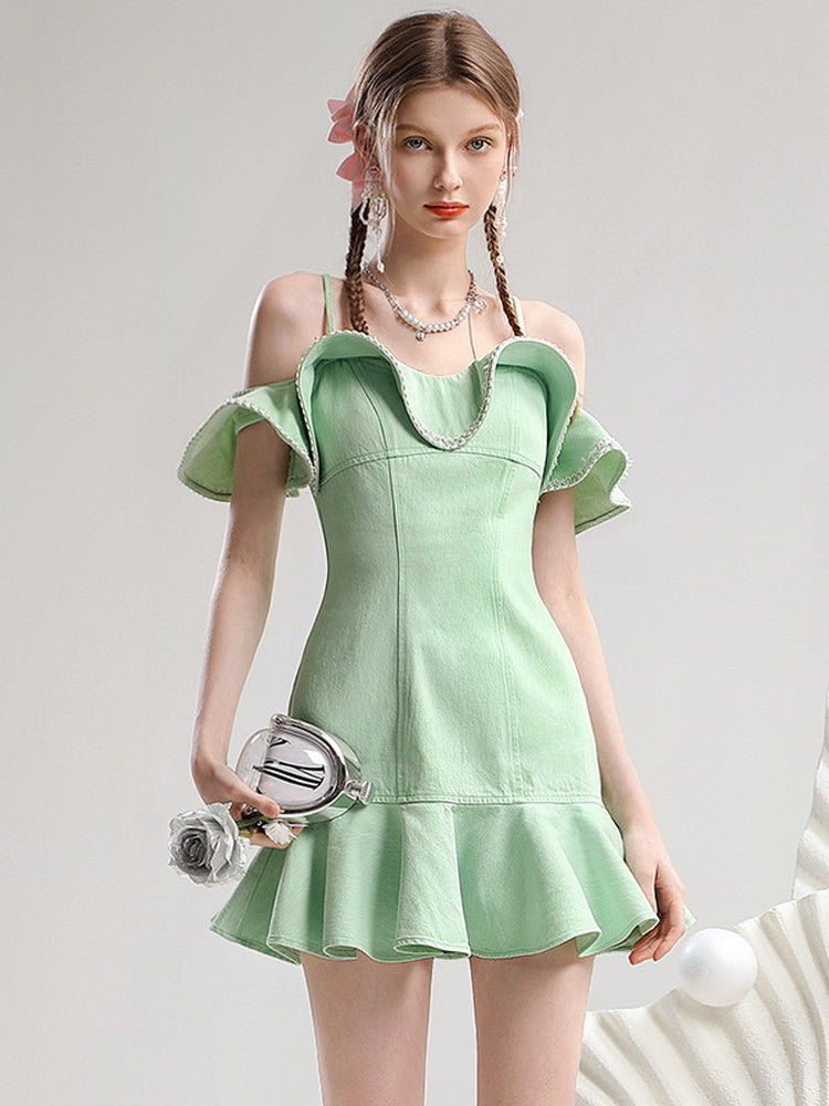 Denim Frill Off-Shoulder Casual Short Cute Dress