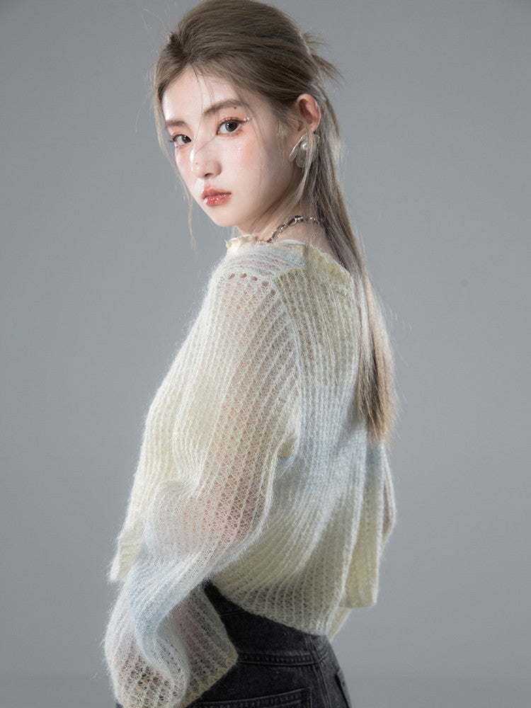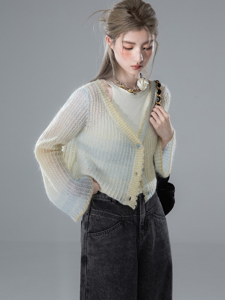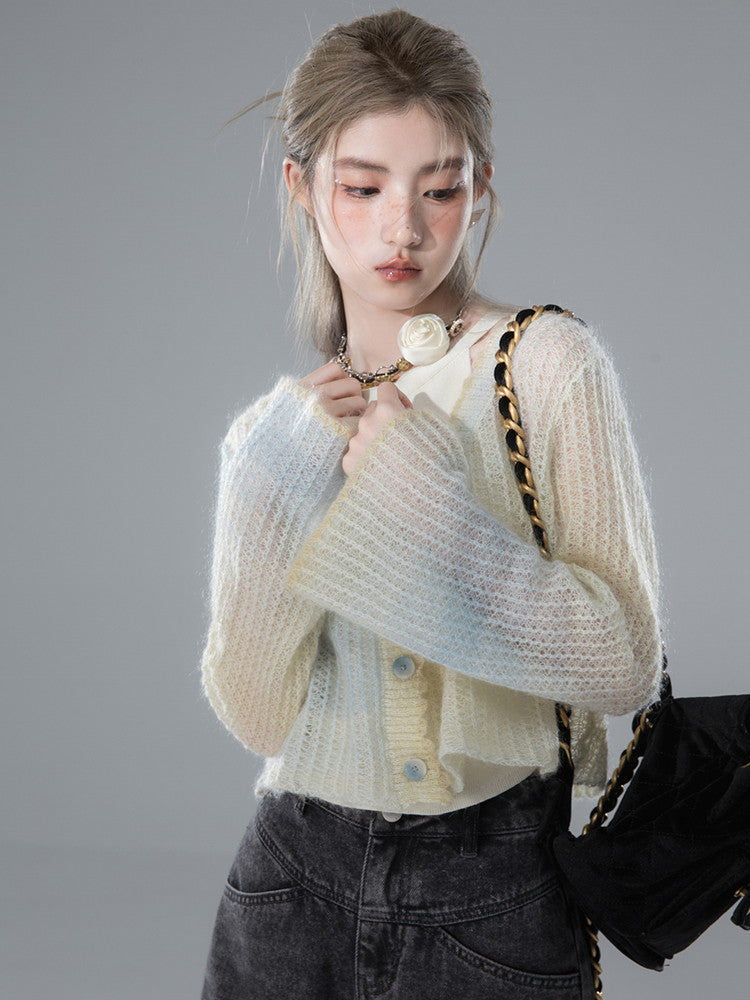 Flare-Sleeve V-Neck Short Sheer Mohair-Knit Cardigan