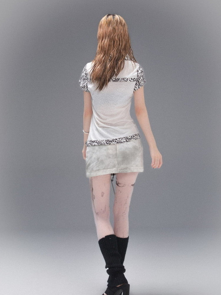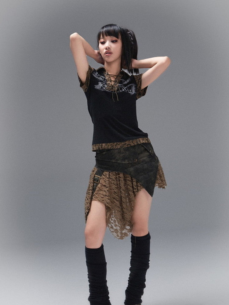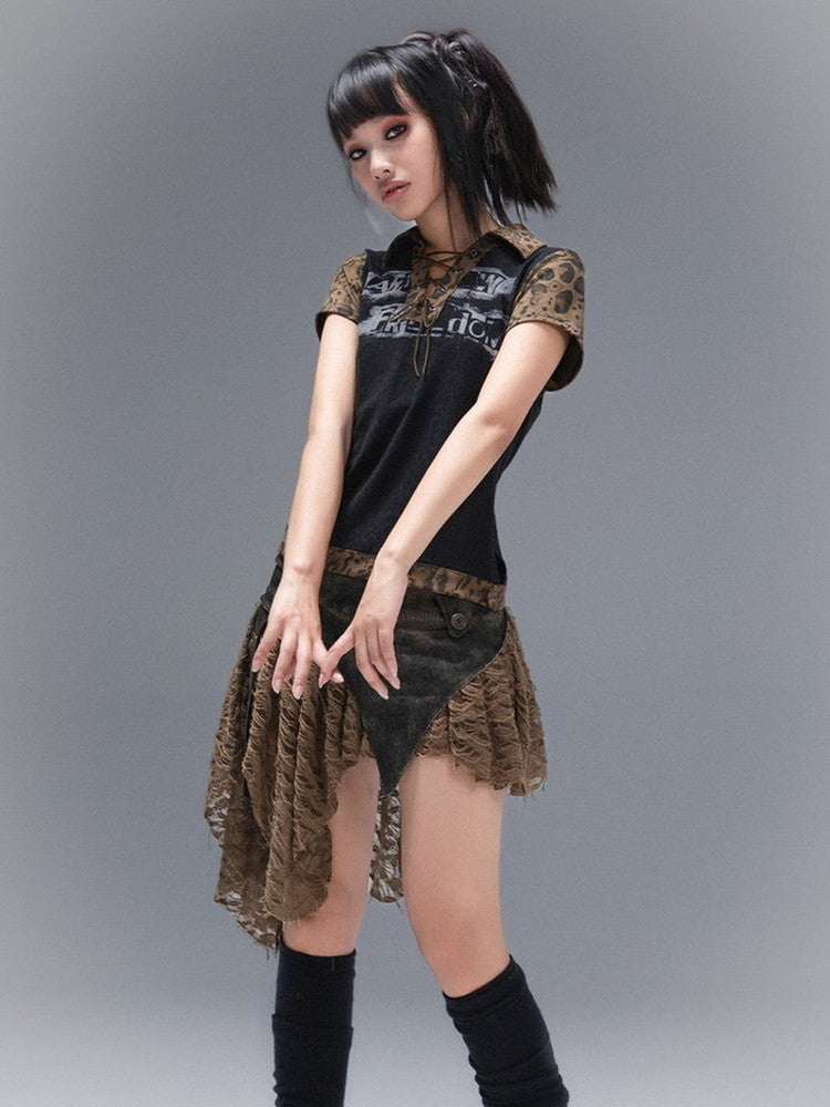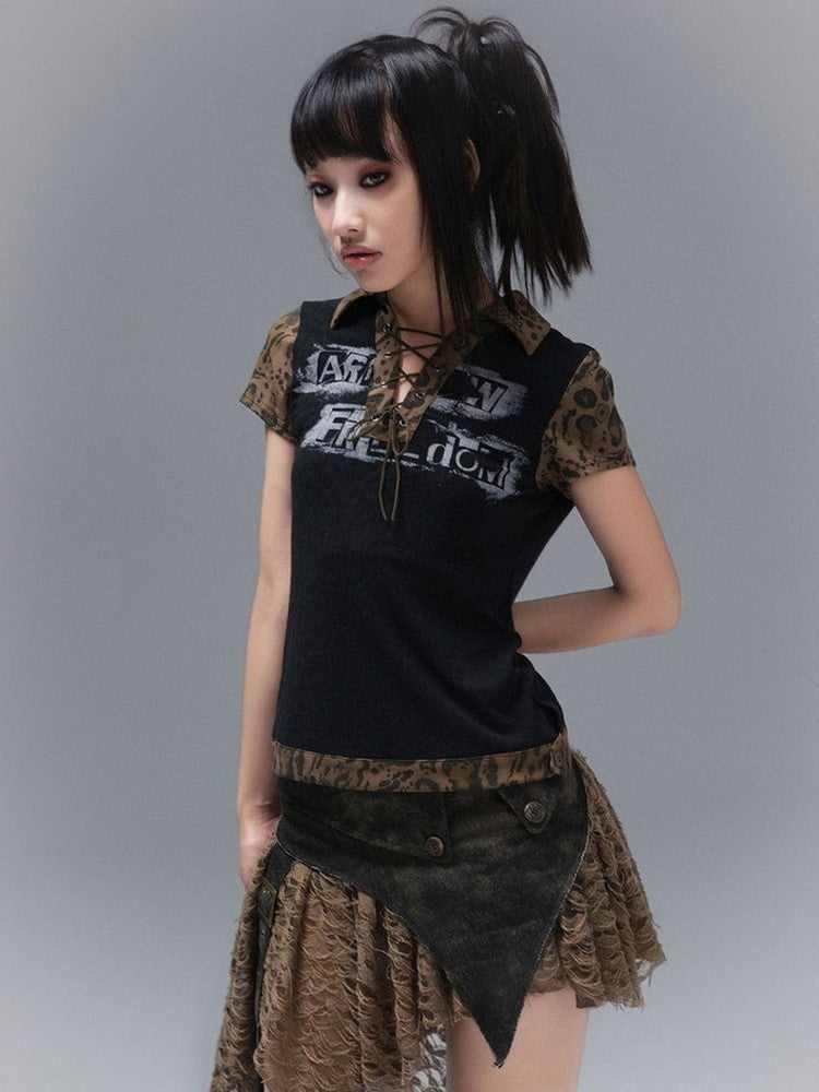 Leopard Lace-Up Polo-Neck Retro T-Shirt