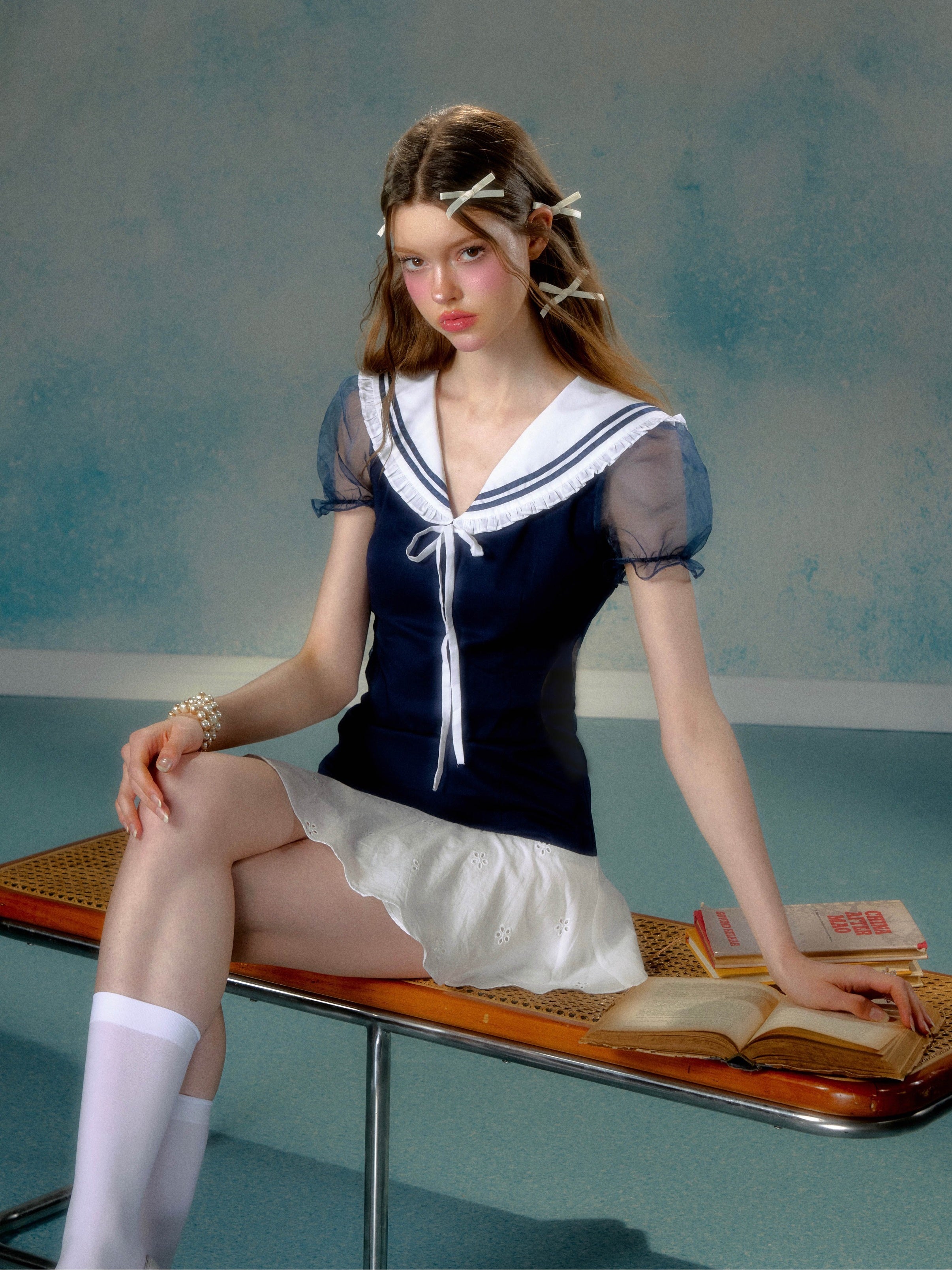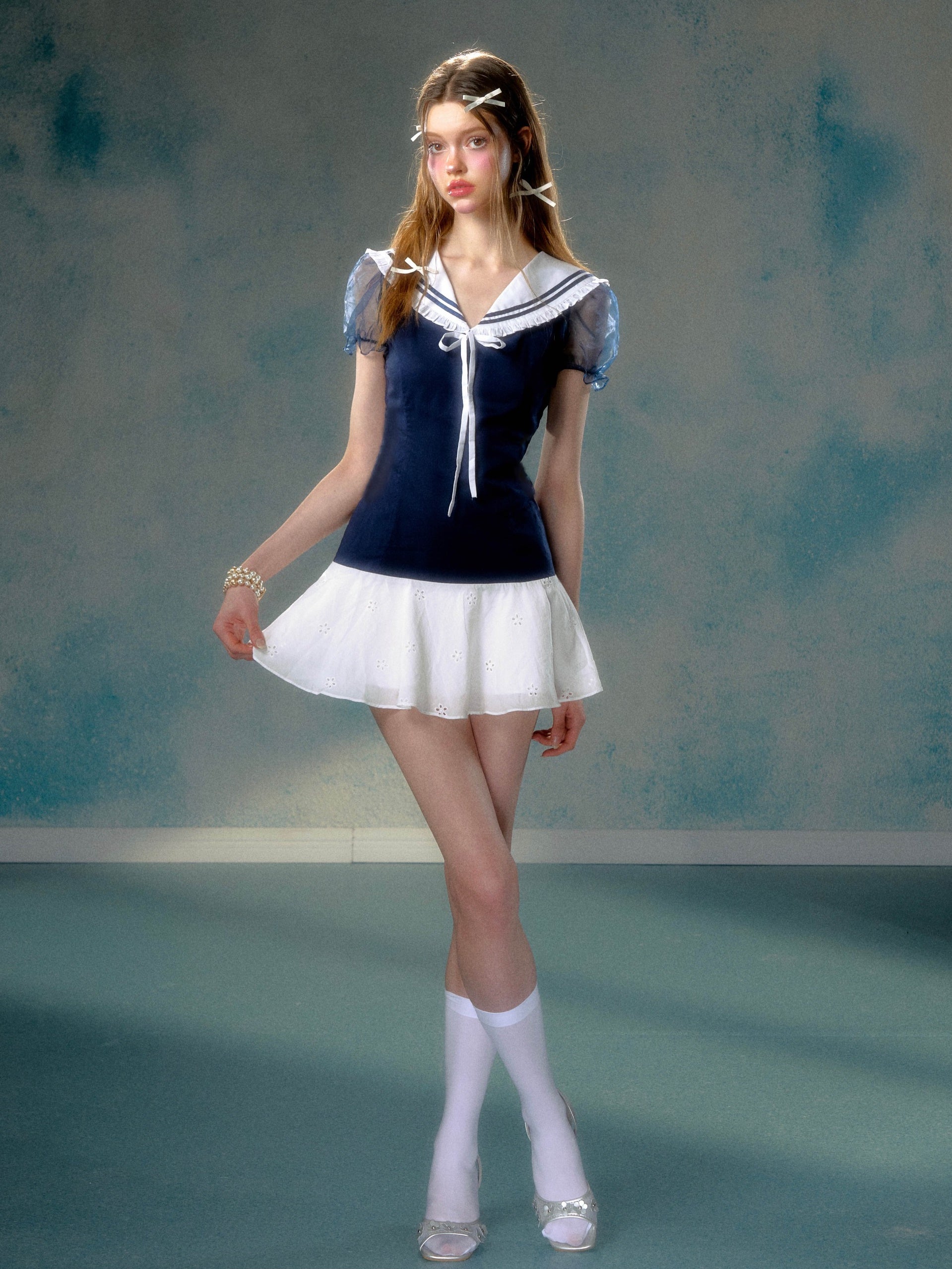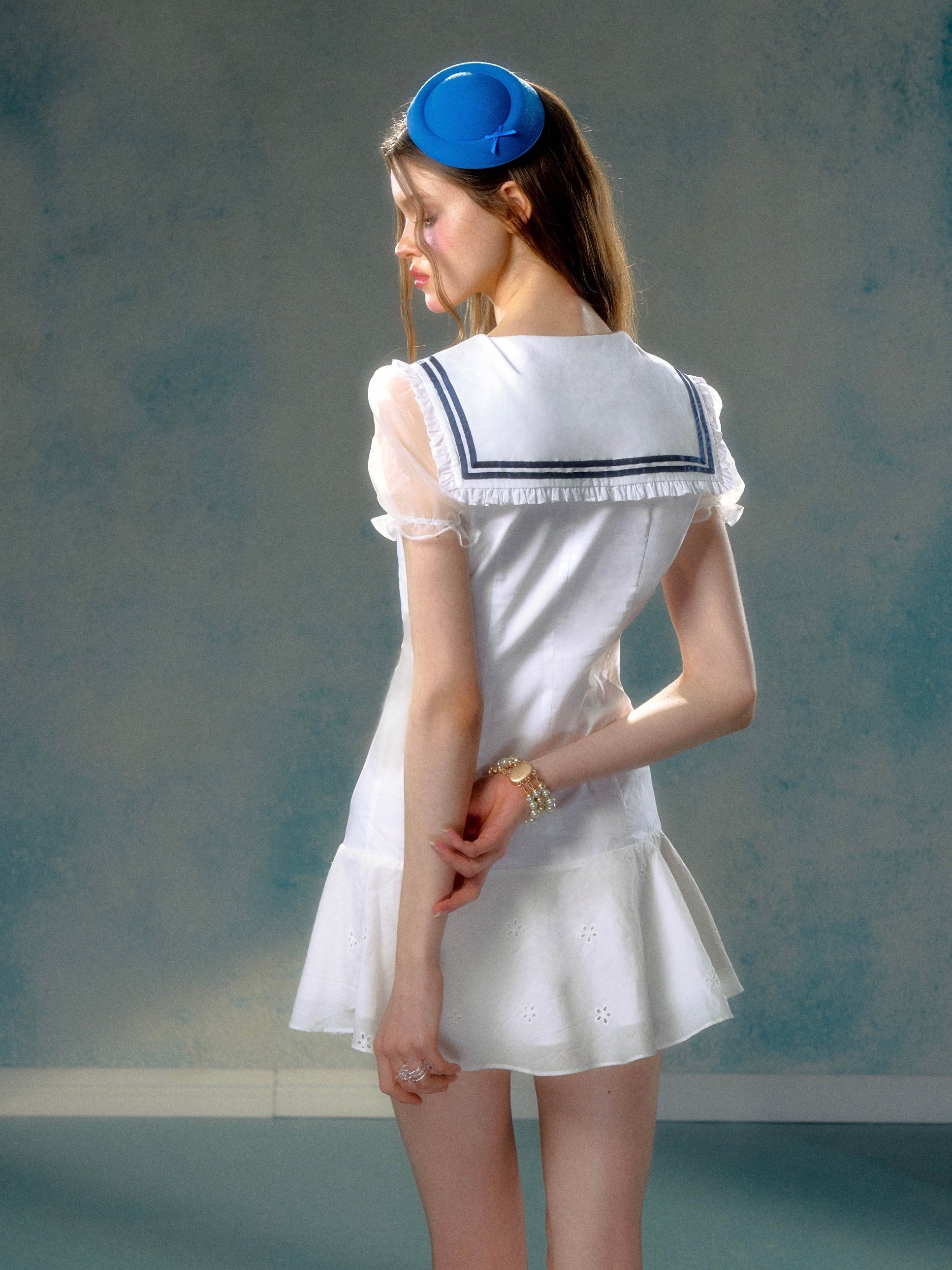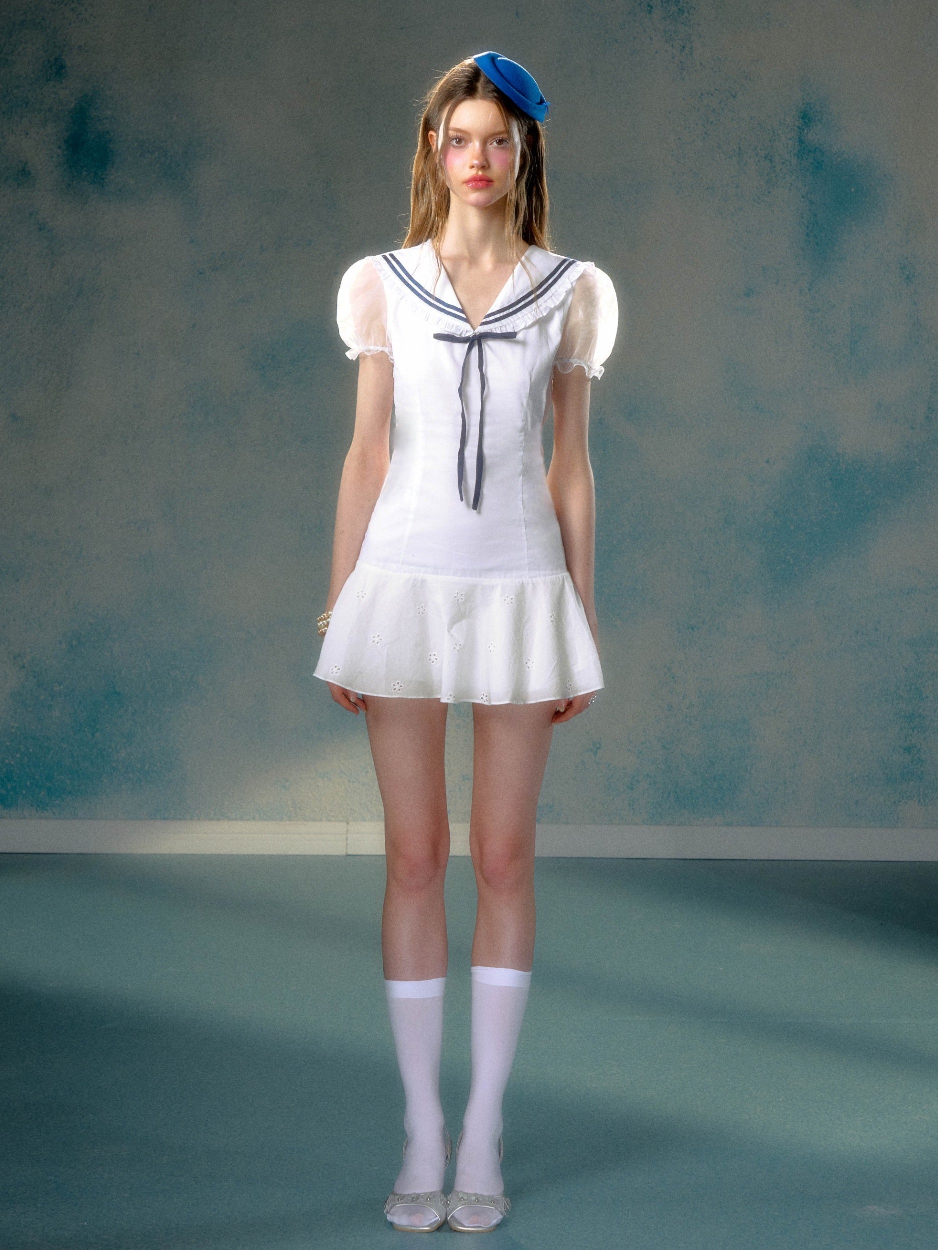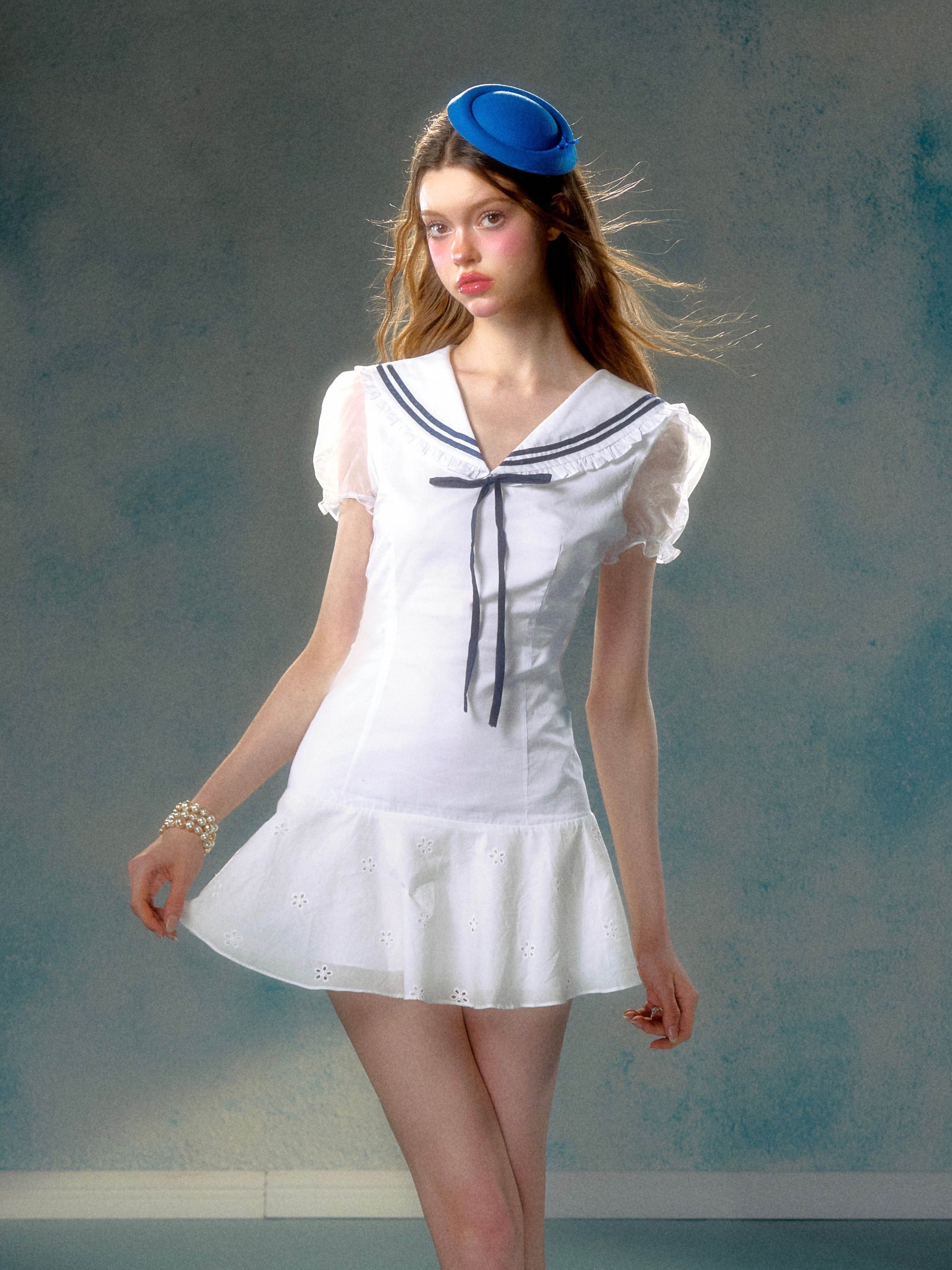 Navy Collar Girly Lace Patchwork Puff Sleeve One-piece