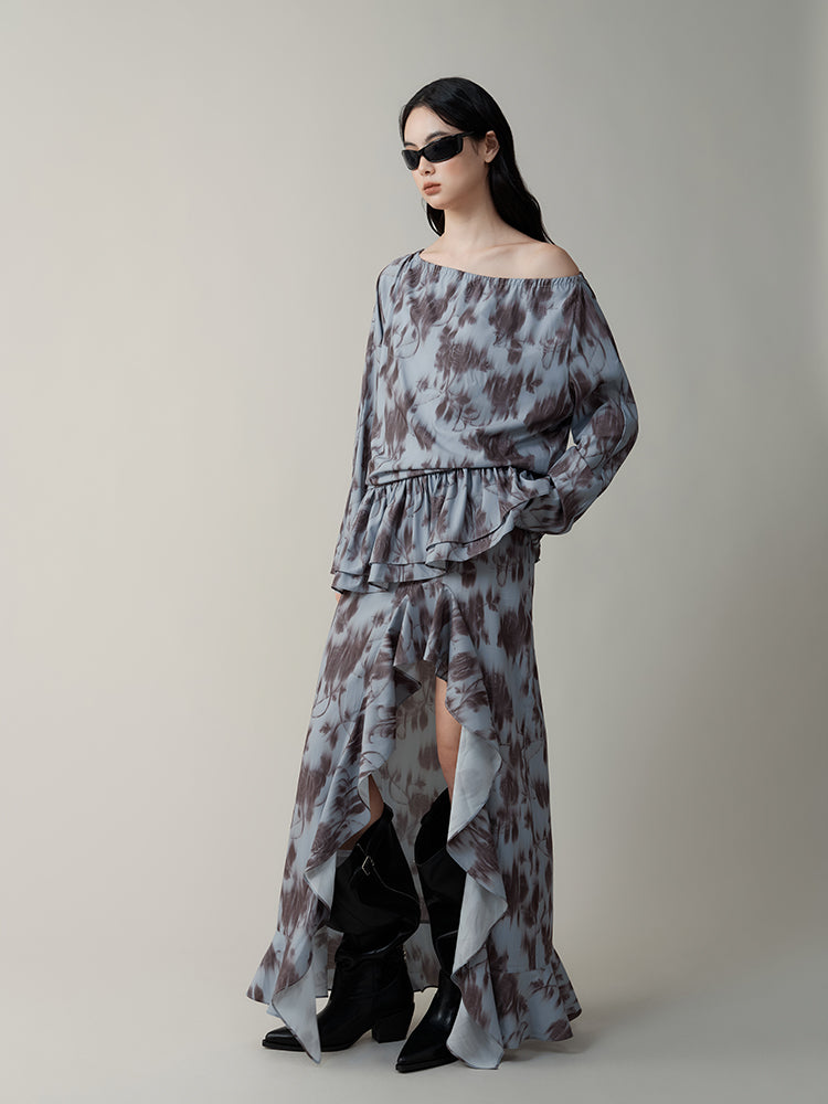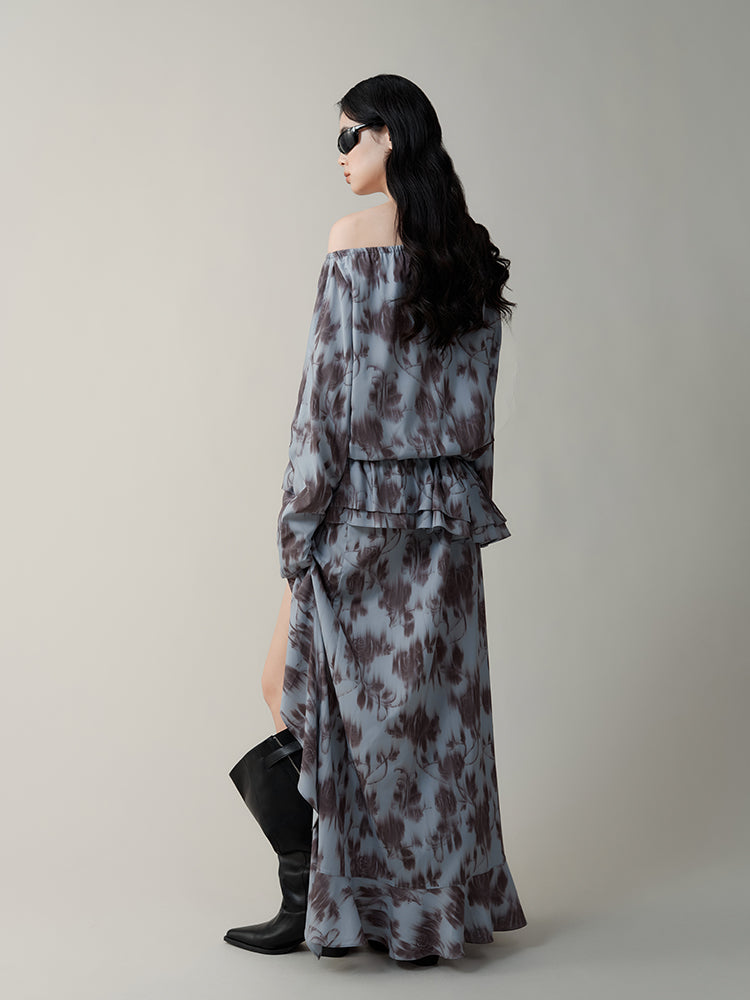Romantic Rose Print Layered Ruffled Oblique Collar Dress