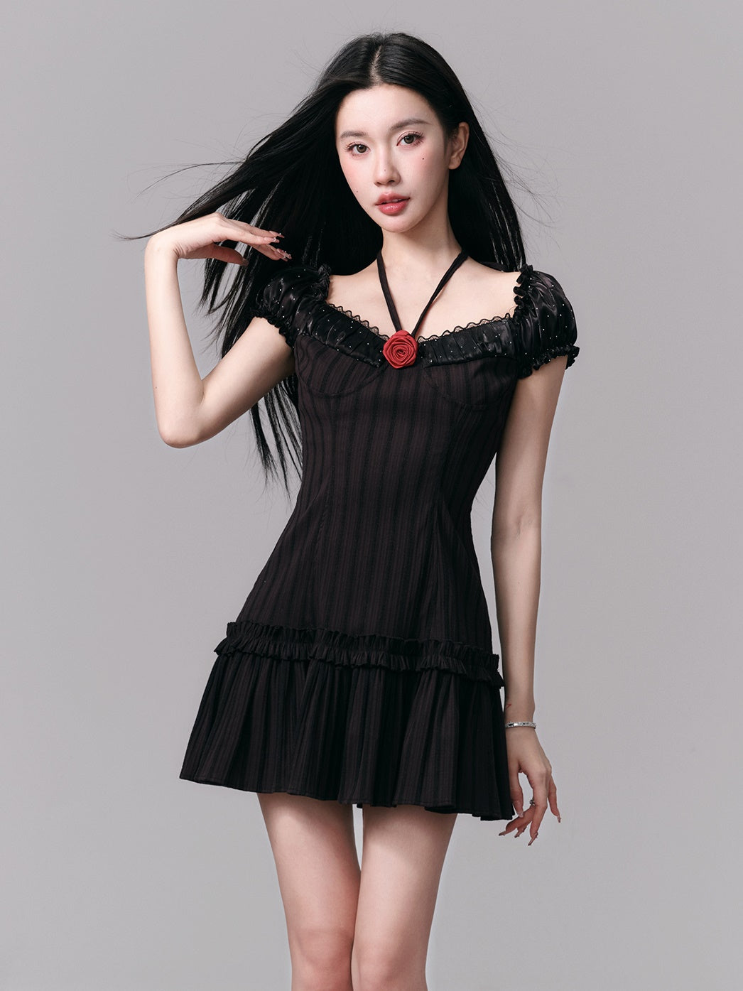Rose Motif Puff Sleeve Stripe Doll Dress