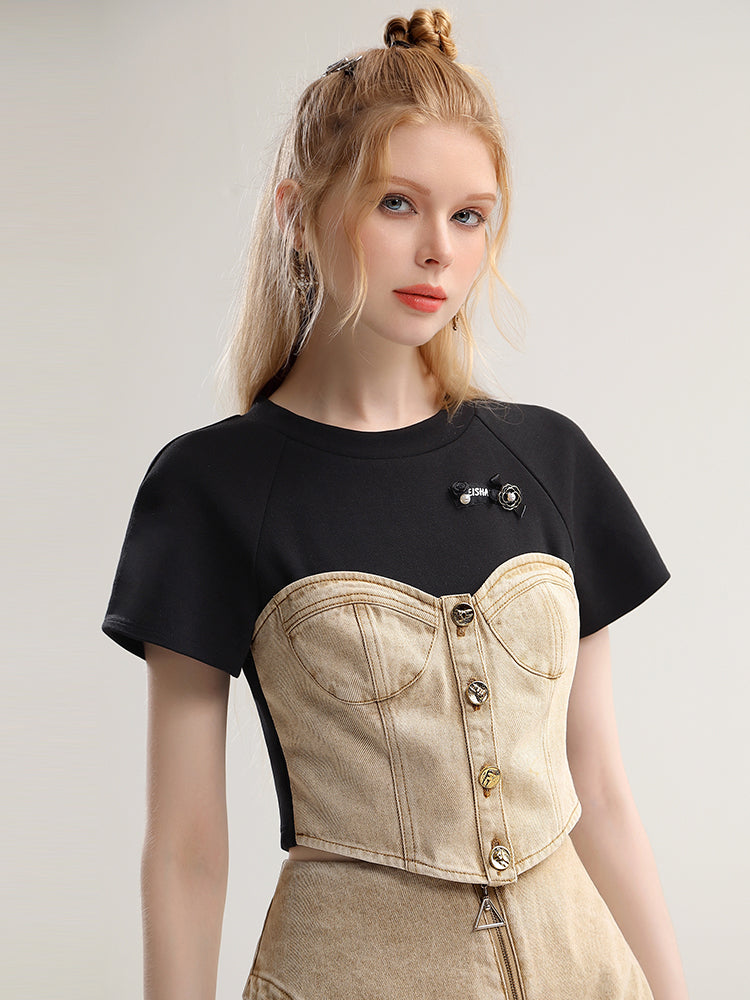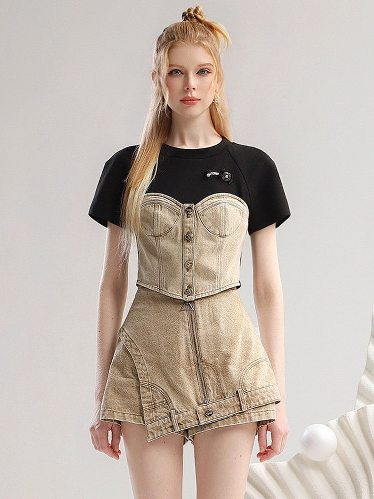 Set-Up Denim Retro Docking Asymmetry Bustier Tops&Short-Pants
