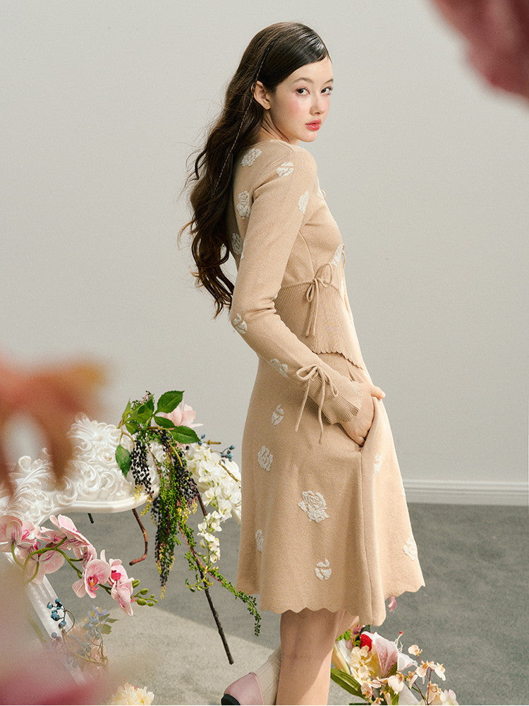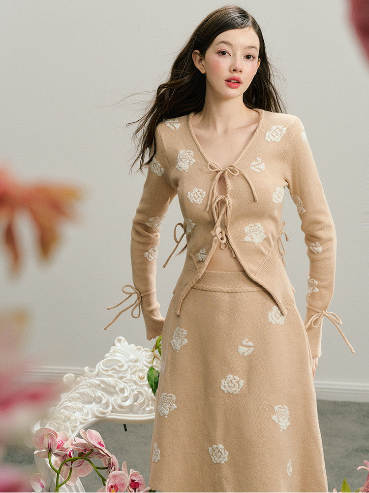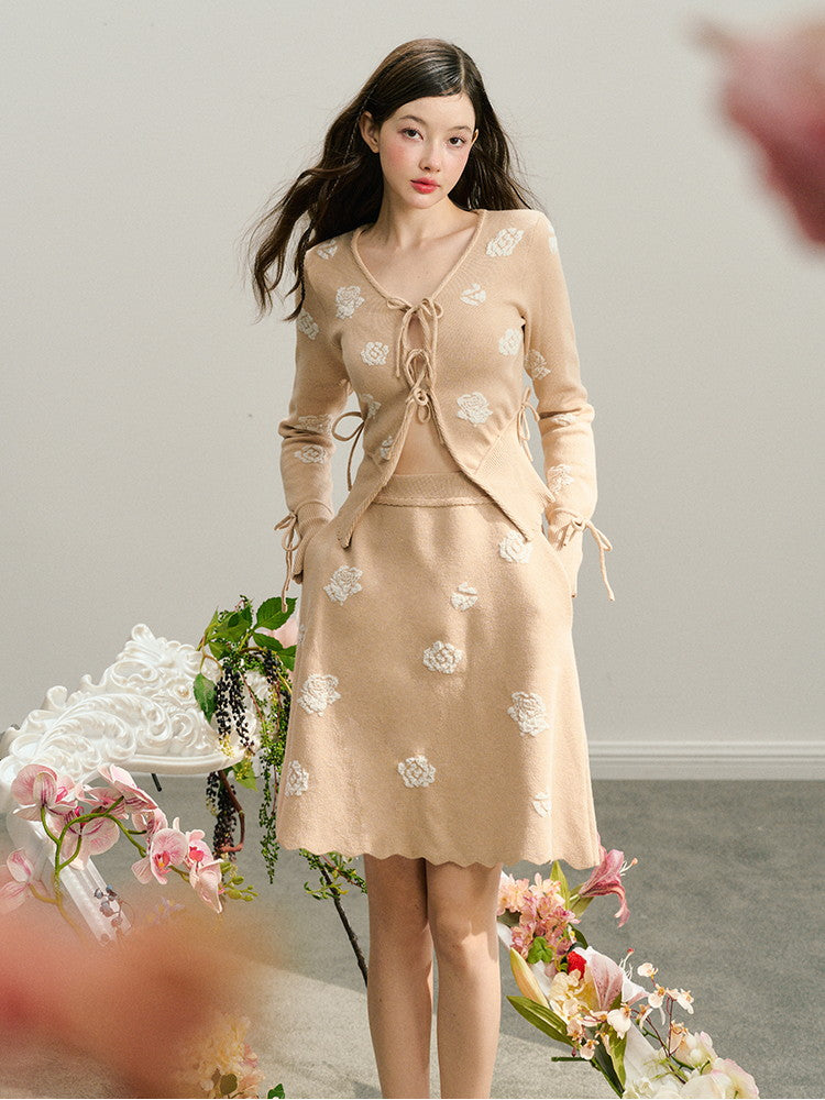 Set-Up Knit Embroidery V-Neck Feminine Cardigan&Skirt