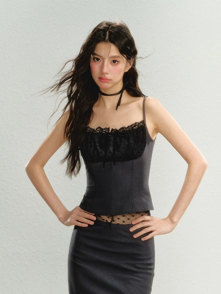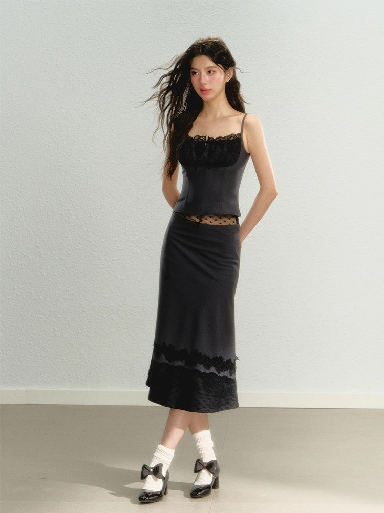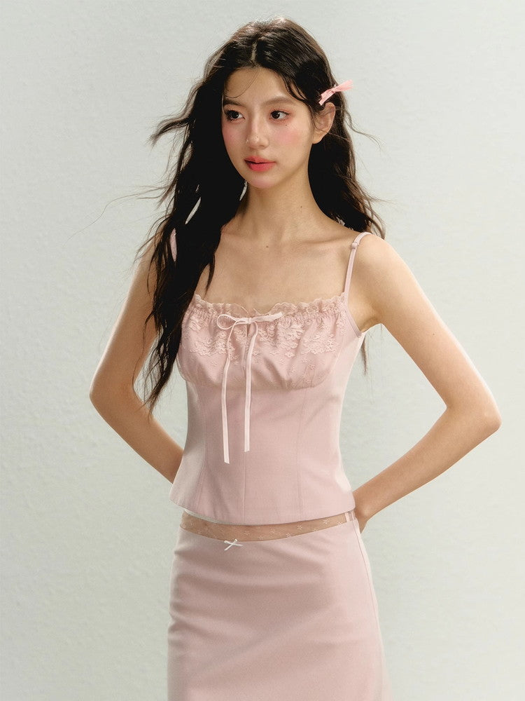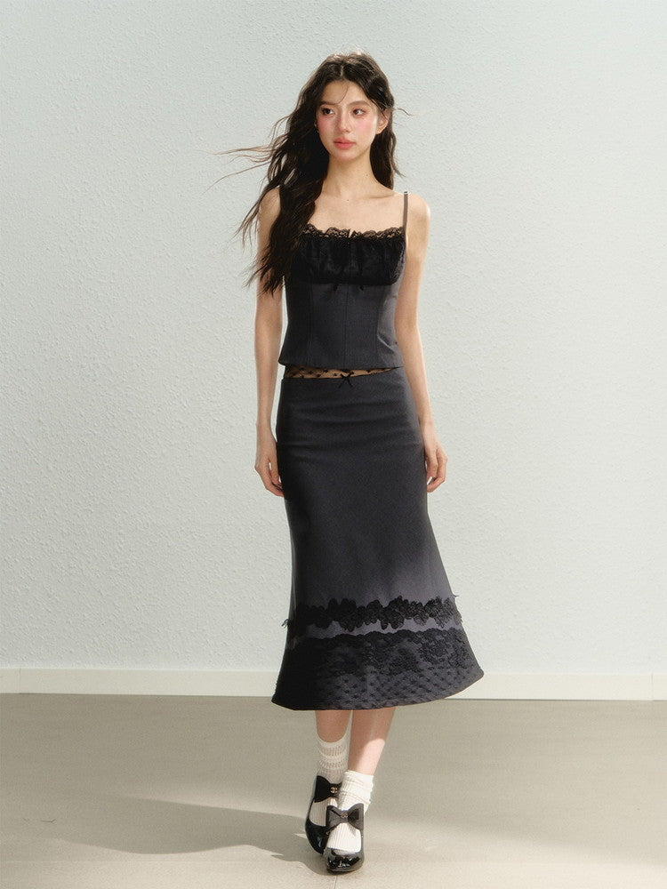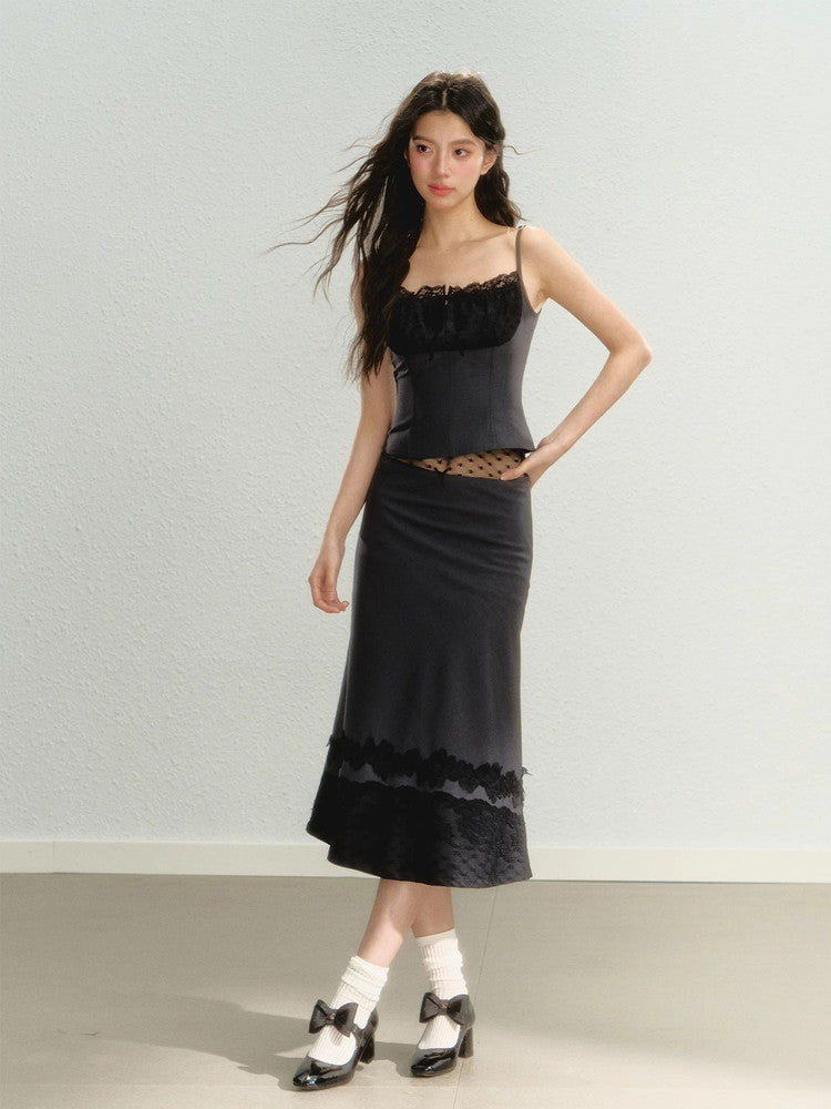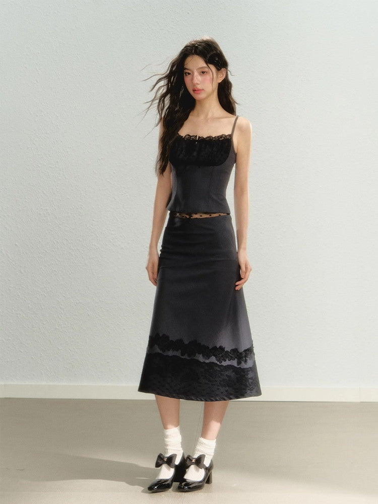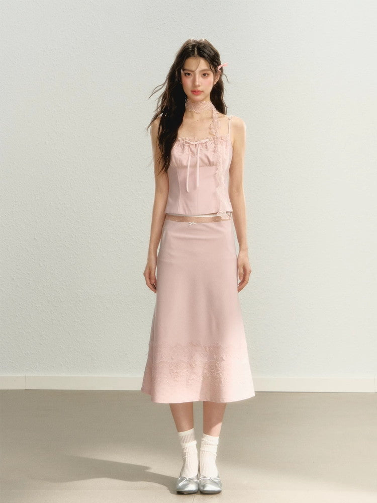 Set-Up Lace Ribbon Feminine Camisole&Long-Skirt