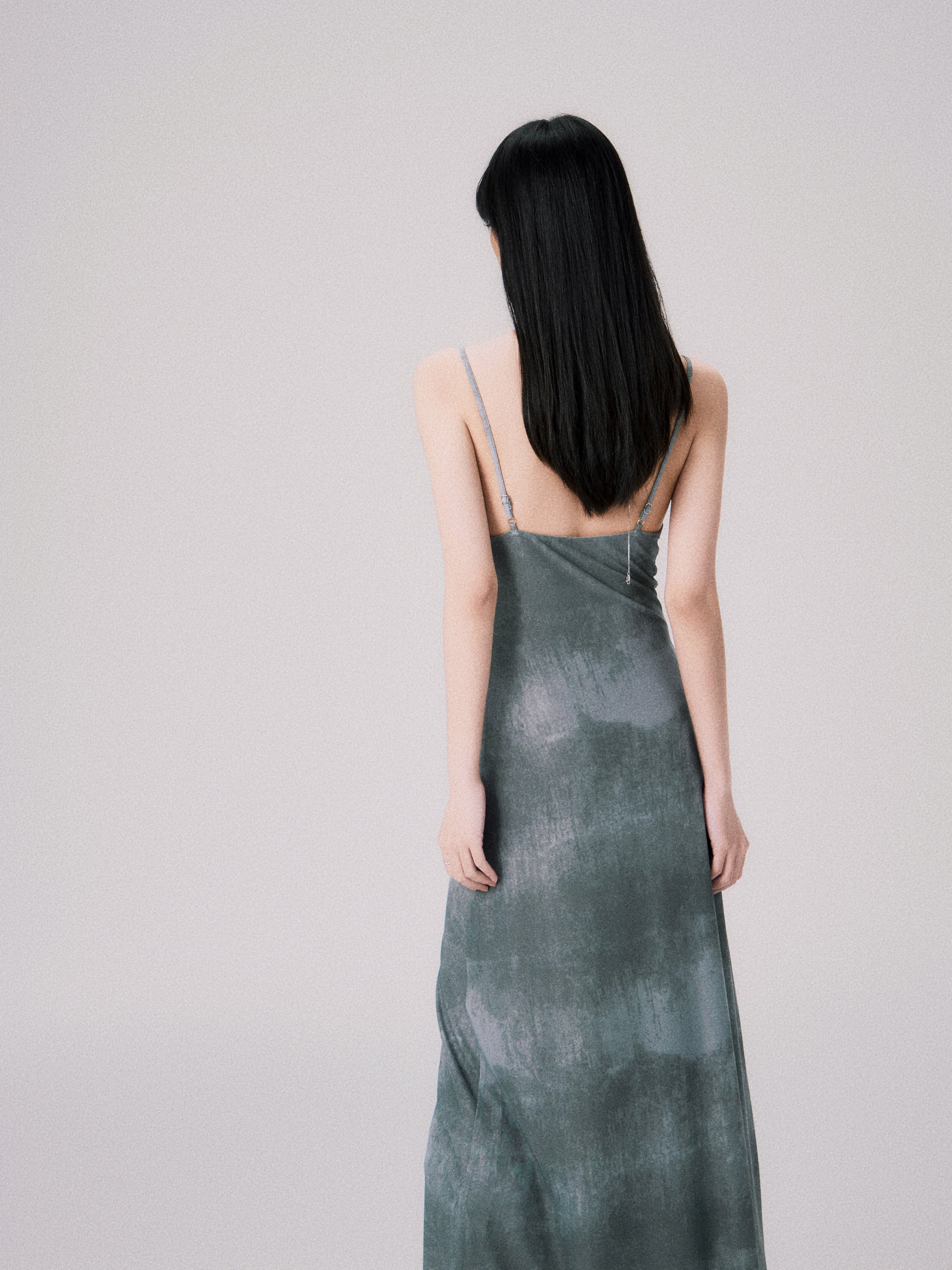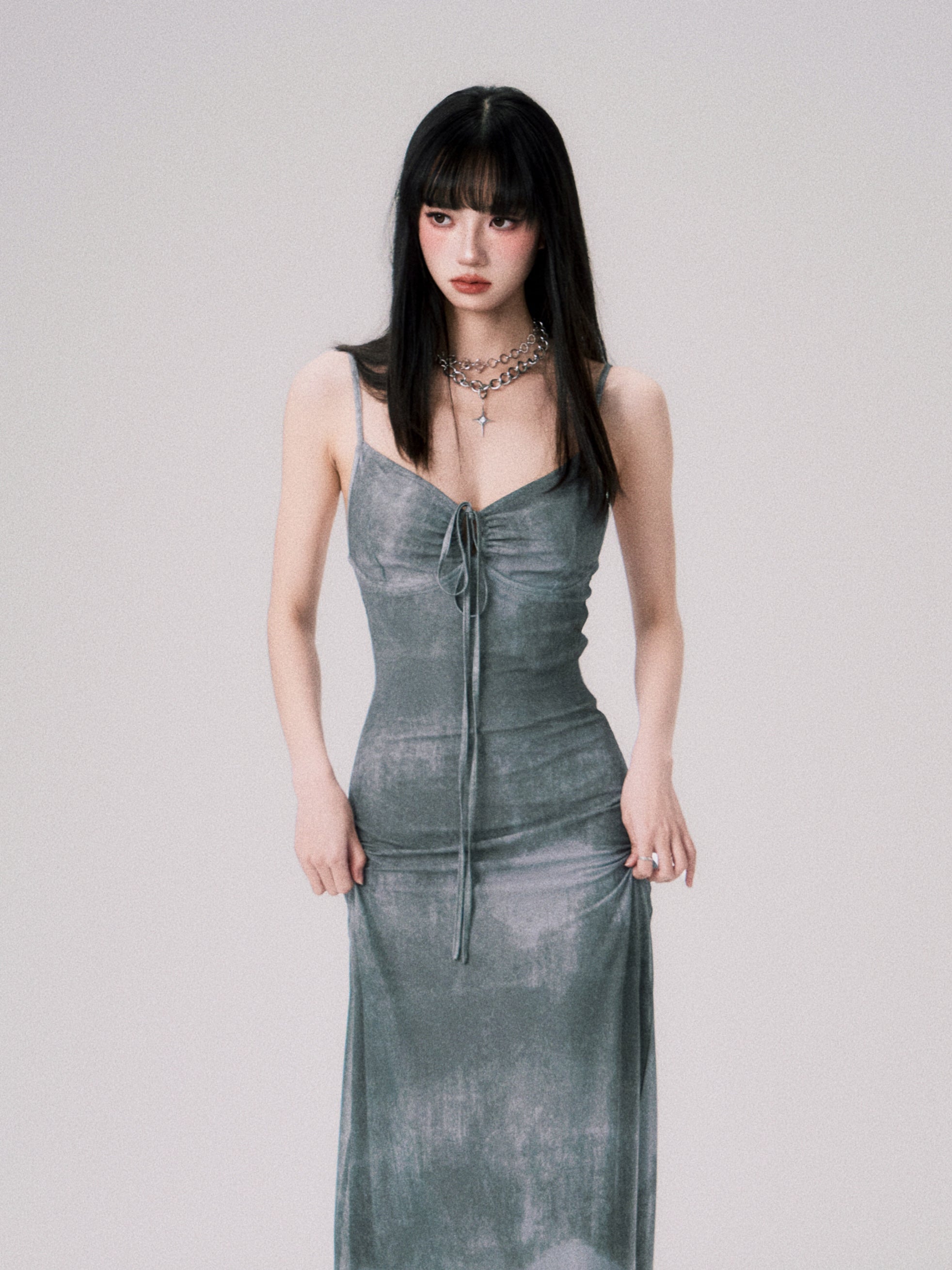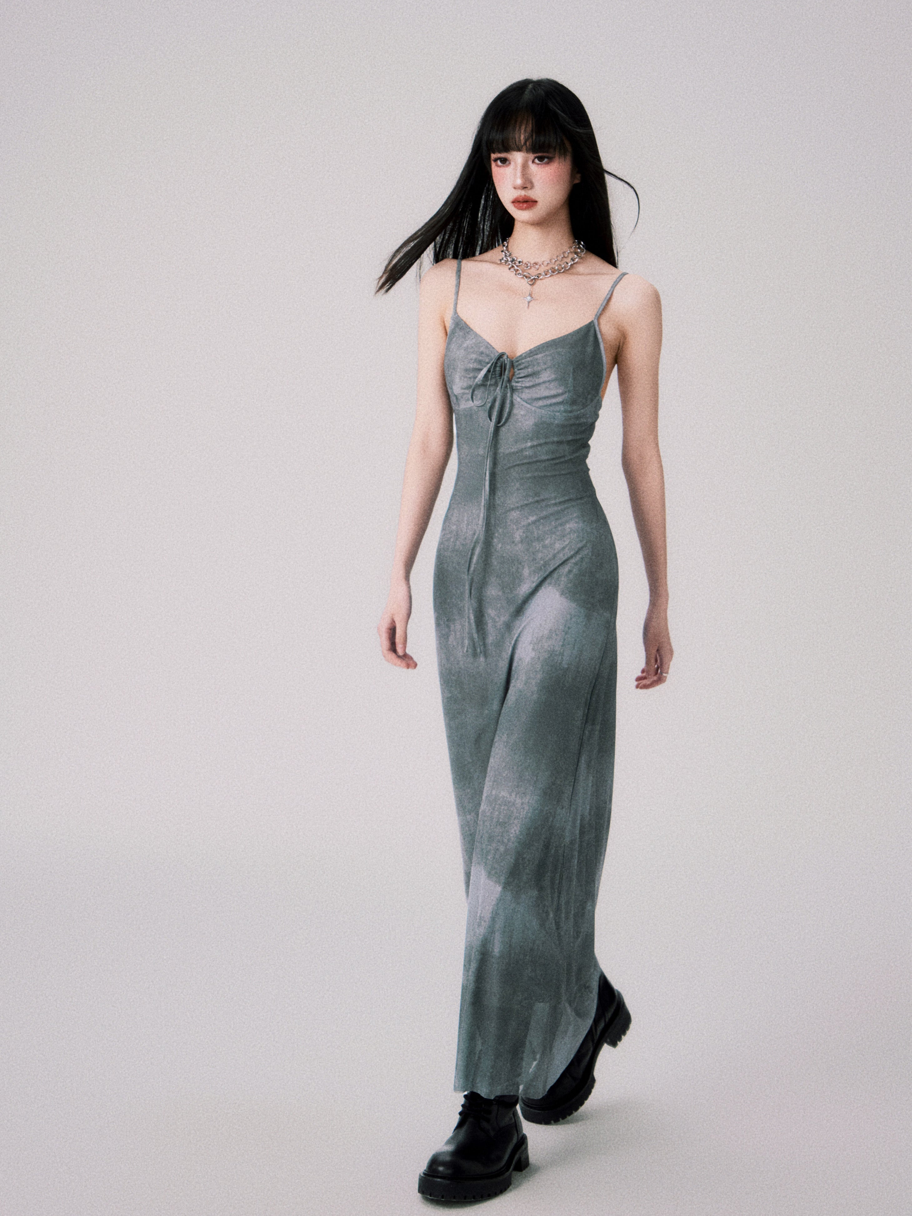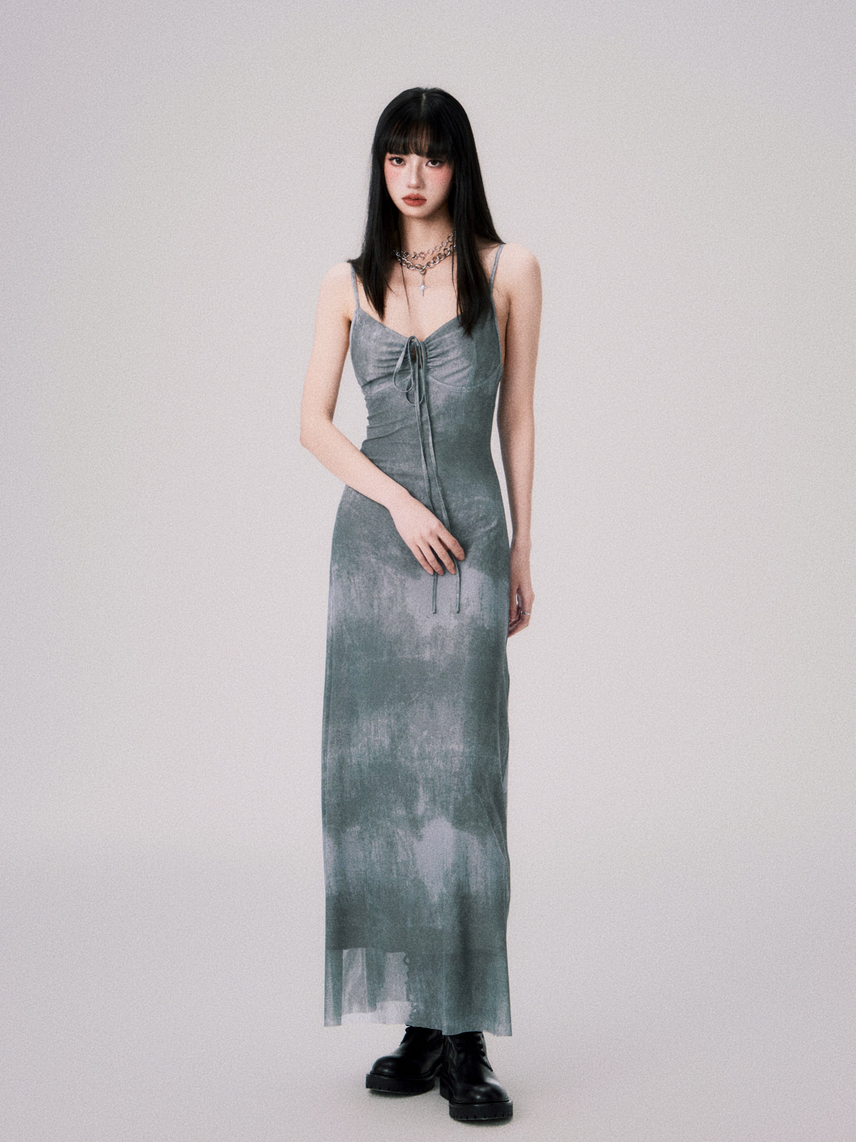 Tie-dyed Ink Painting Mesh Elastic Suspender Dress