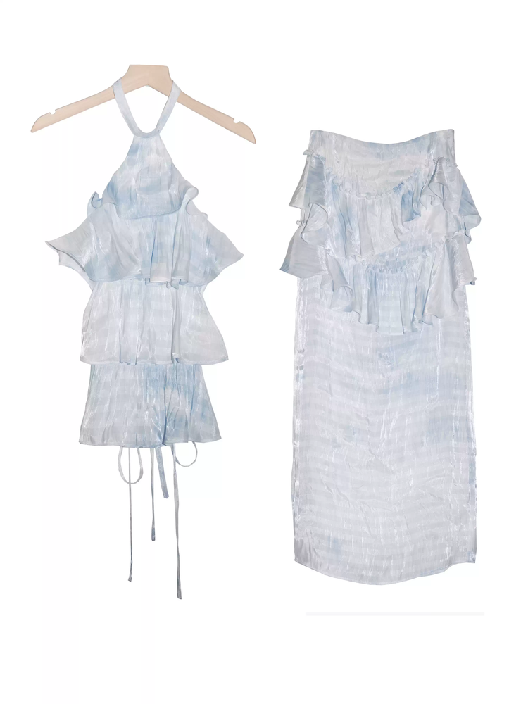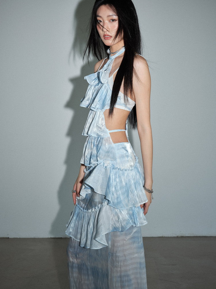 Tops&Long-Skirt Frill Halter-Neck Glitter Sheer Set-Up
