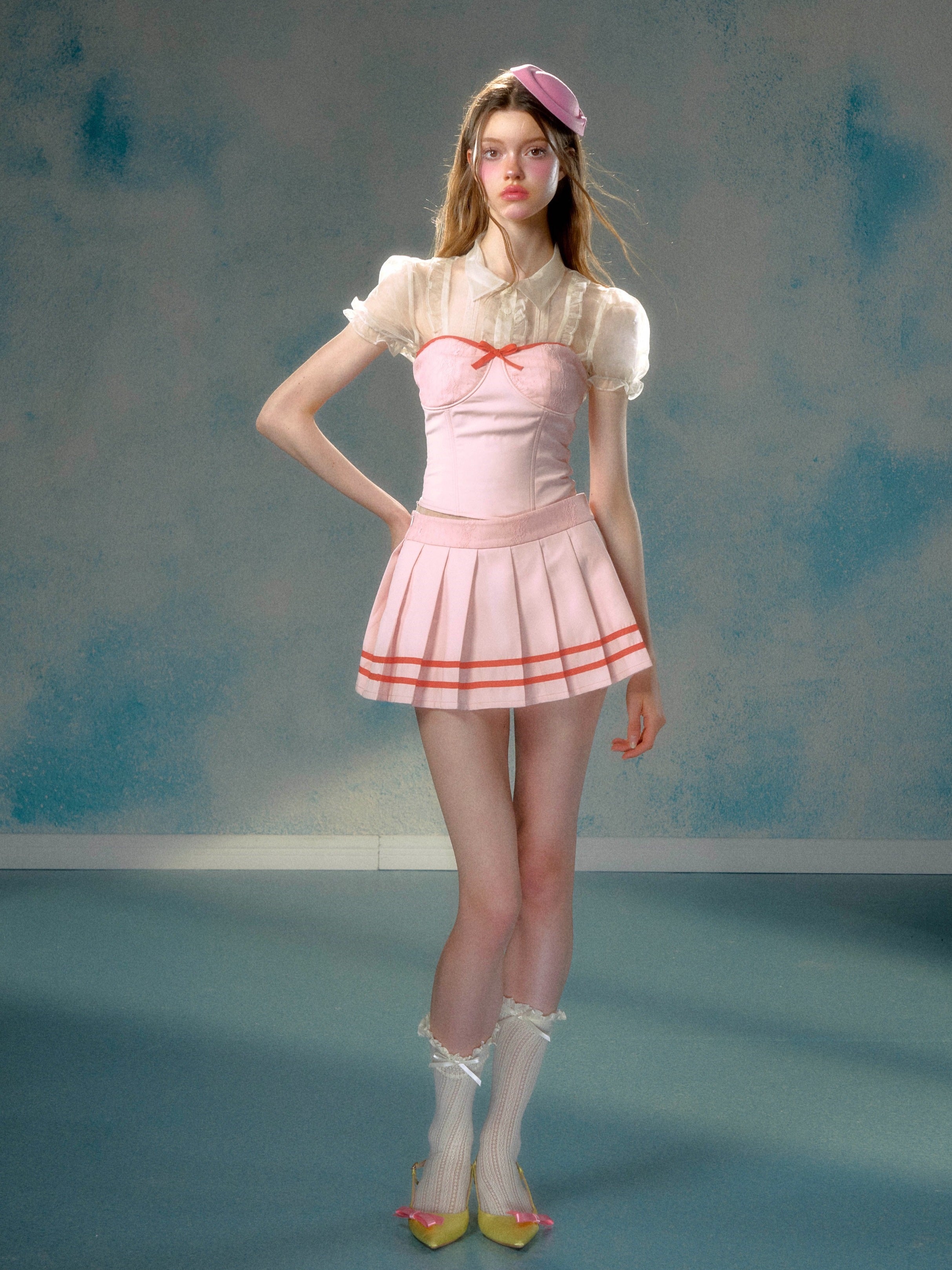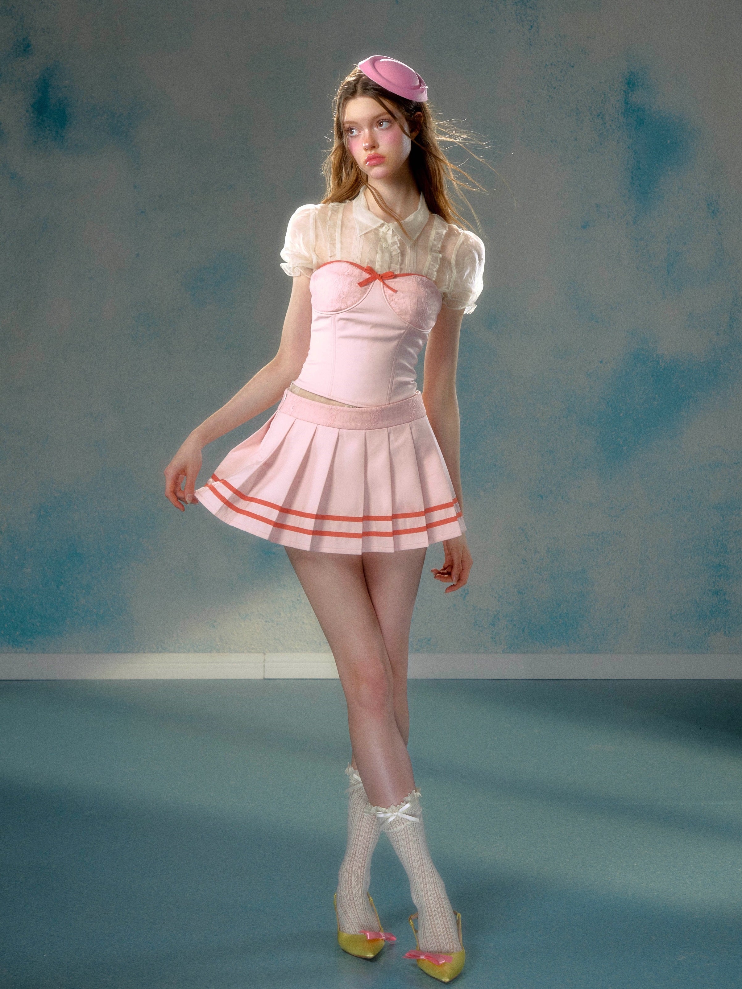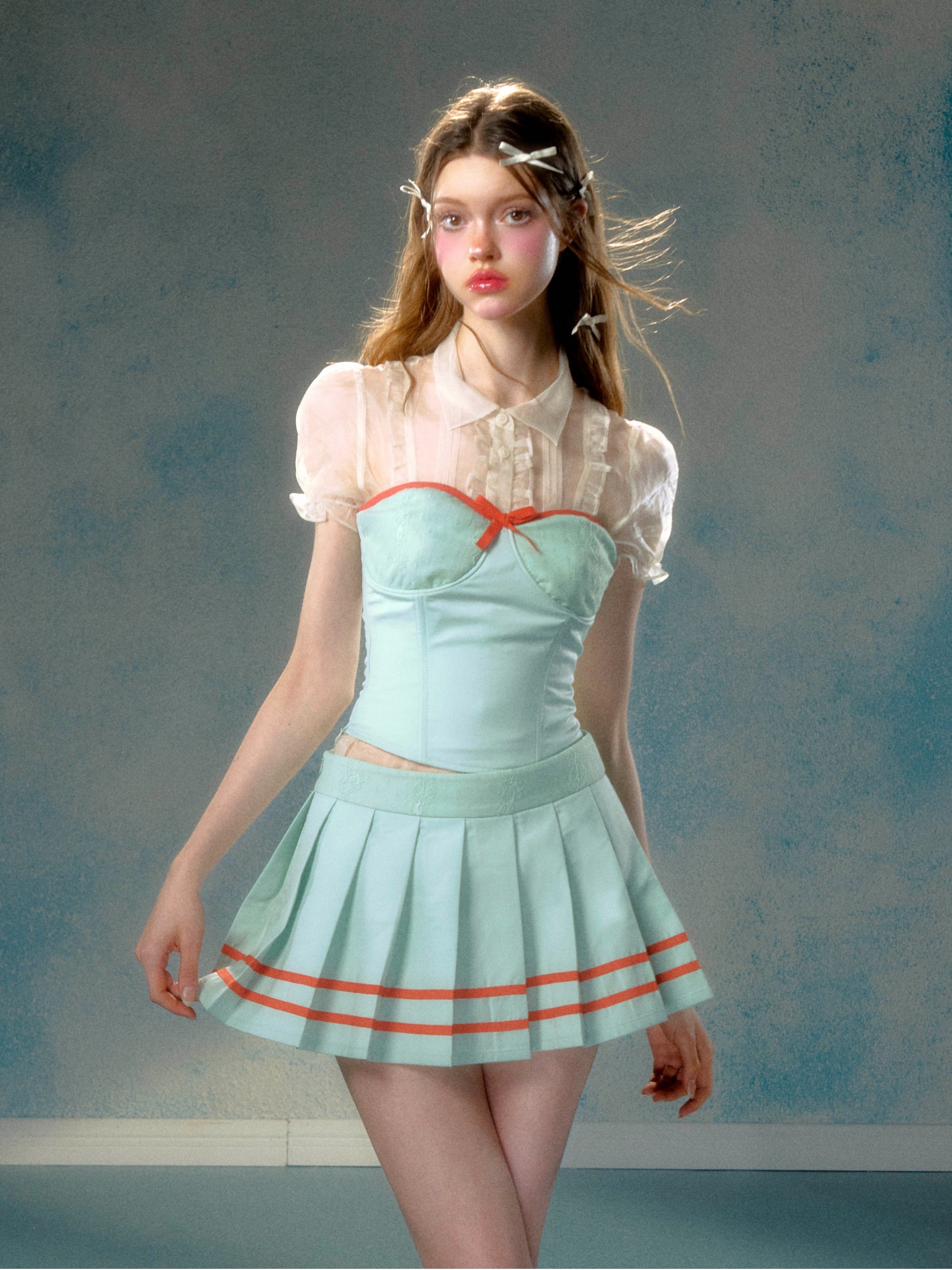 Vintage Contrasting Lace Panel Slim Fit Bare-top & Pleated Skirt