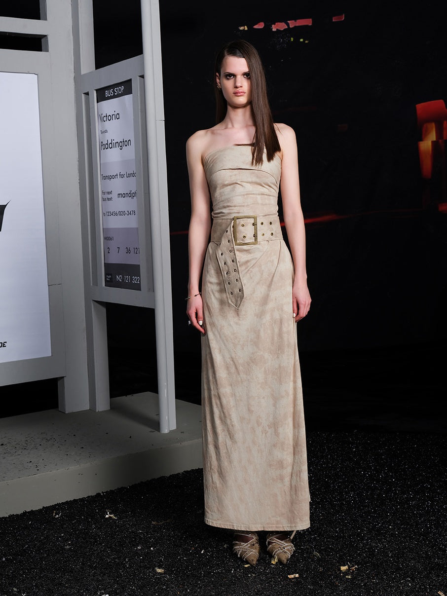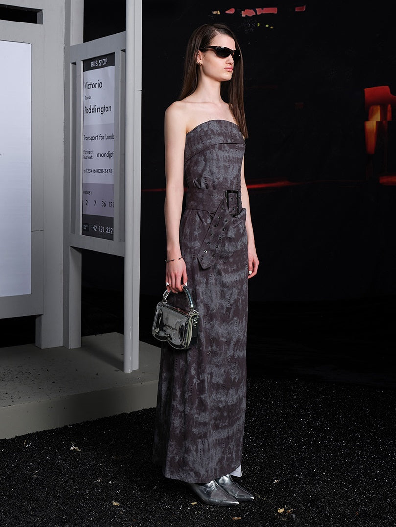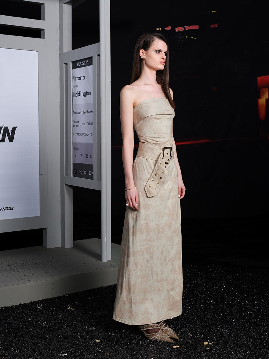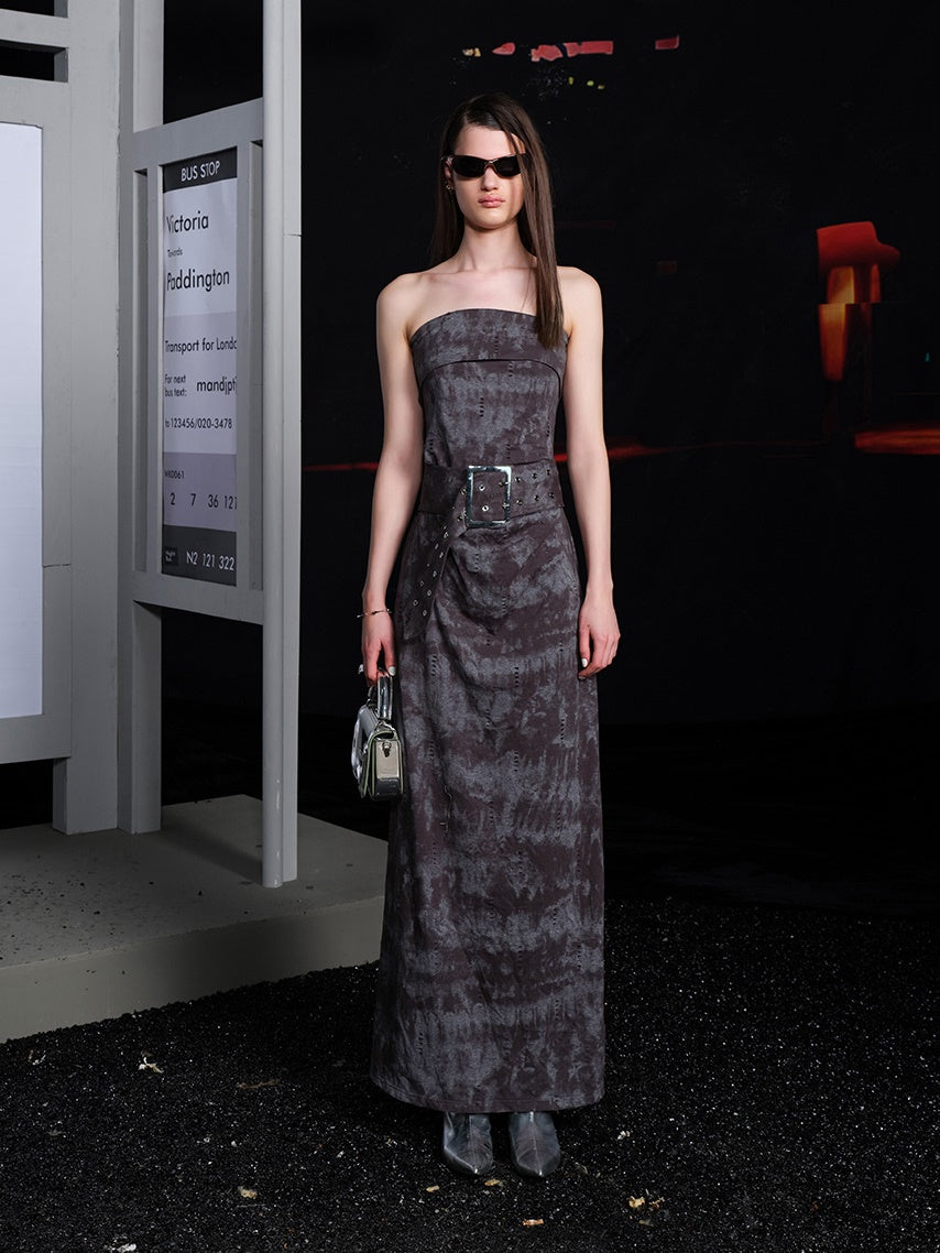 Tie-dye Ripped Bare-top Long Dress With Belt