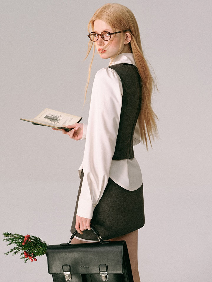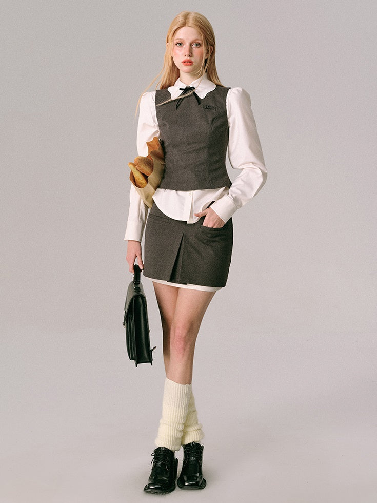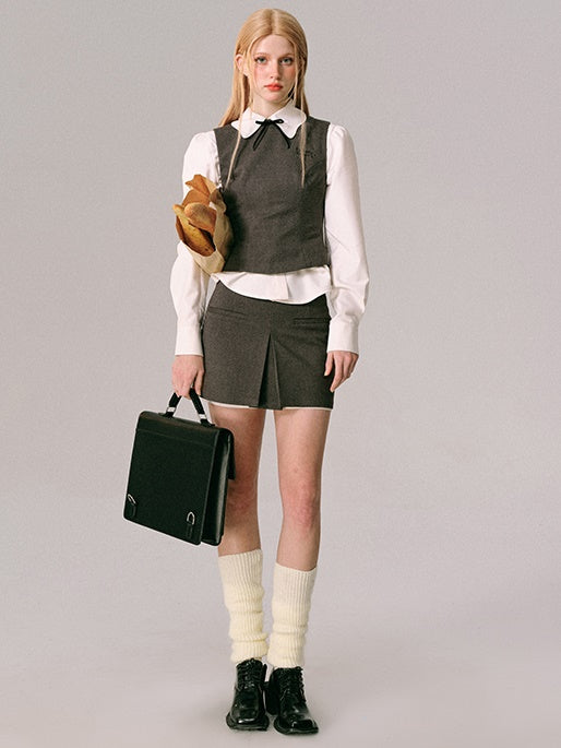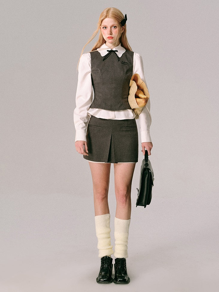 Embroidery Slim Short Vest &Tuck Mini Skirt