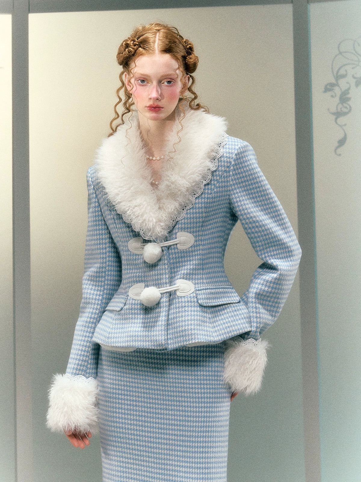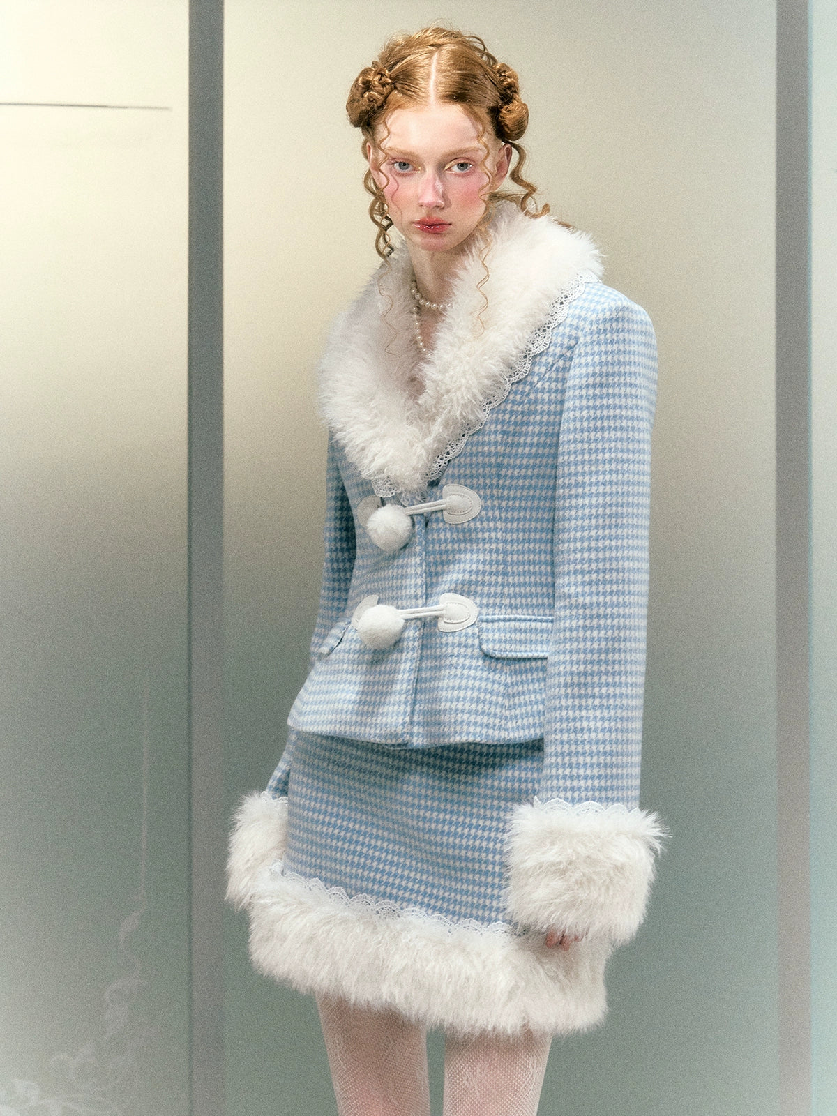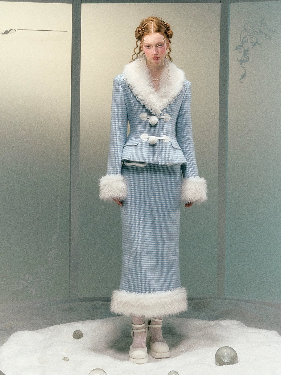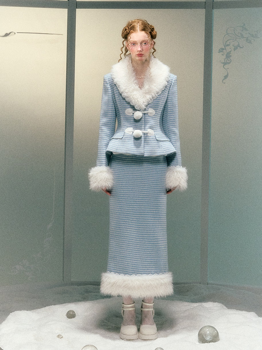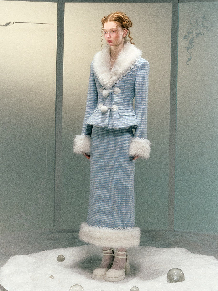 Plaid Lace Fur Collar Waisted Quilted Jacket & Skirt - Narrator