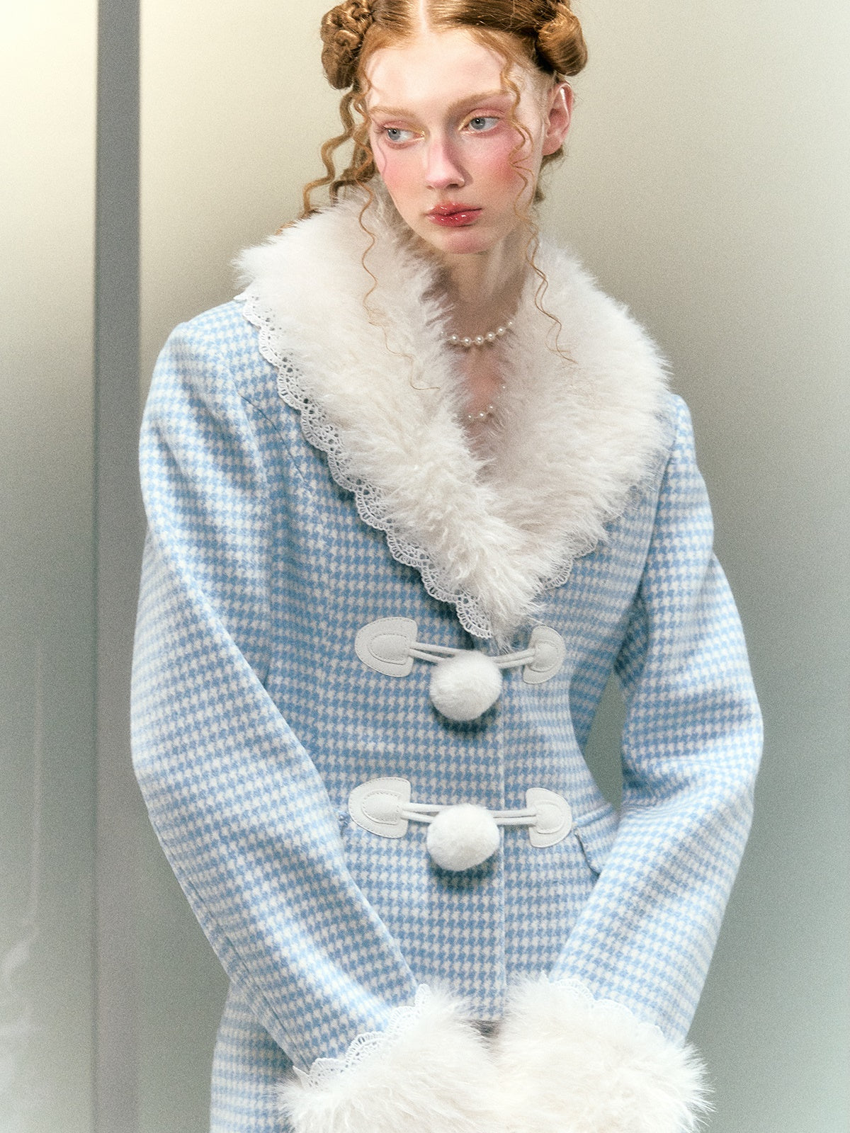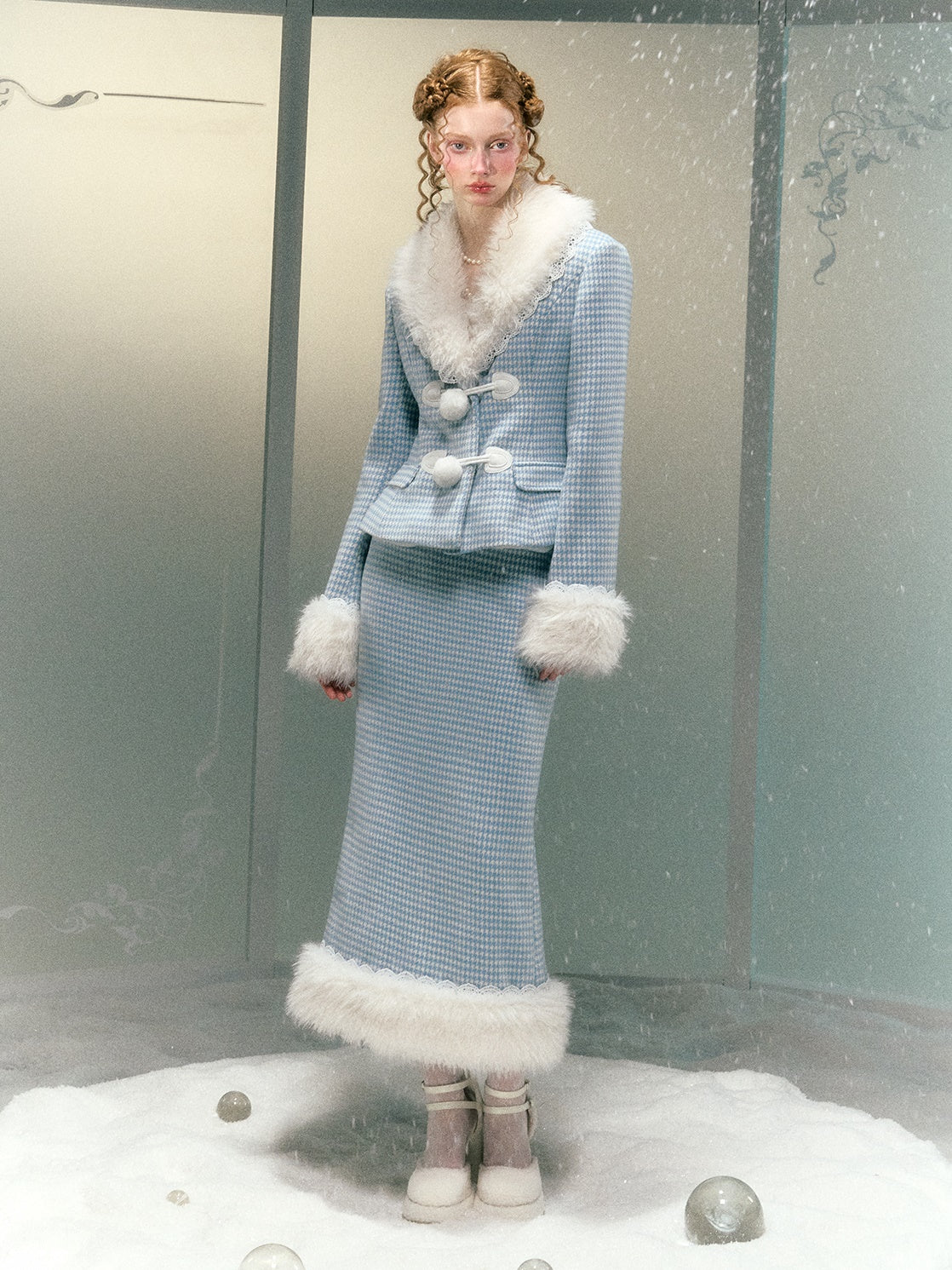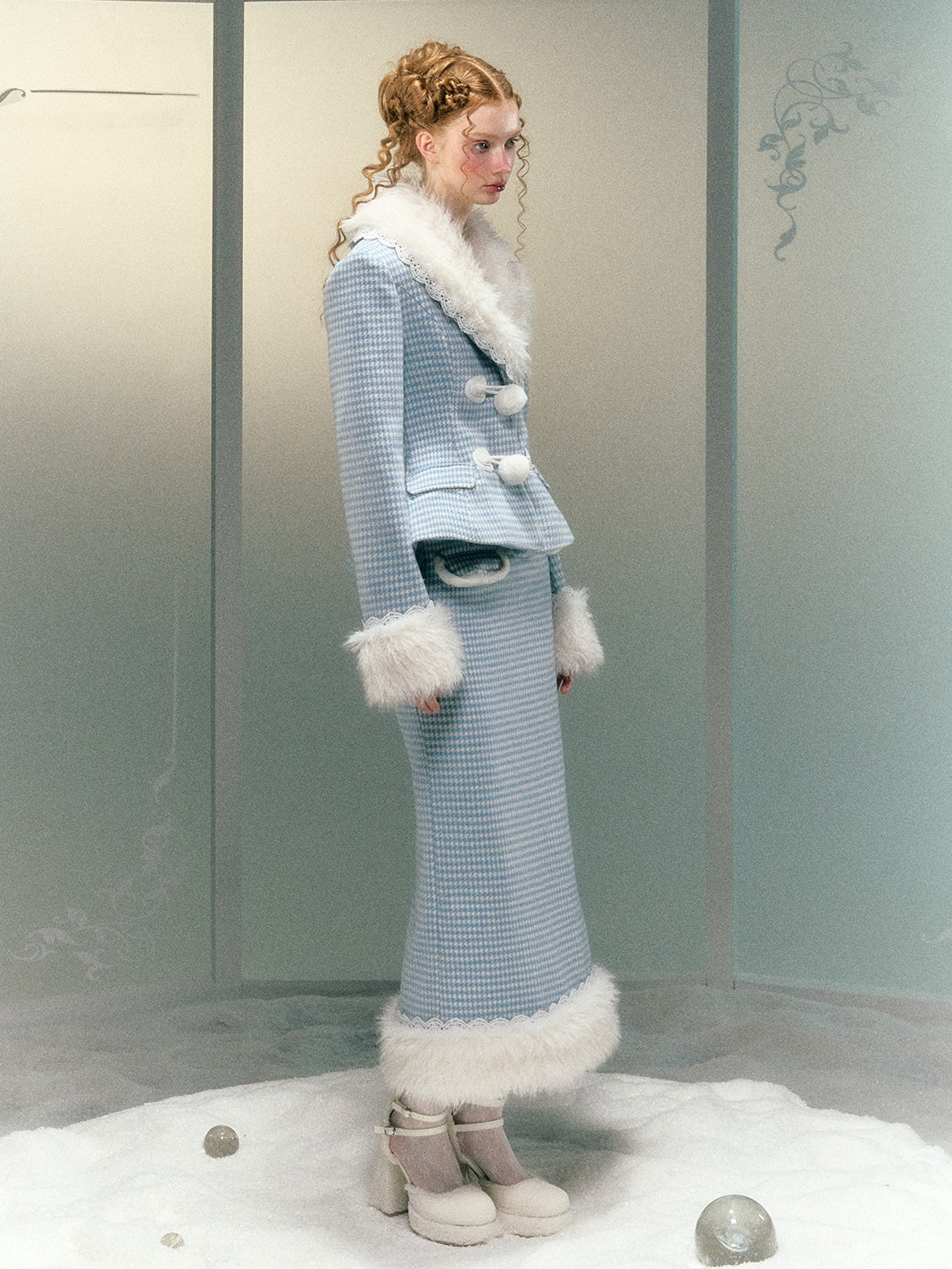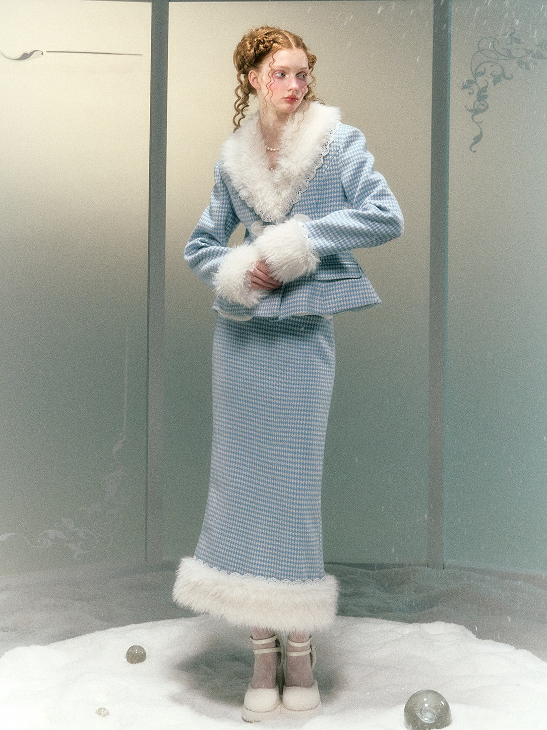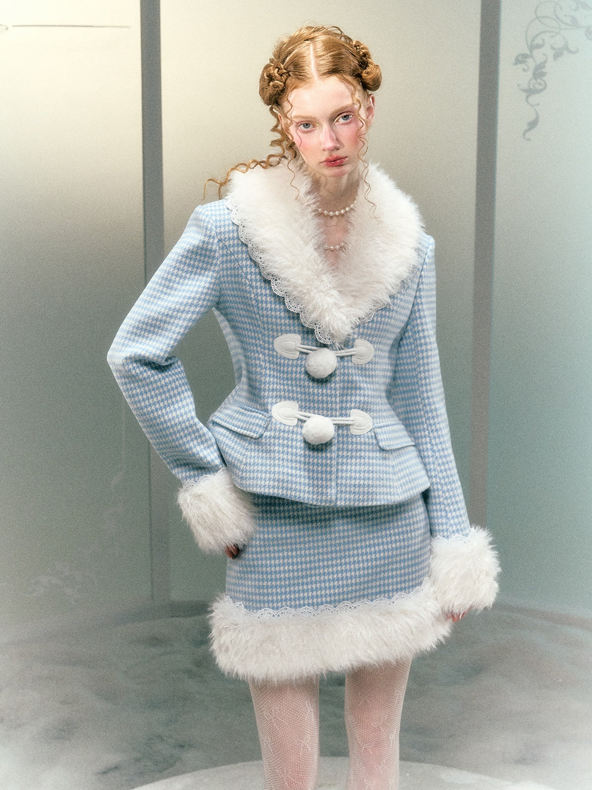 Plaid Lace Fur Collar Waisted Quilted Jacket & Skirt - Narrator