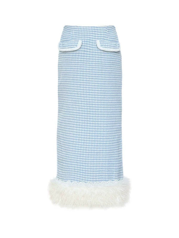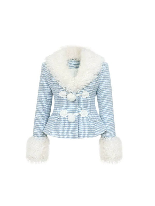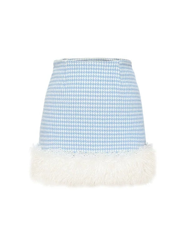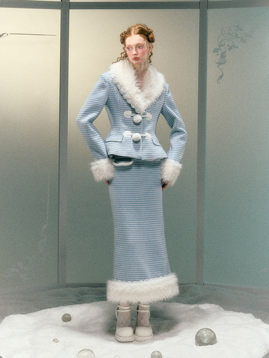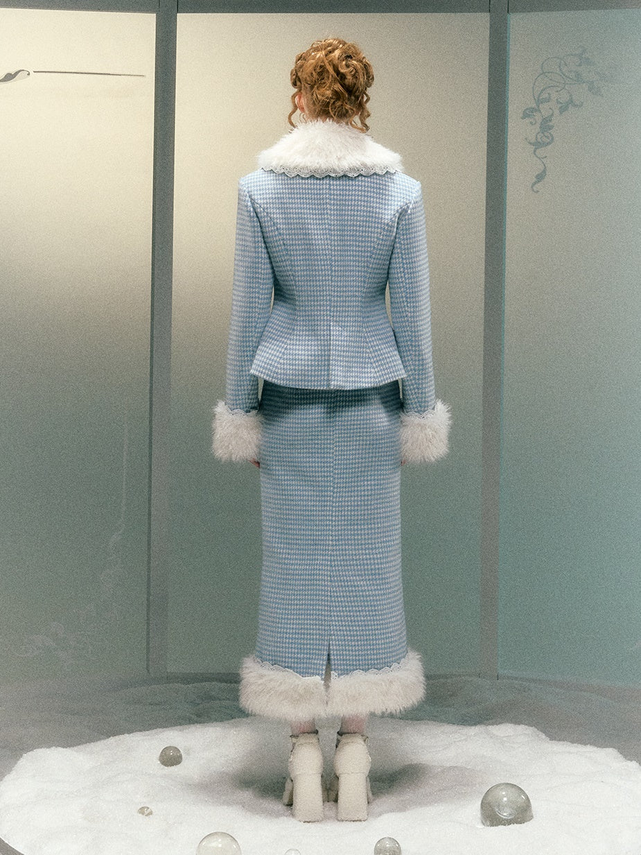 Plaid Lace Fur Collar Waisted Quilted Jacket & Skirt