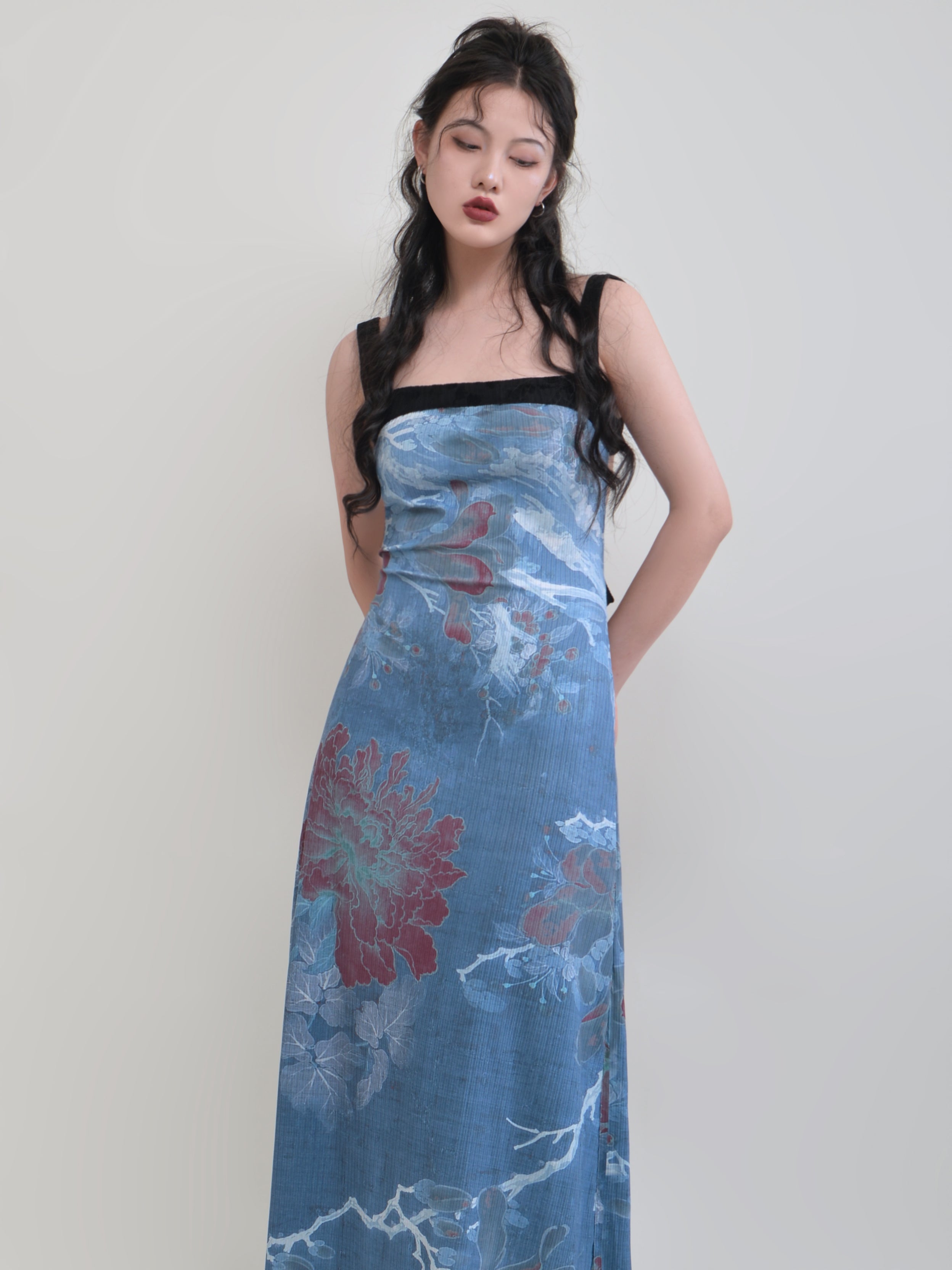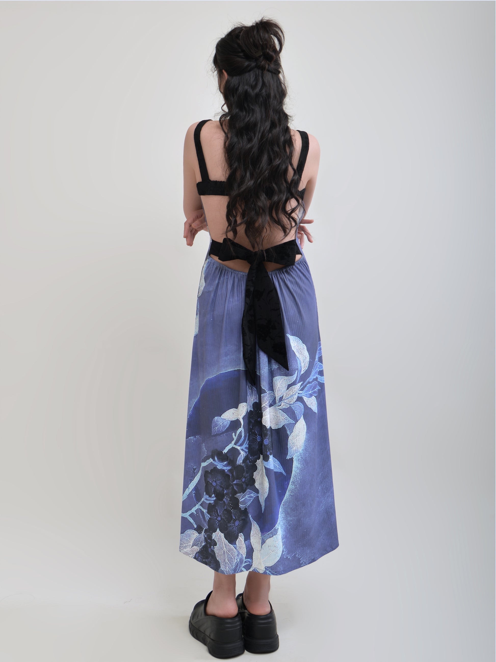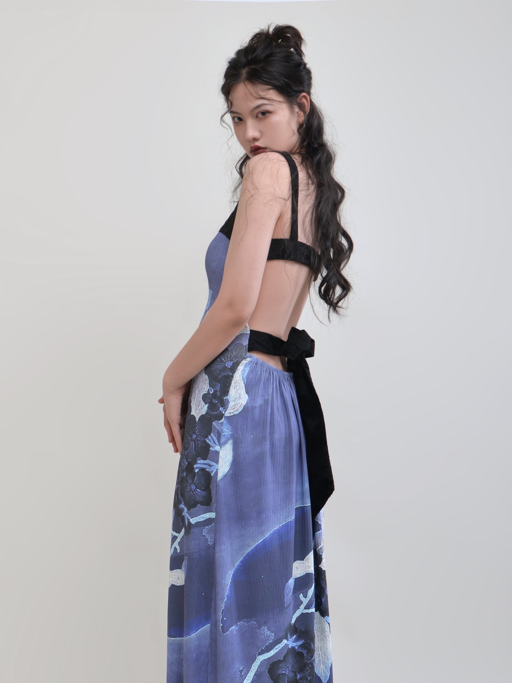 Chinese Style Printing Backless Bow Sleeveless Dress