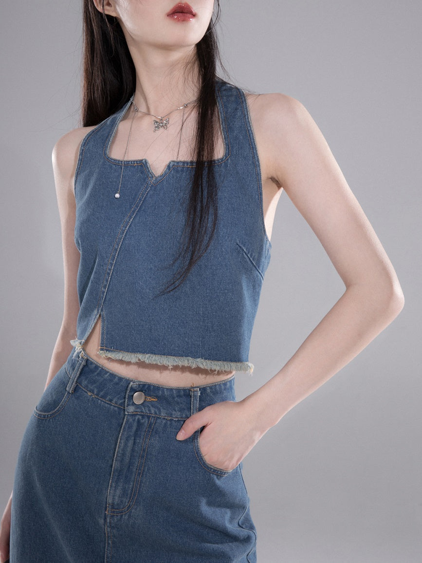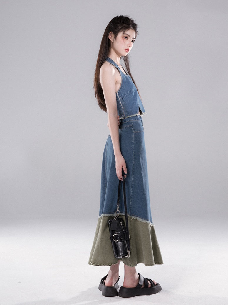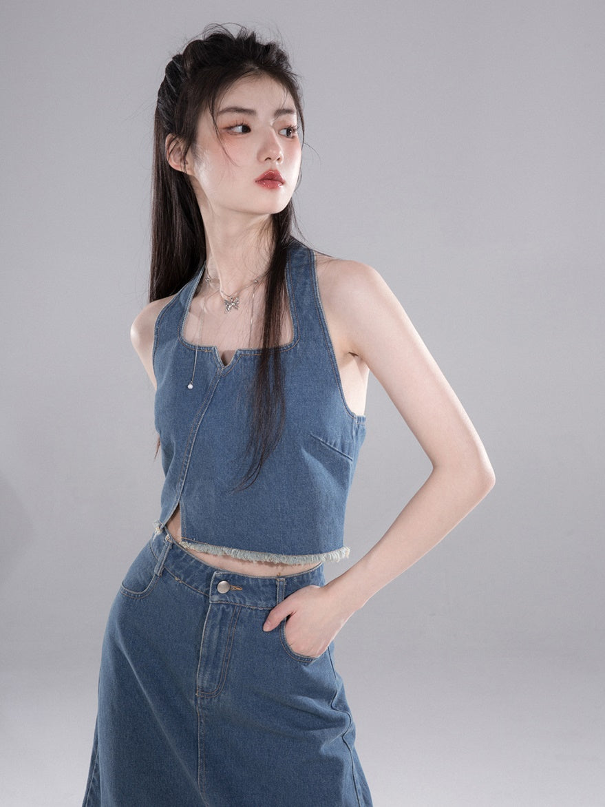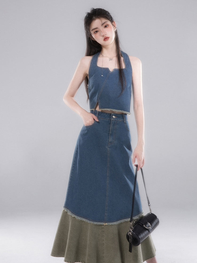 Denim Halter Neck Vest & Fishtail Skirt Set-up