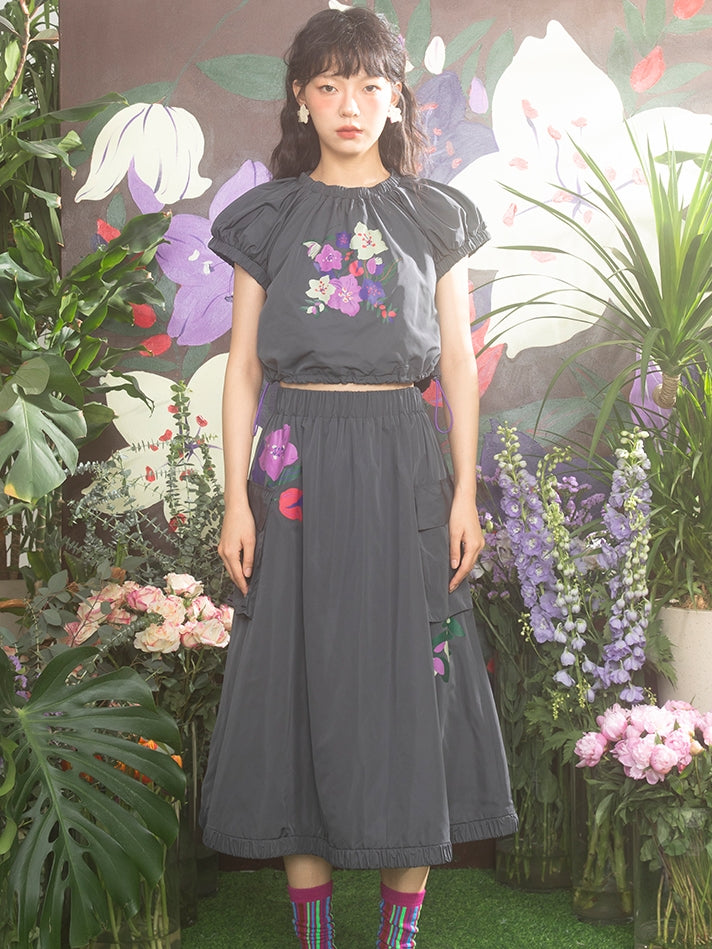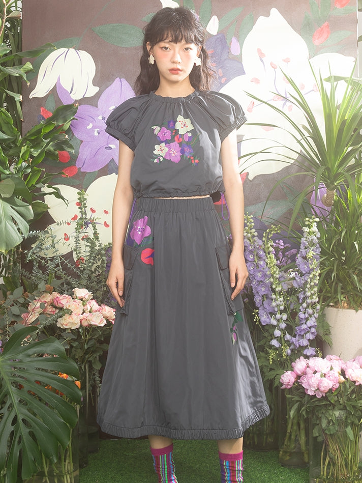 Embroidery Flower Retro Balloon Crumply Blouse&Skirt