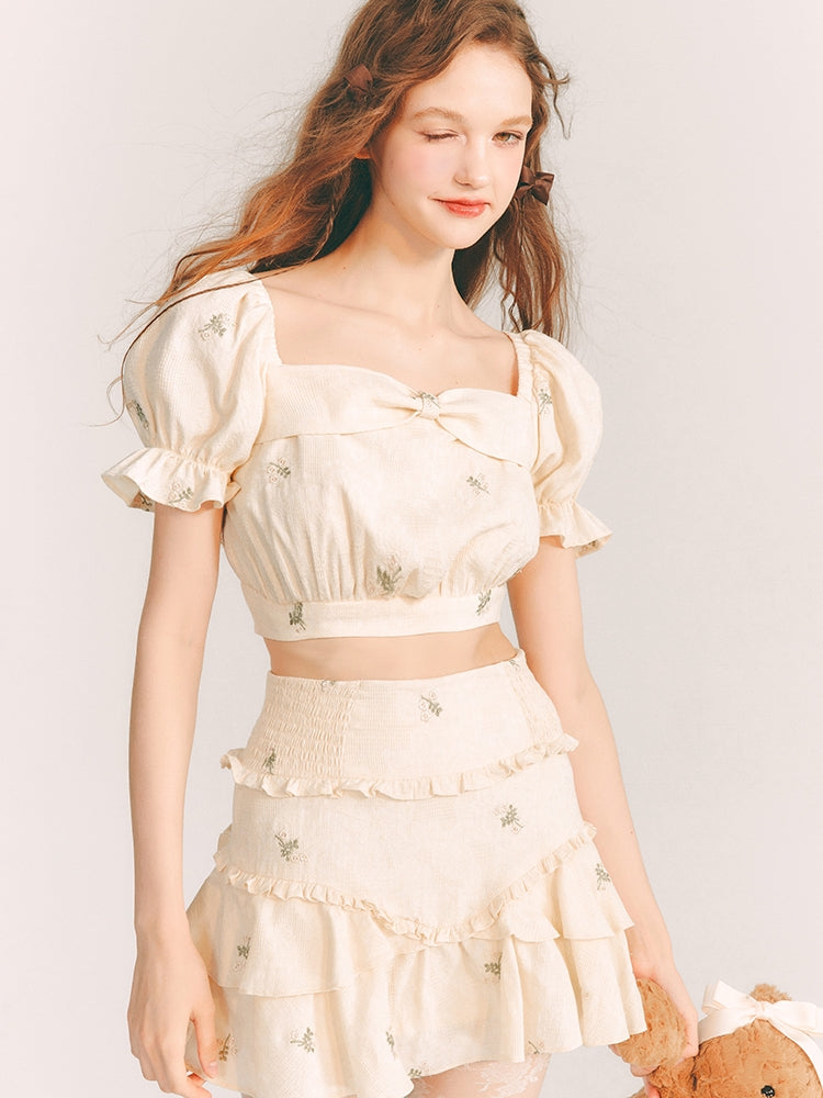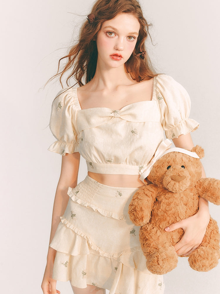 Embroidery Tiered Puff-Sleeve Flower Blouse&Mini-Skirt