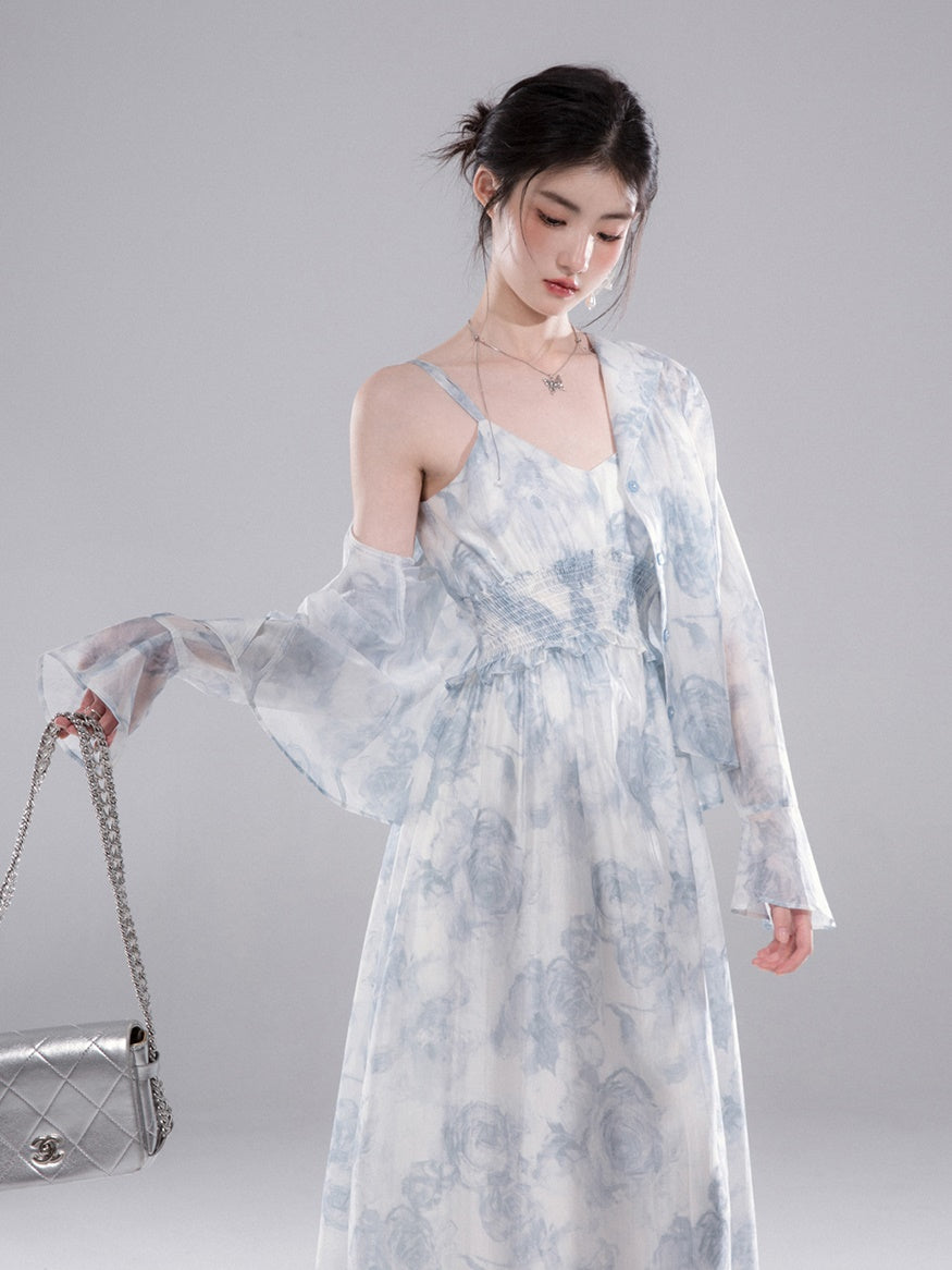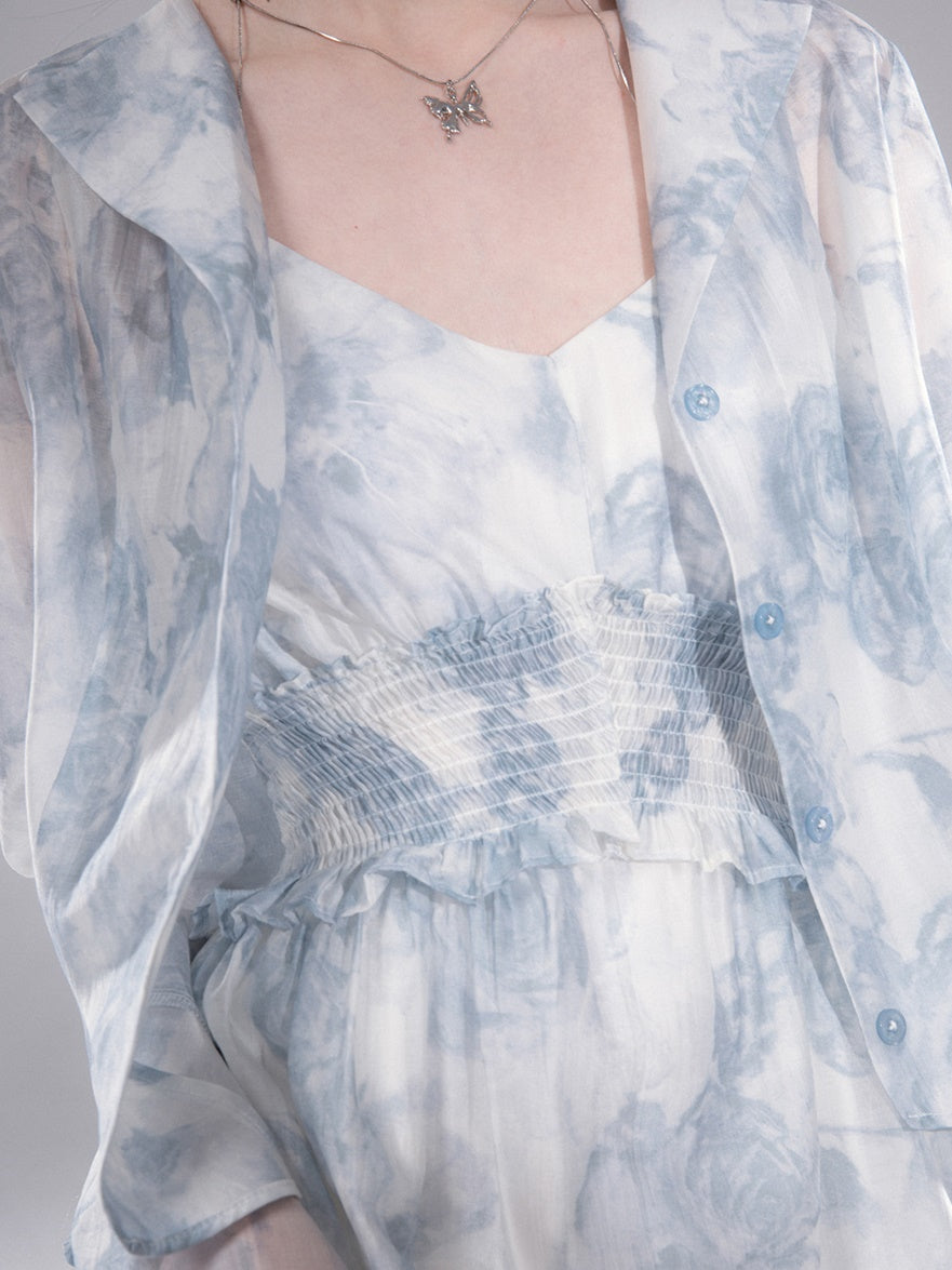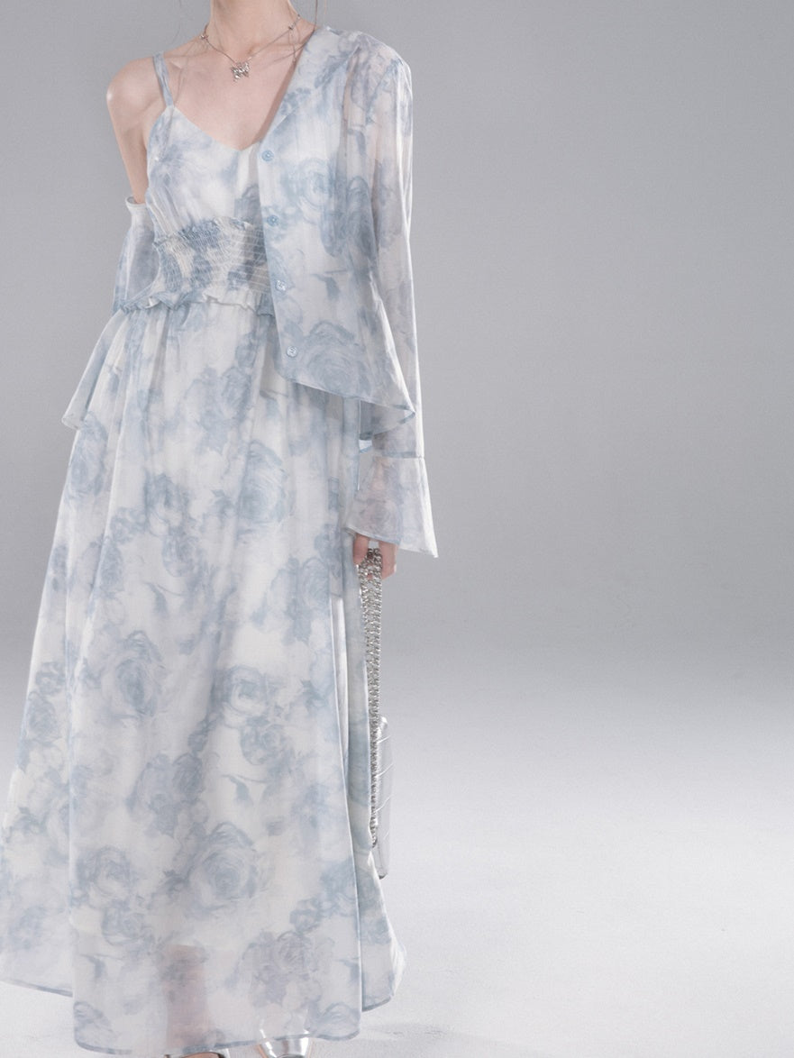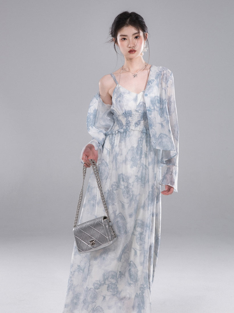 Floral Printed Shirt & Suspender Long One-piece Set-up
