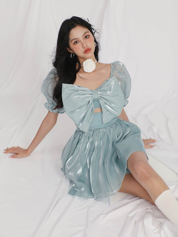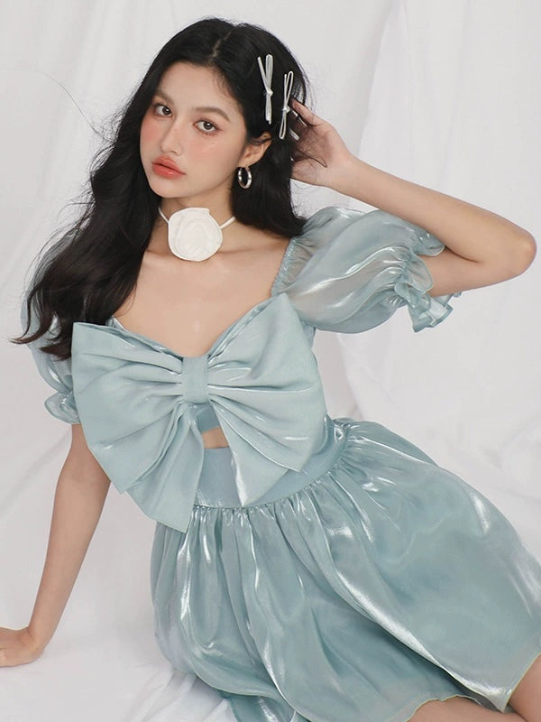 Gauze Puff Sleeve Bow Princess Dress-HEAVEN LIST