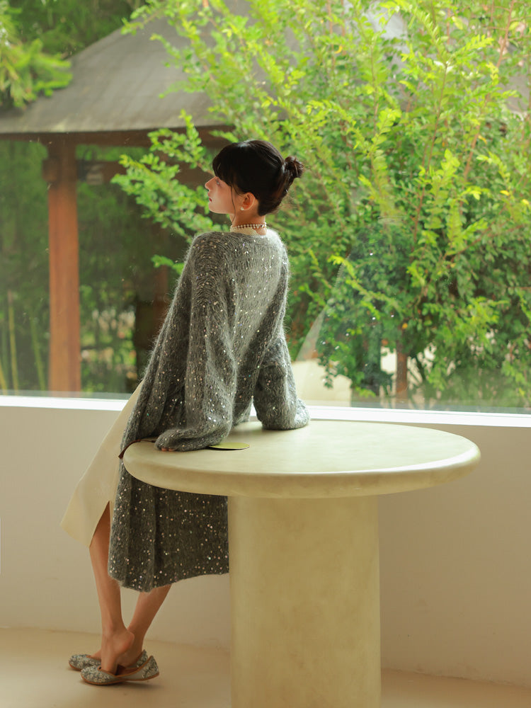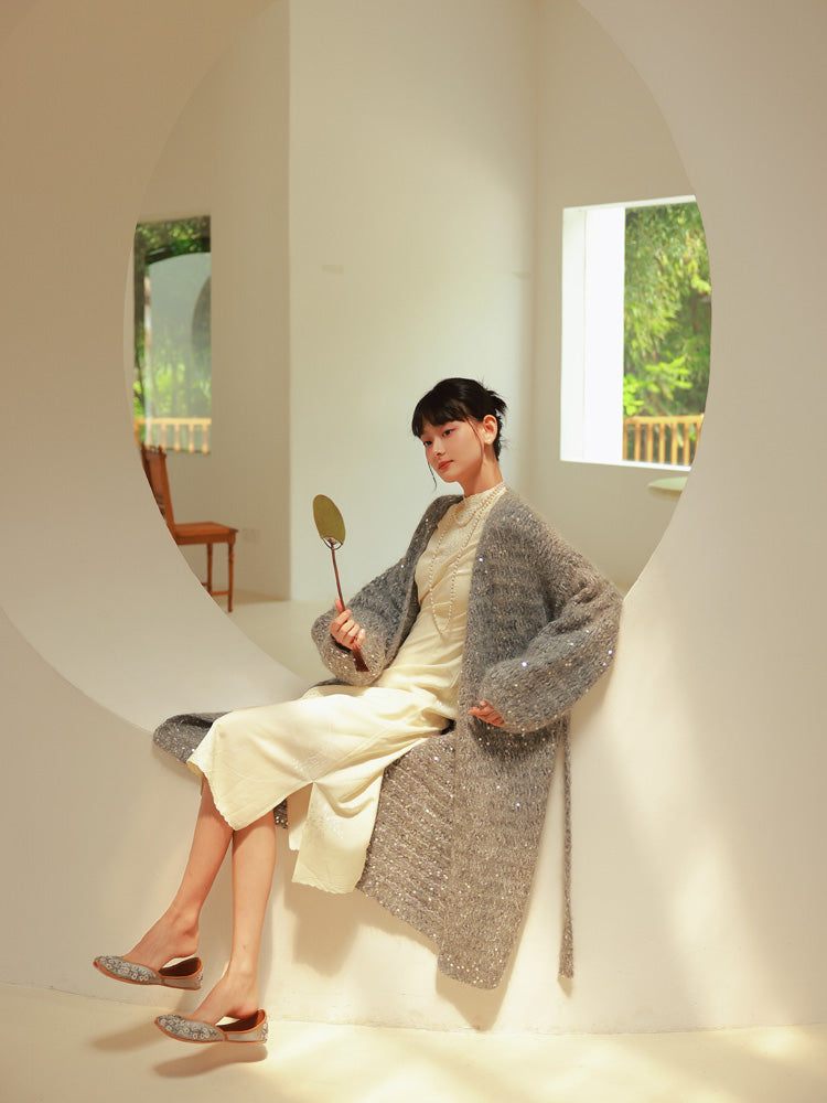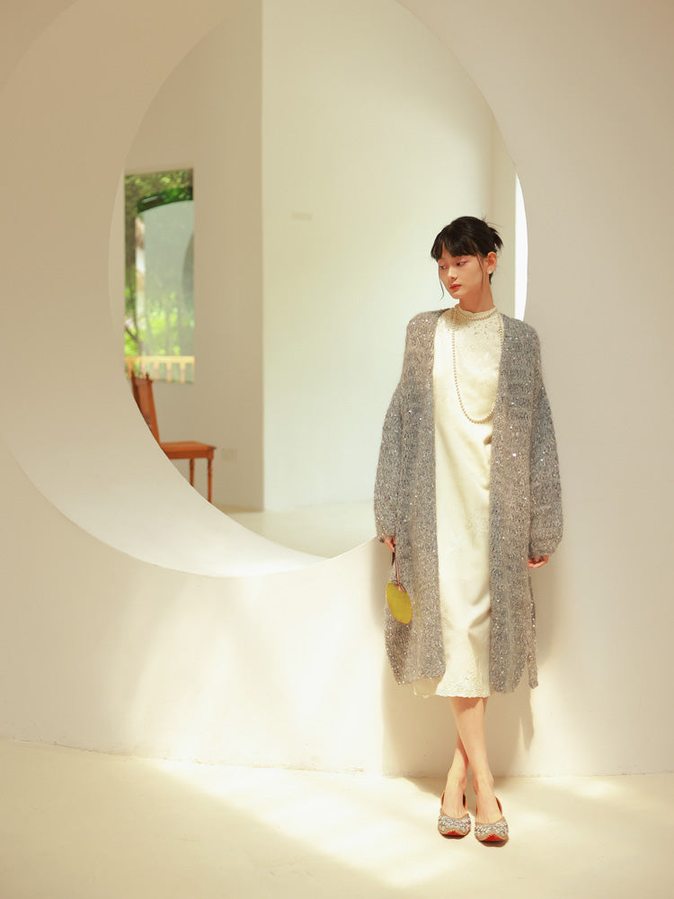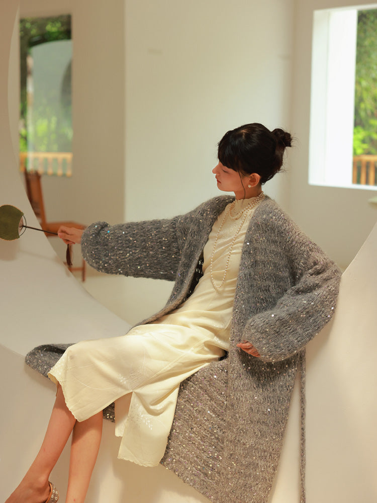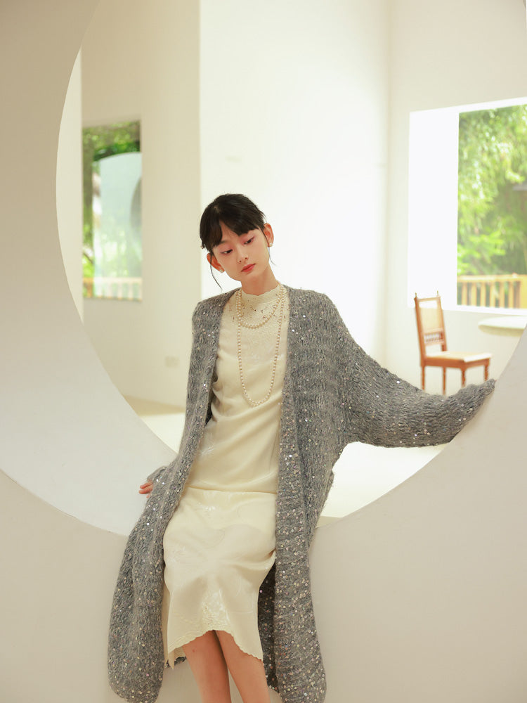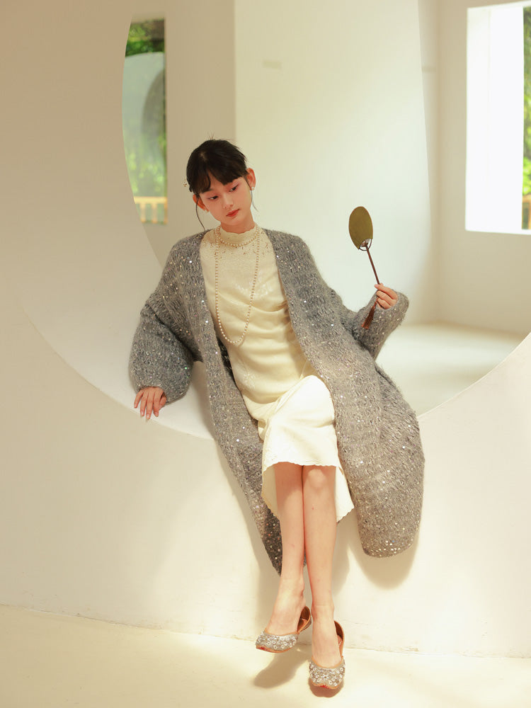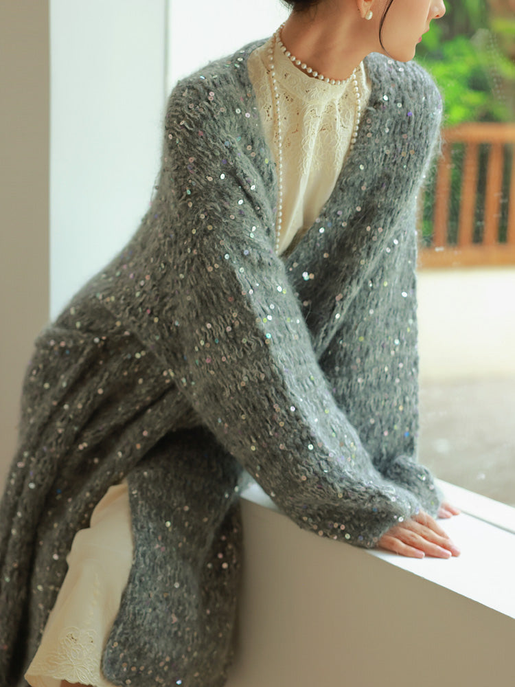 Glossy Loose Knit Effortless Sequins Long-Cardigan