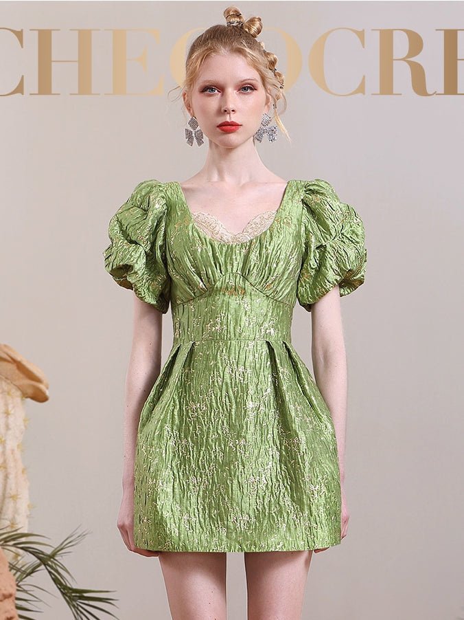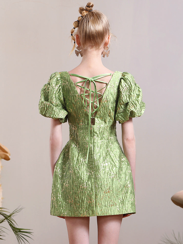 Glossy Unique Wrinkled Puff-sleeve Chic One-piece