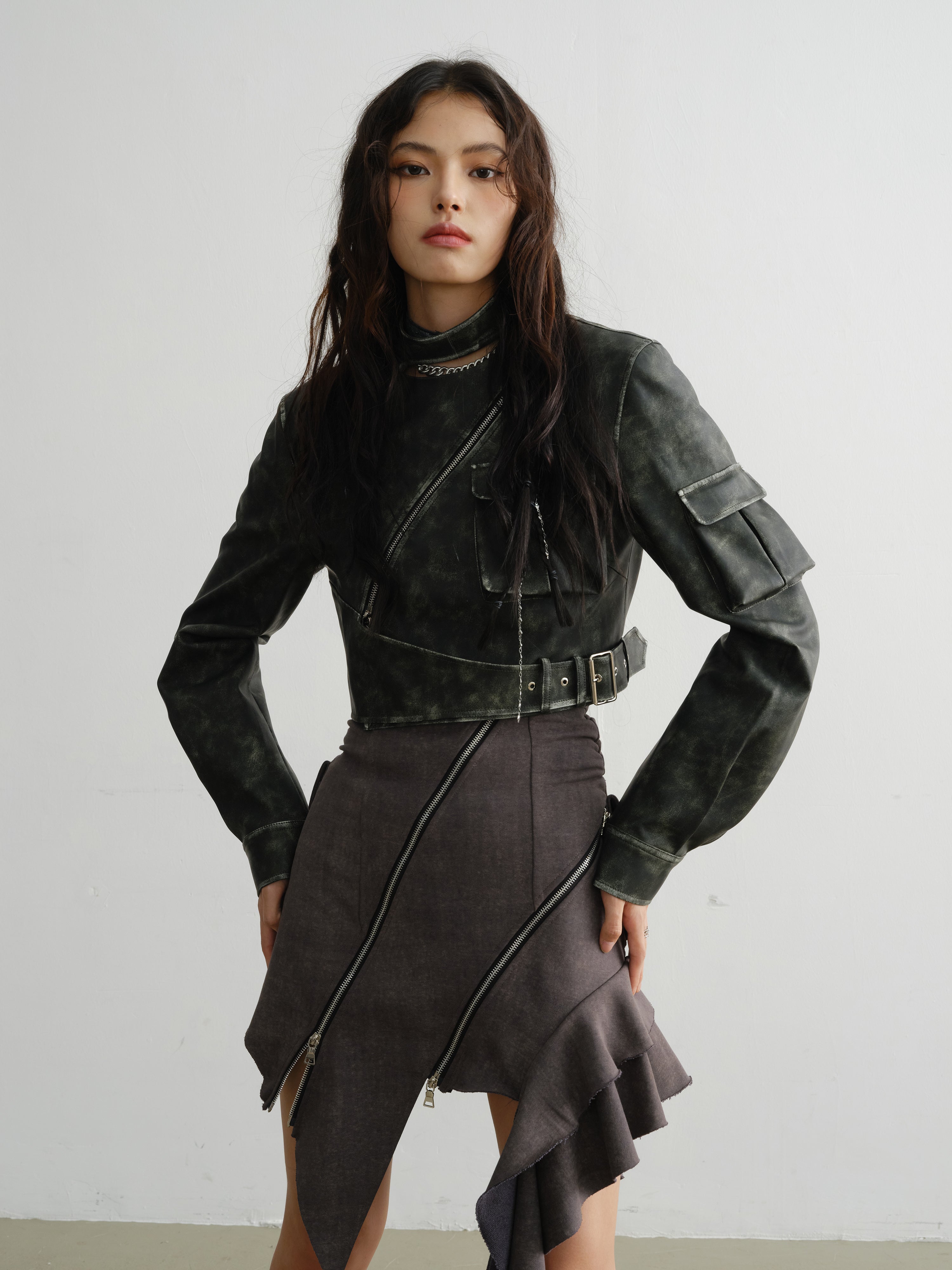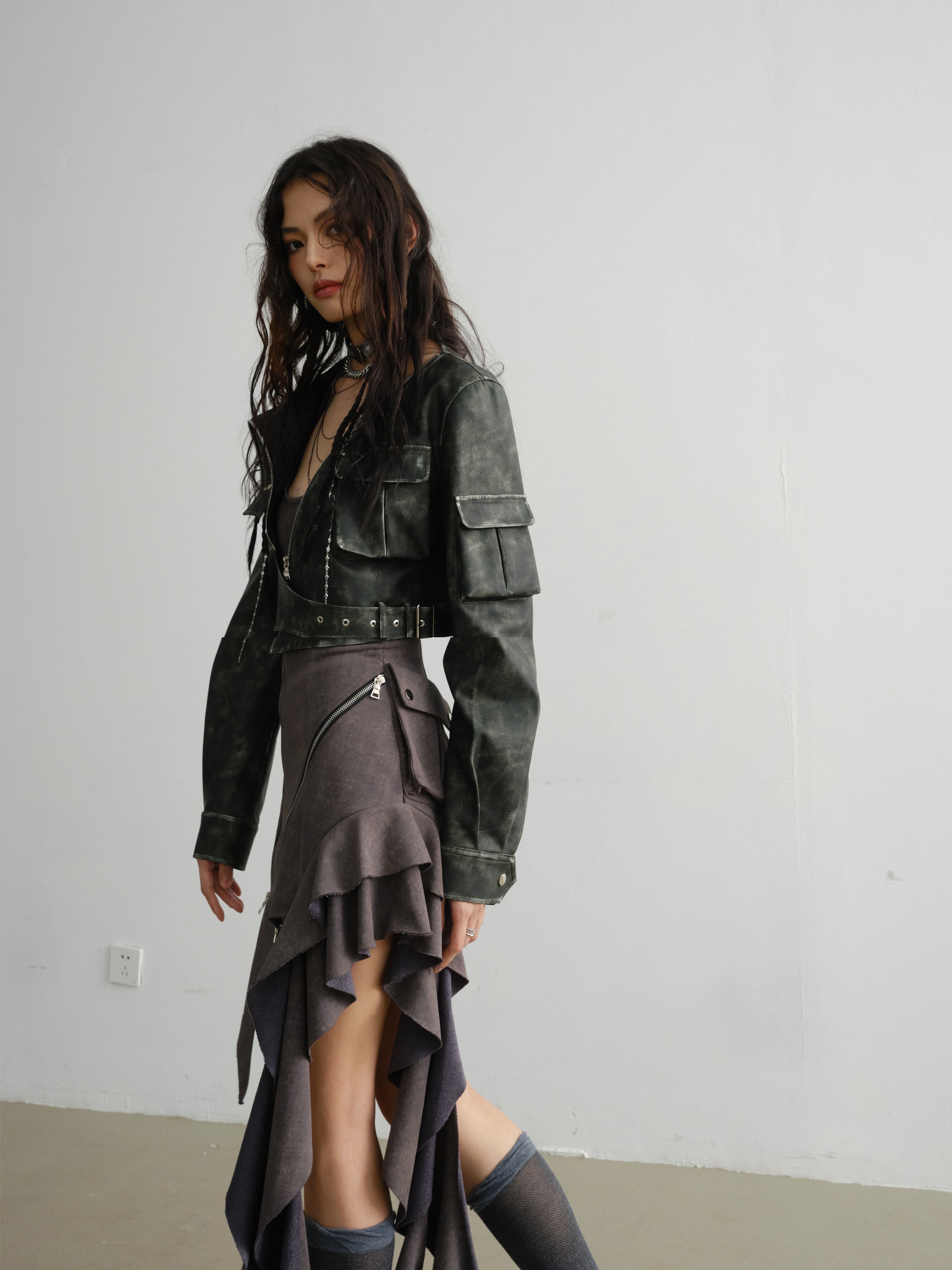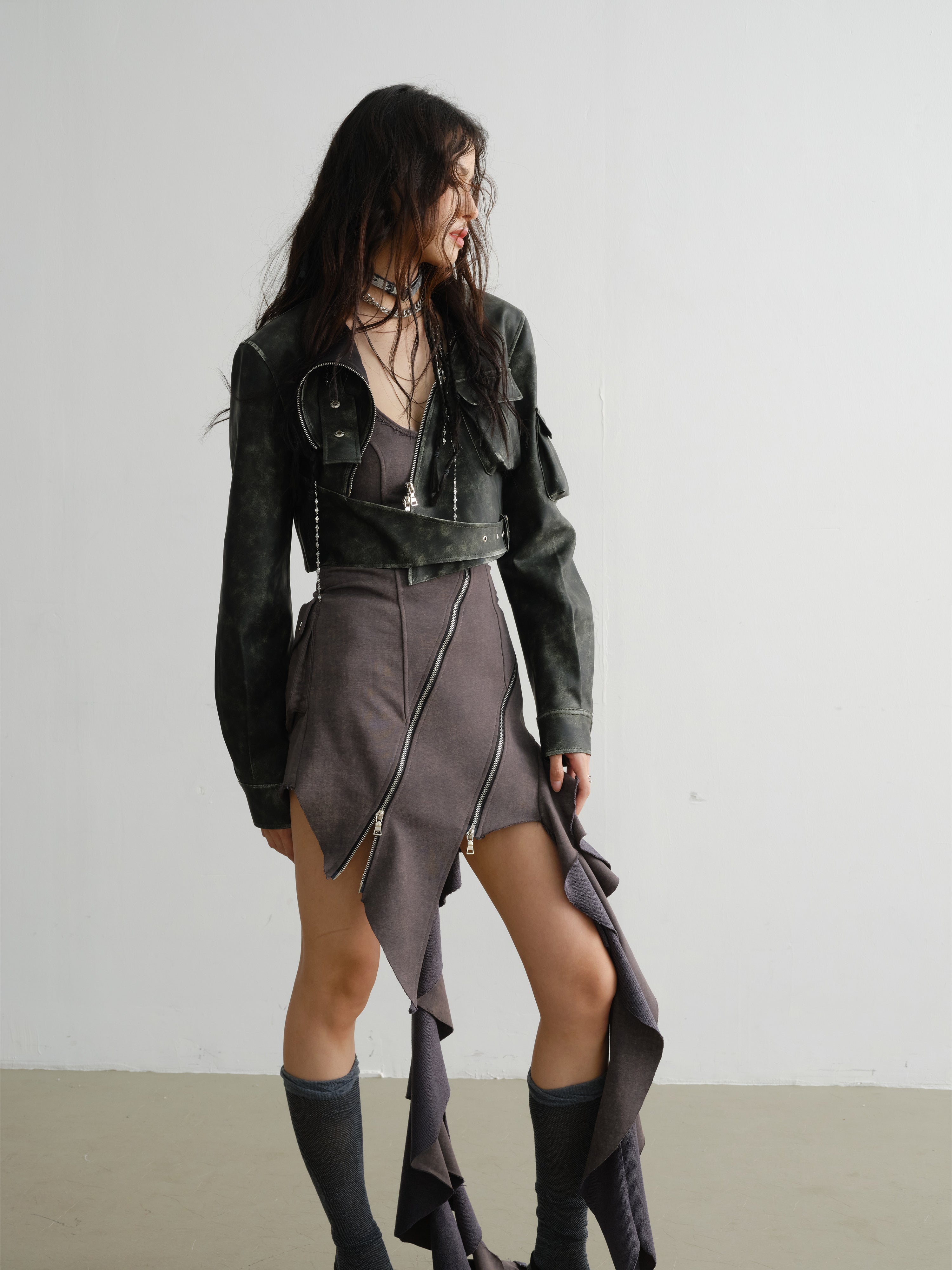 Irregular Zipper Decorated Ruffled Suspender Dress