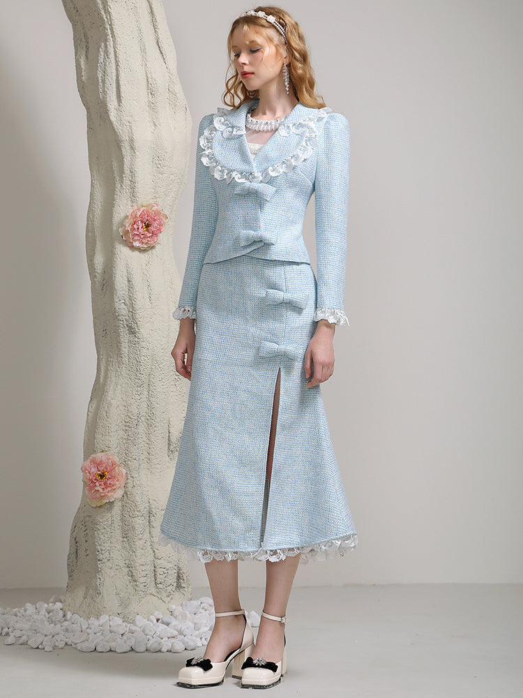 Jacket&Long-Skirt Ribbon Slit Lace Frill Feminine Suit Set-Up