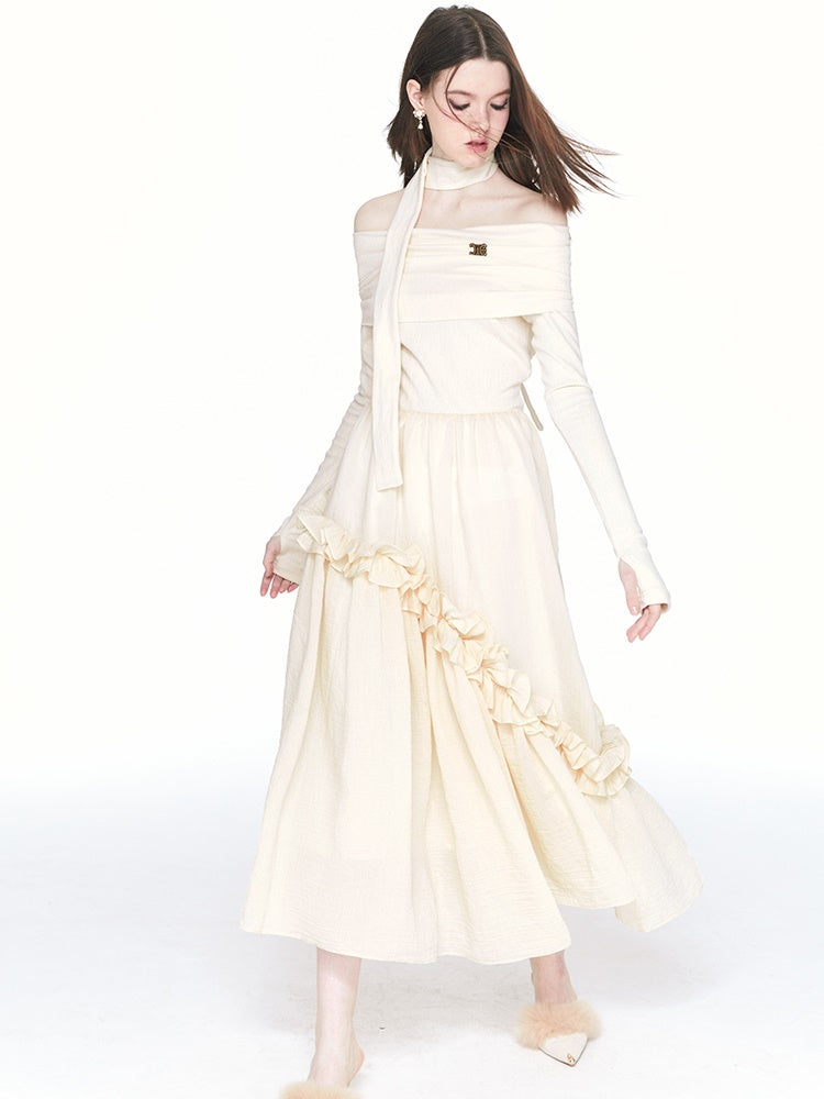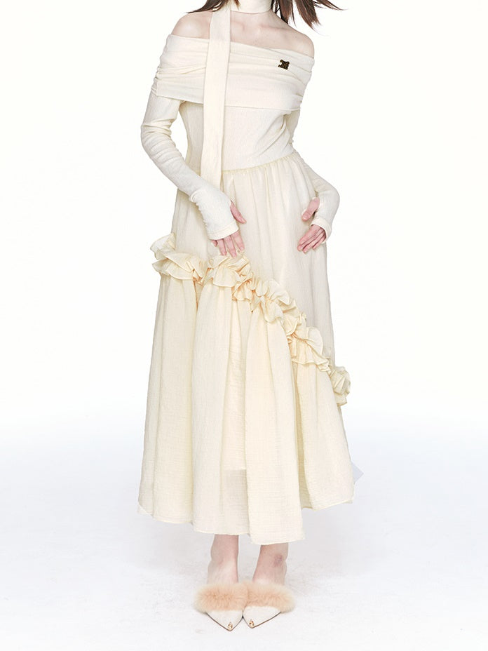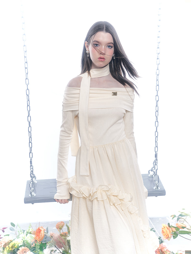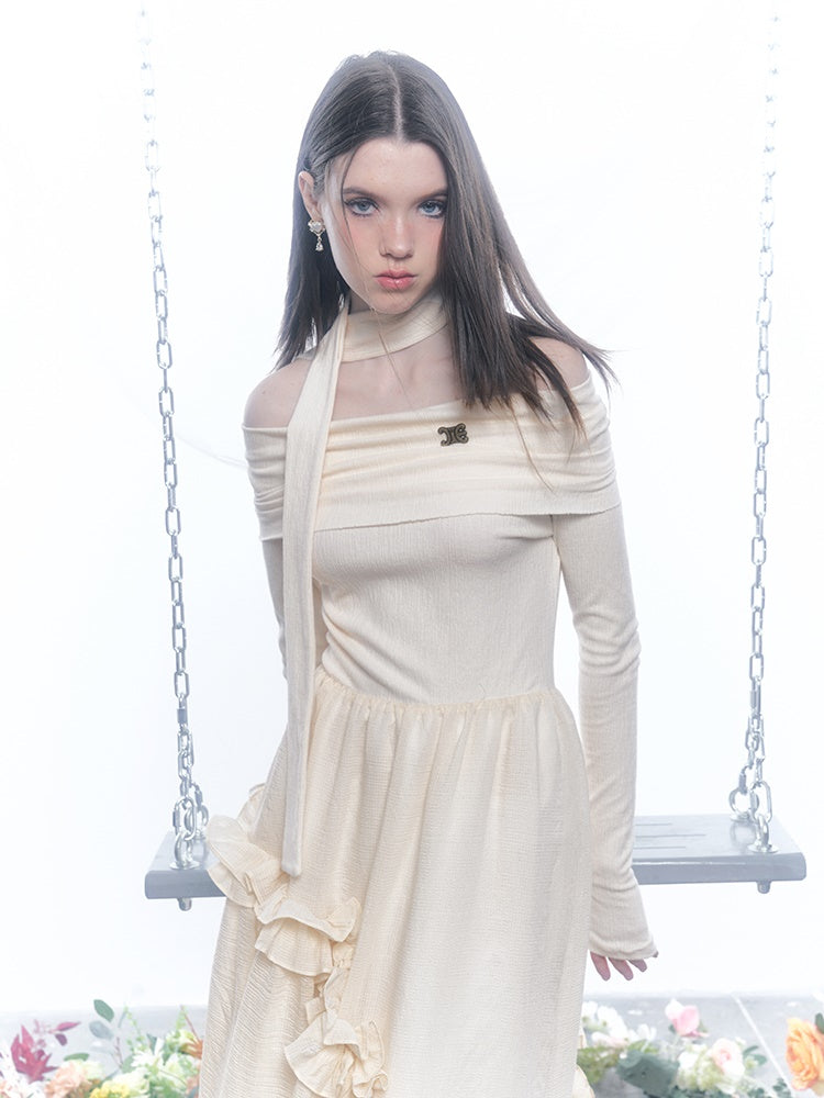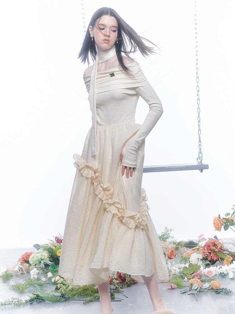 Off-Shoulder Stretch Frill Ruffle Cute One-Piece