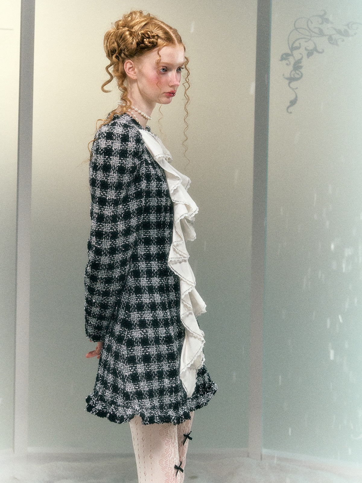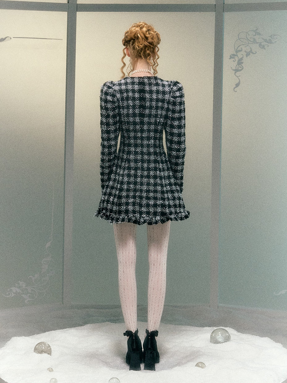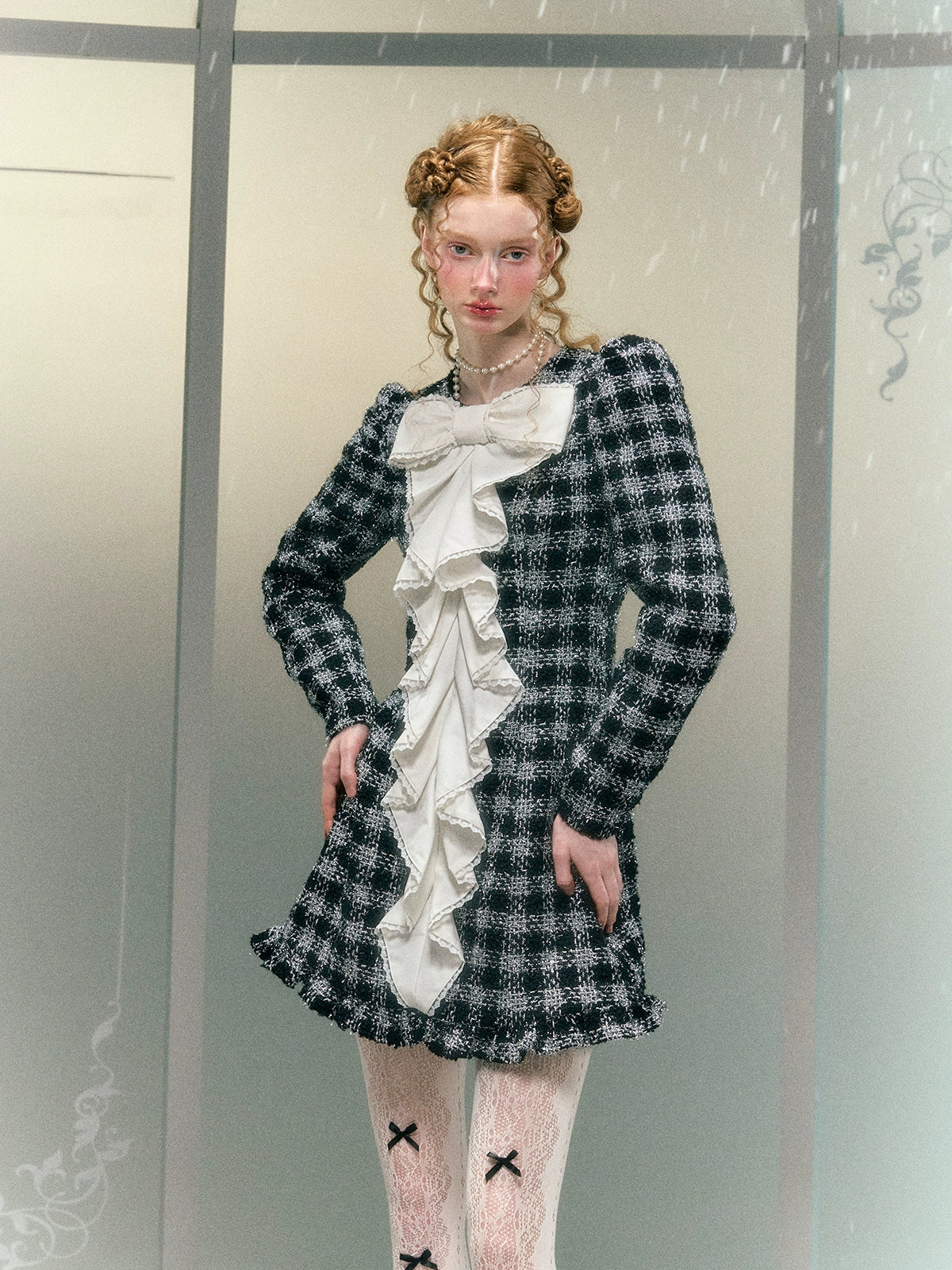 Plaid Oversized Bow Lace Puff Sleeve Tight Dress - Narrator
