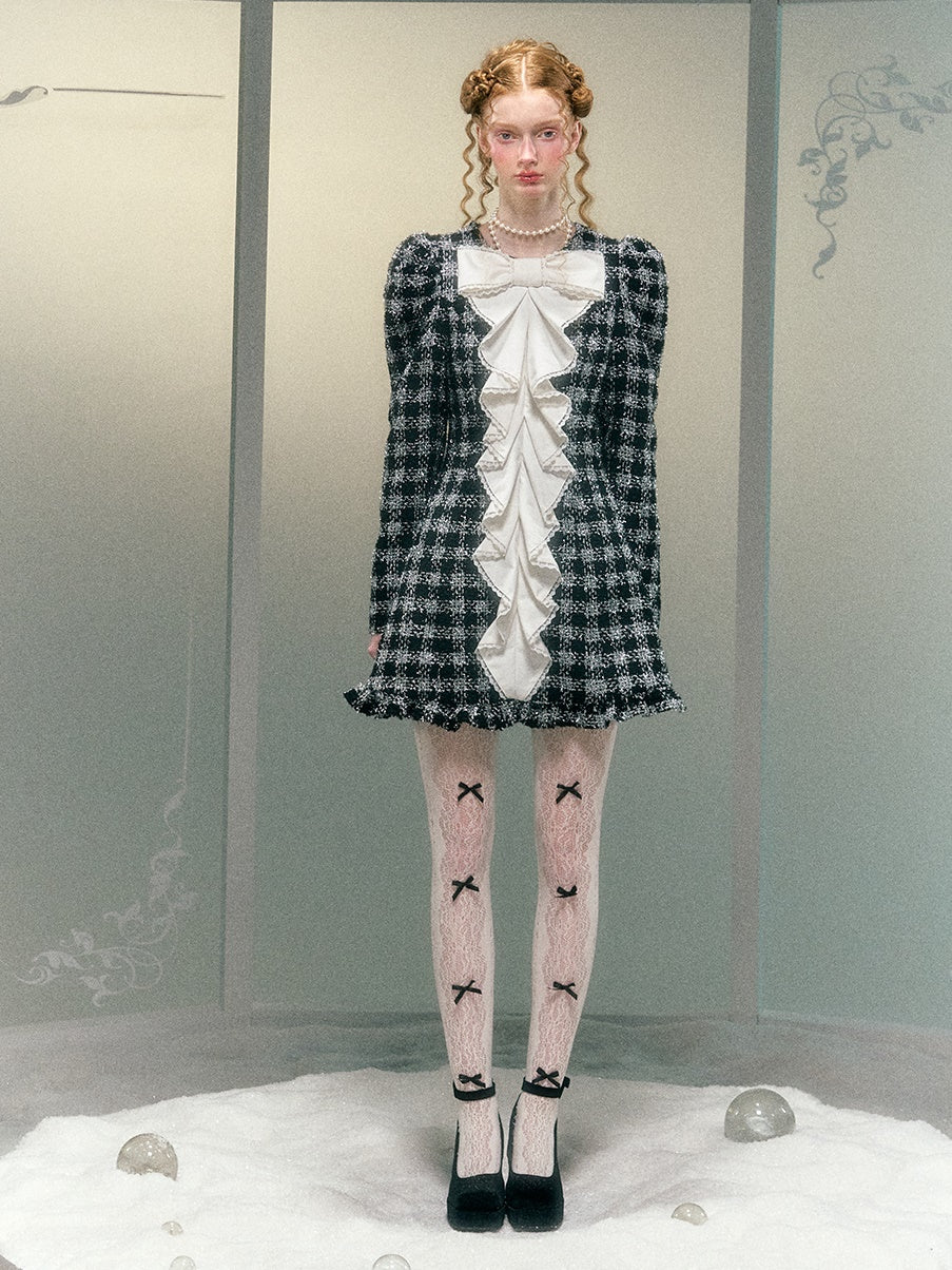 Plaid Oversized Bow Lace Puff Sleeve Tight Dress