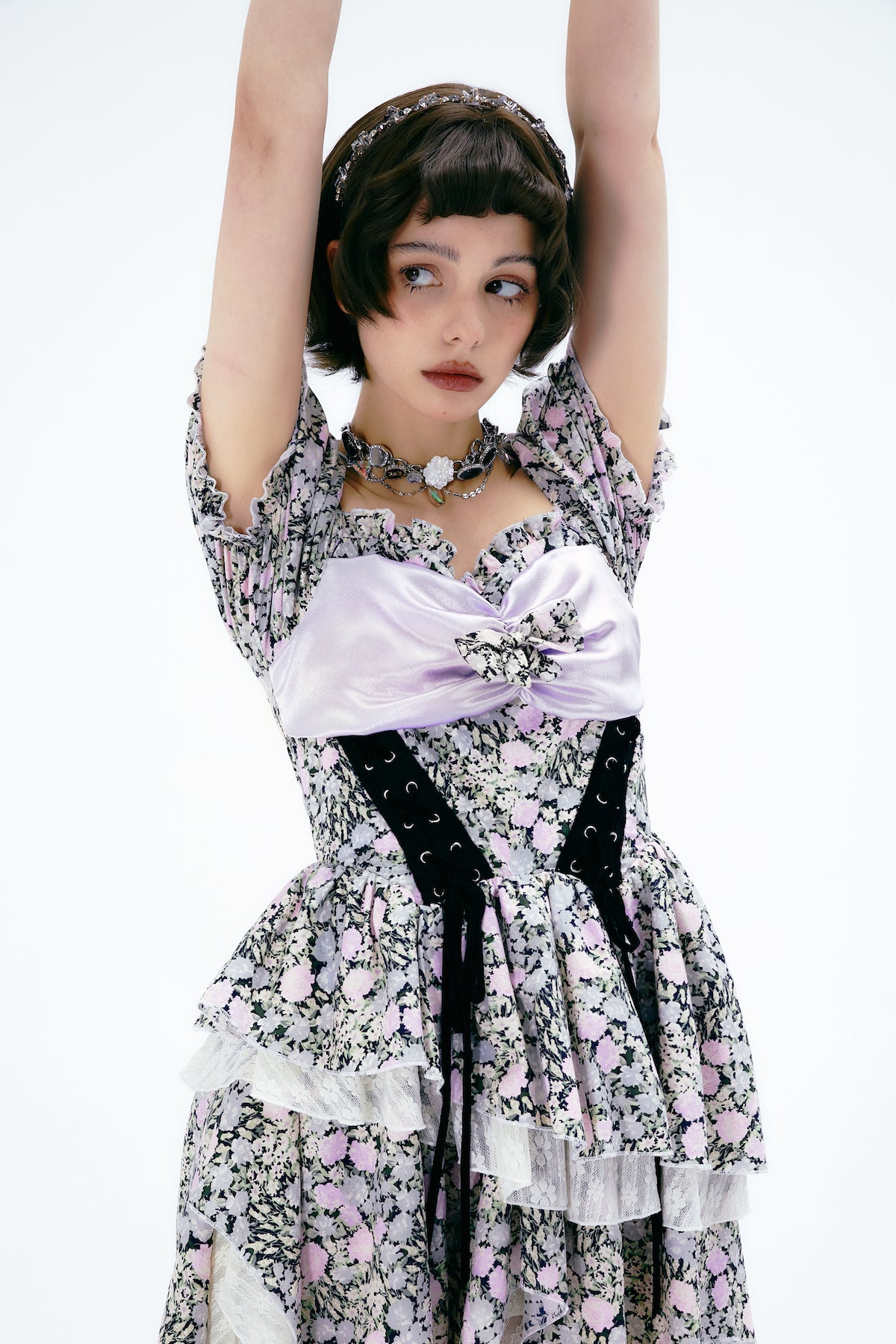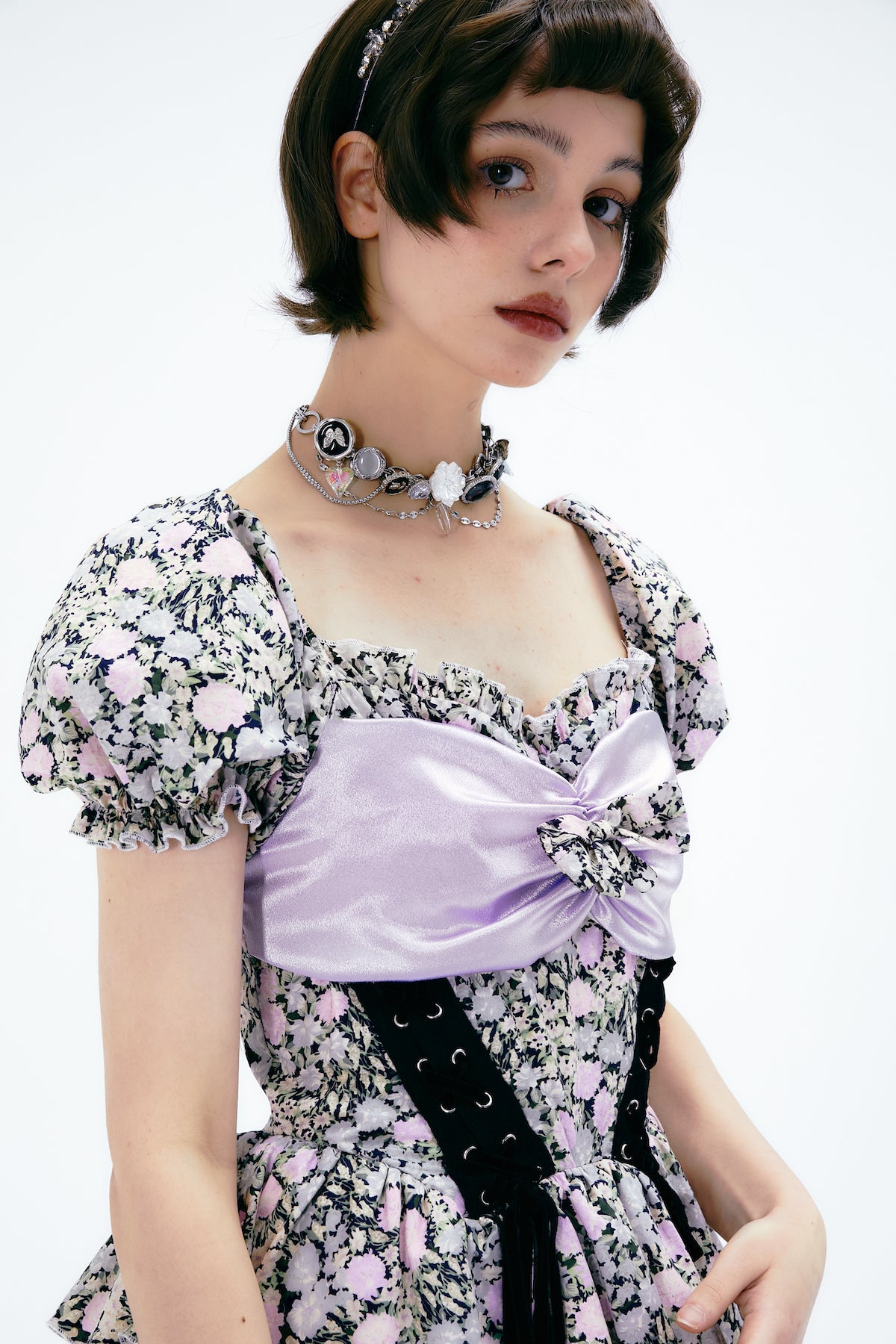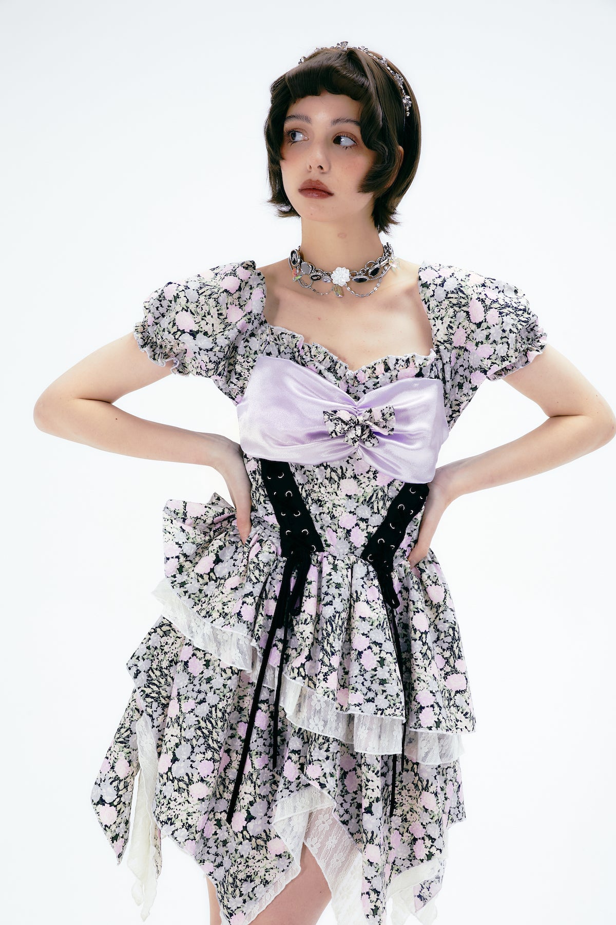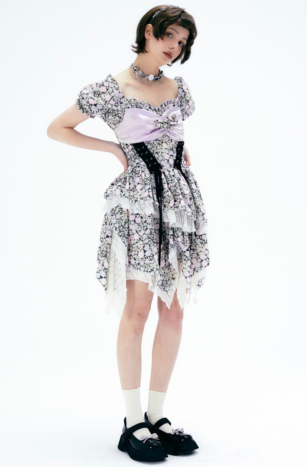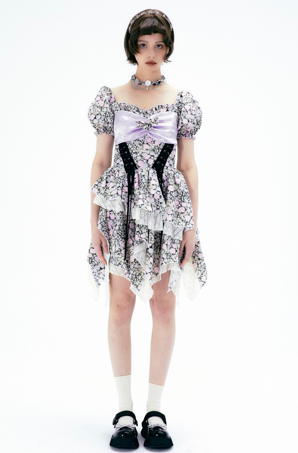 Puff-sleeve Ribbon Flower Lace Sweet Princess One-Piece