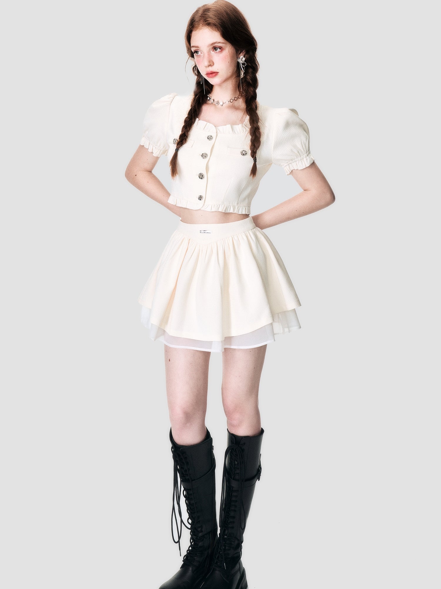 Puff-Sleeve Tiered Frill Lace Ciffon Blouse&Mini-Skirt