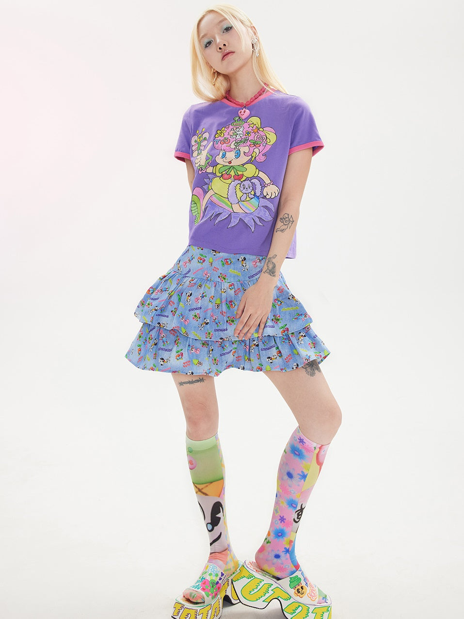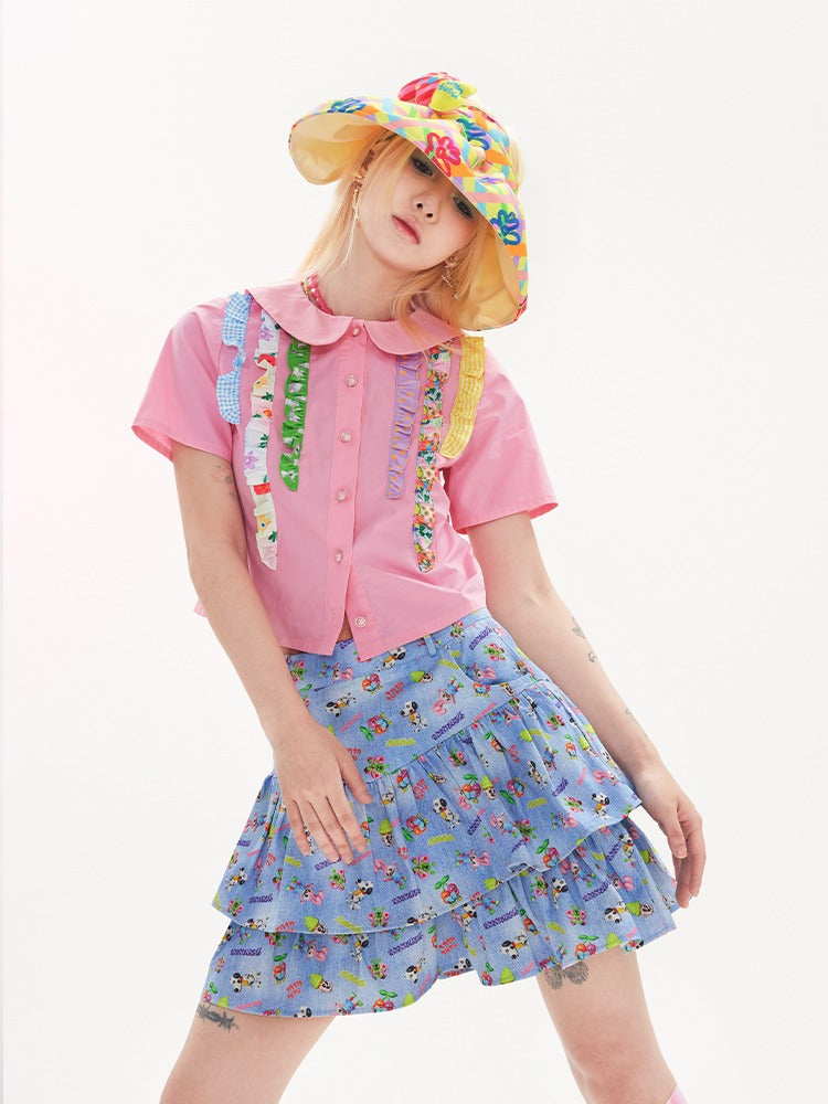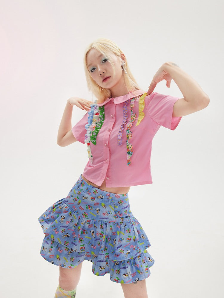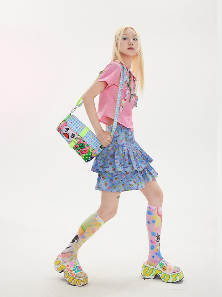 Retro Denim Printed Cake Skirt