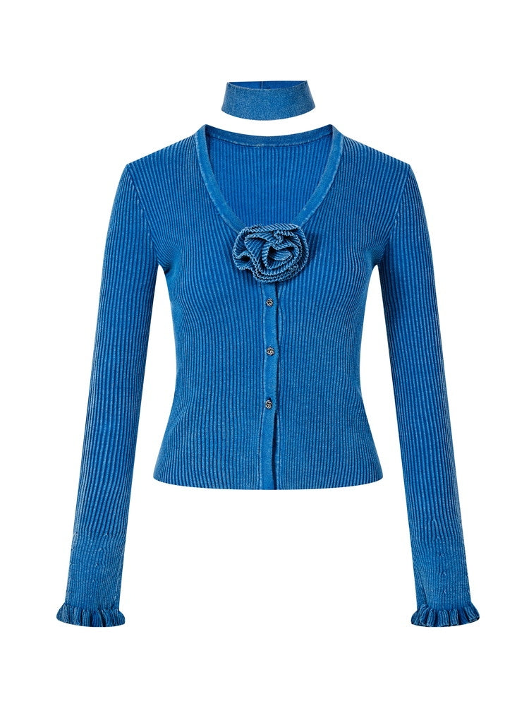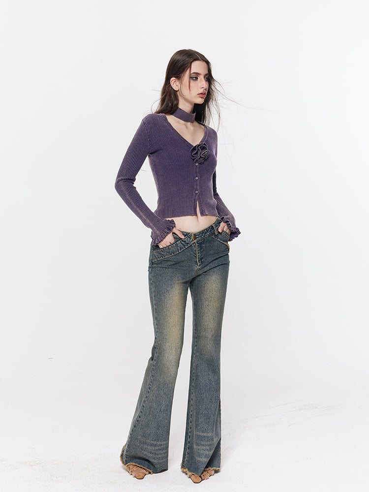 Rose Corsage Slim Retro Plain Knit&Denim-Pants