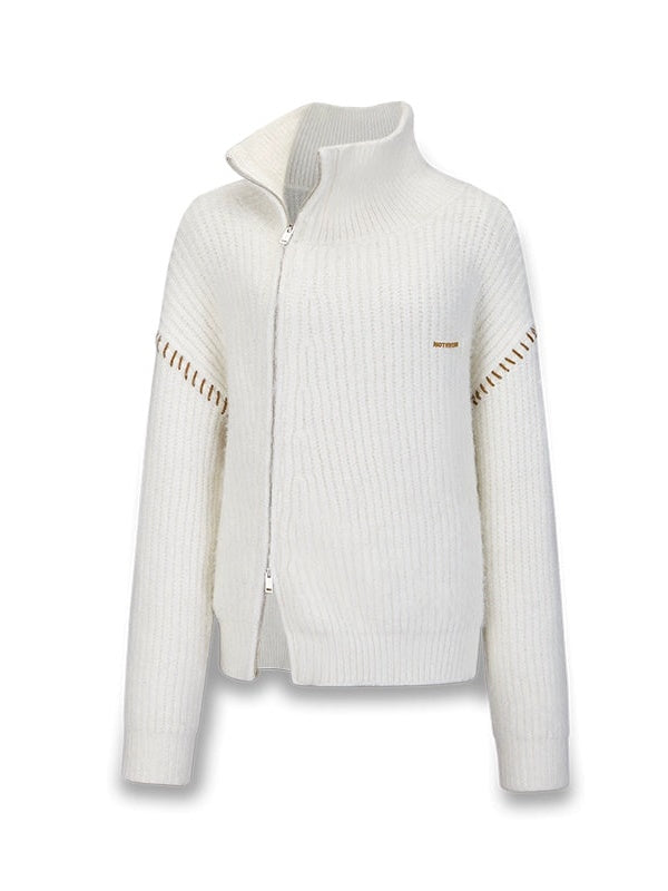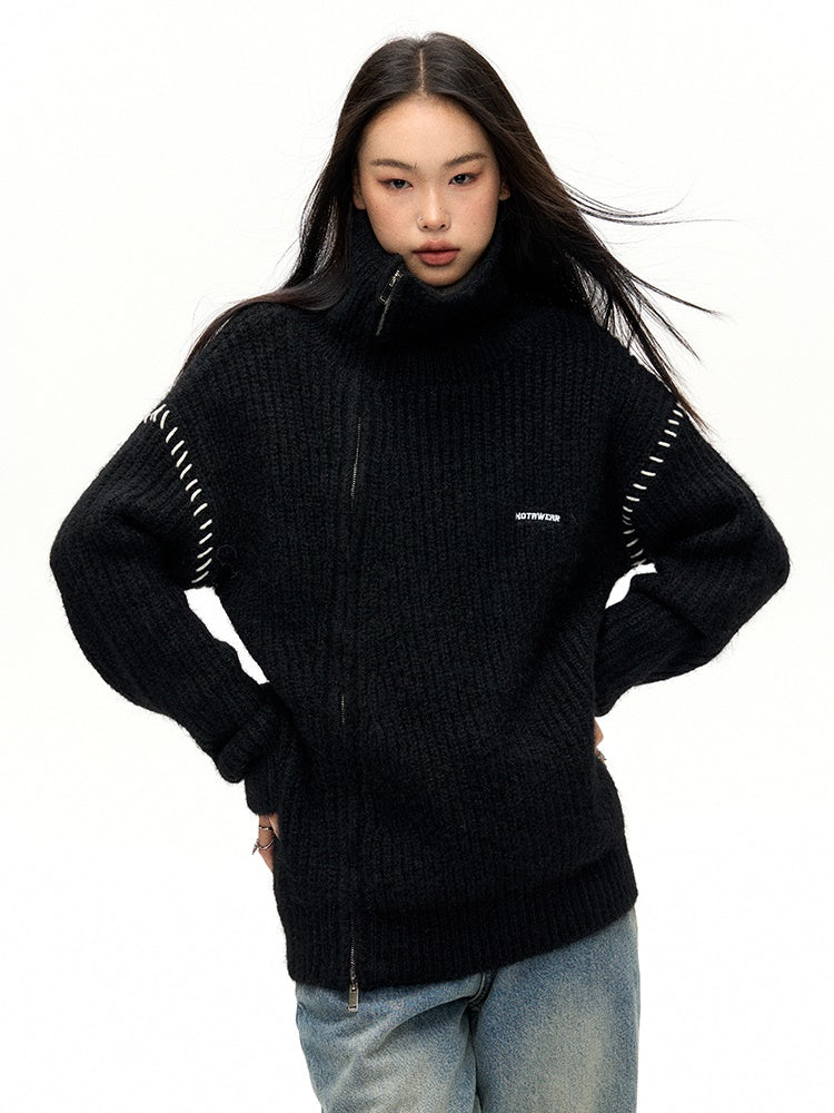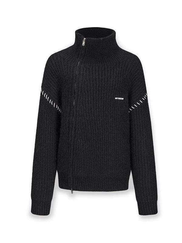 Slant ZIP-Up High Neck Knitted Jacket
