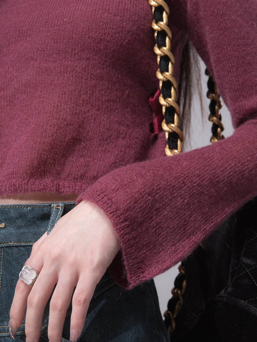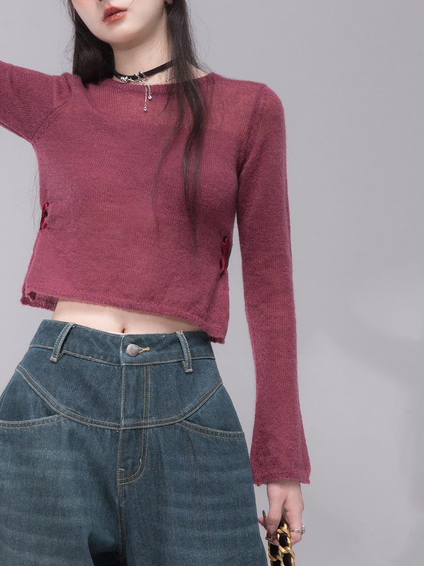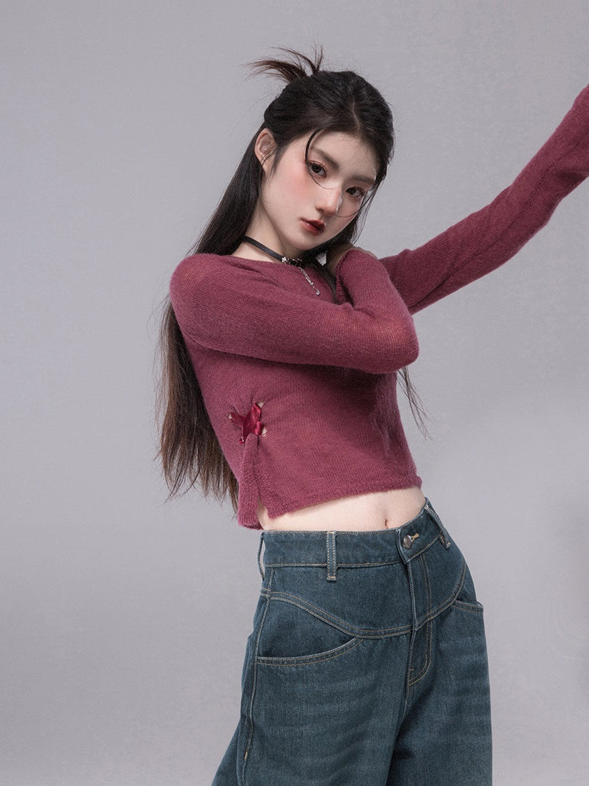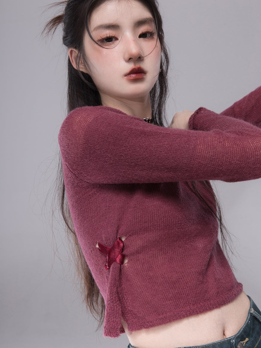 Slit Ribbon Cropped Knit Top